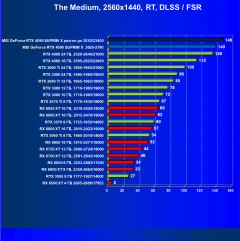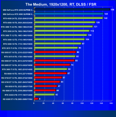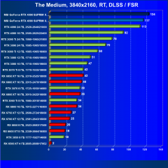 Рейтинг составлен по 9 тестам, в которых используется технология трассировки лучей и одновременно технология Nvidia DLSS или AMD FSR. Этот рейтинг нормирован по самому слабому ускорителю в данной группе — Radeon RX 6500 XT (то есть сочетание скорости и функций Radeon RX 6500 XT приняты за 100%).