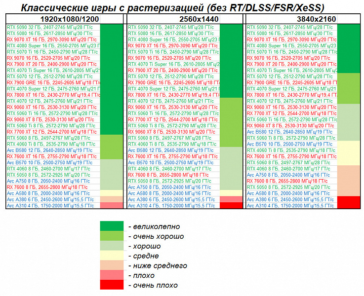 Рейтинг составлен по всем тестам без использования технологий трассировки лучей. Этот рейтинг нормирован по наиболее слабому ускорителю из группы карт — Arc A310 (то есть сочетание скорости и функций Arc A310 приняты за 100%). Рейтинги ведутся по 30 регулярно исследуемым нами акселераторам в рамках проекта Лучшая видеокарта месяца. В данном случае из общего списка выбрана группа карт для анализа, в которую входят GeForce RTX 5060 Ti и его конкуренты.