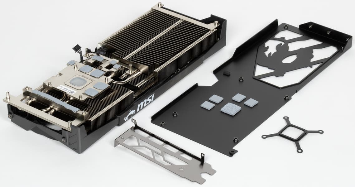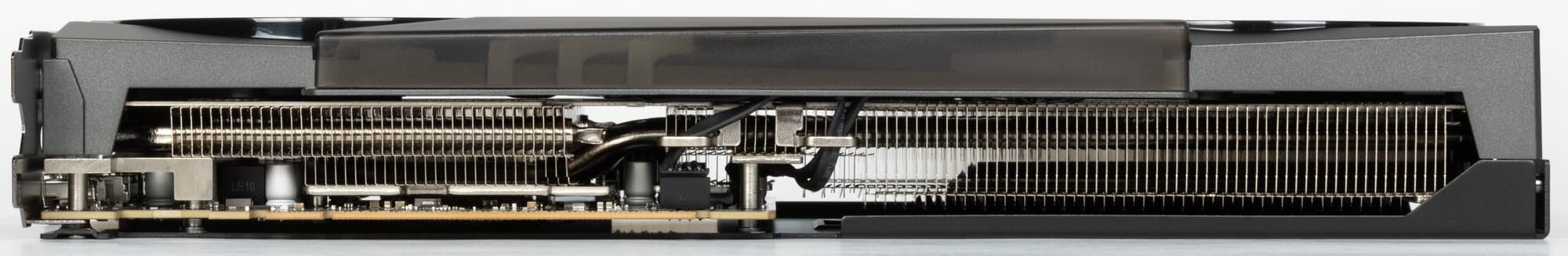 Для охлаждения преобразователей питания VRM имеются свои подошвы на радиаторе. Задняя пластина участвует в охлаждении микросхем памяти на оборотной стороне, а также охлаждает PCB в области GPU, а также служит элементом защиты PCB.