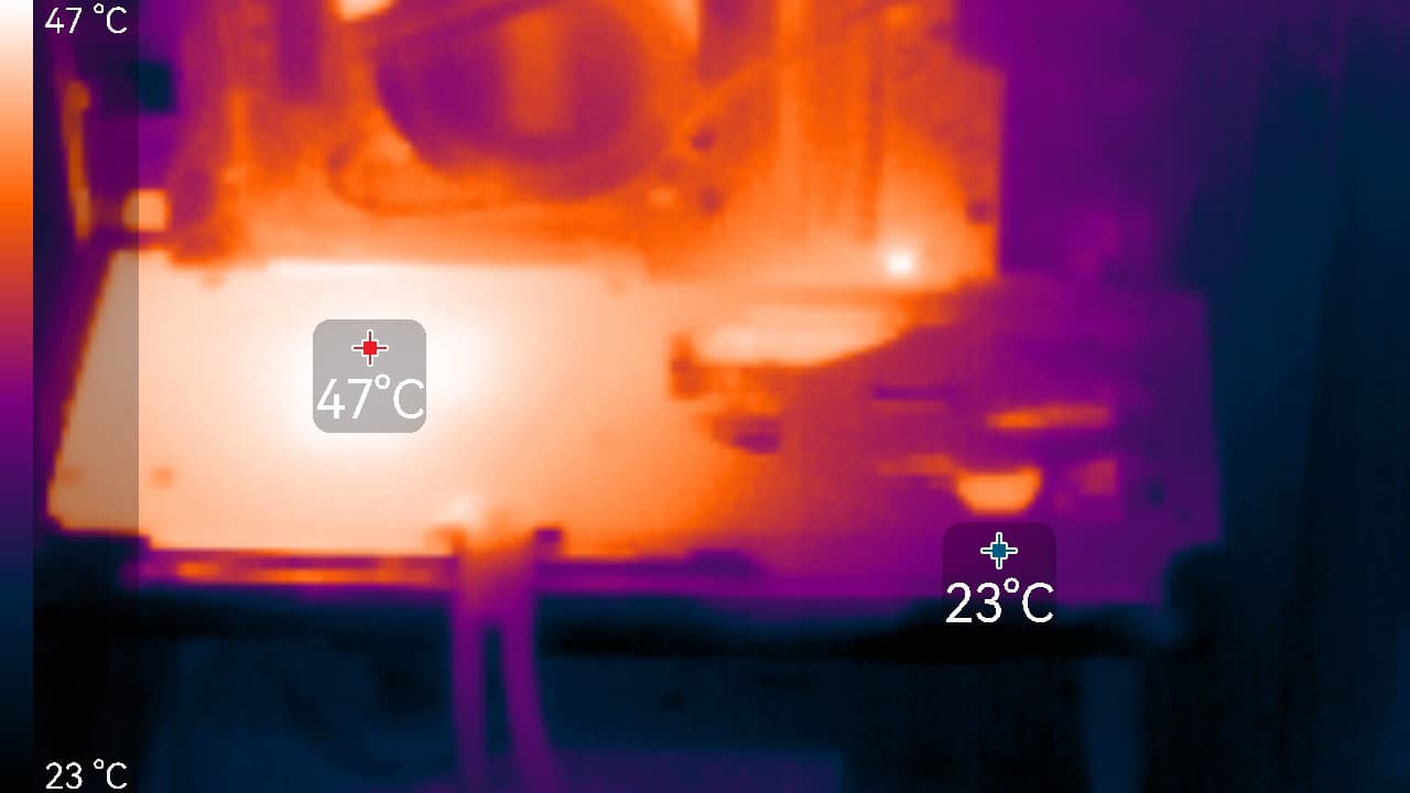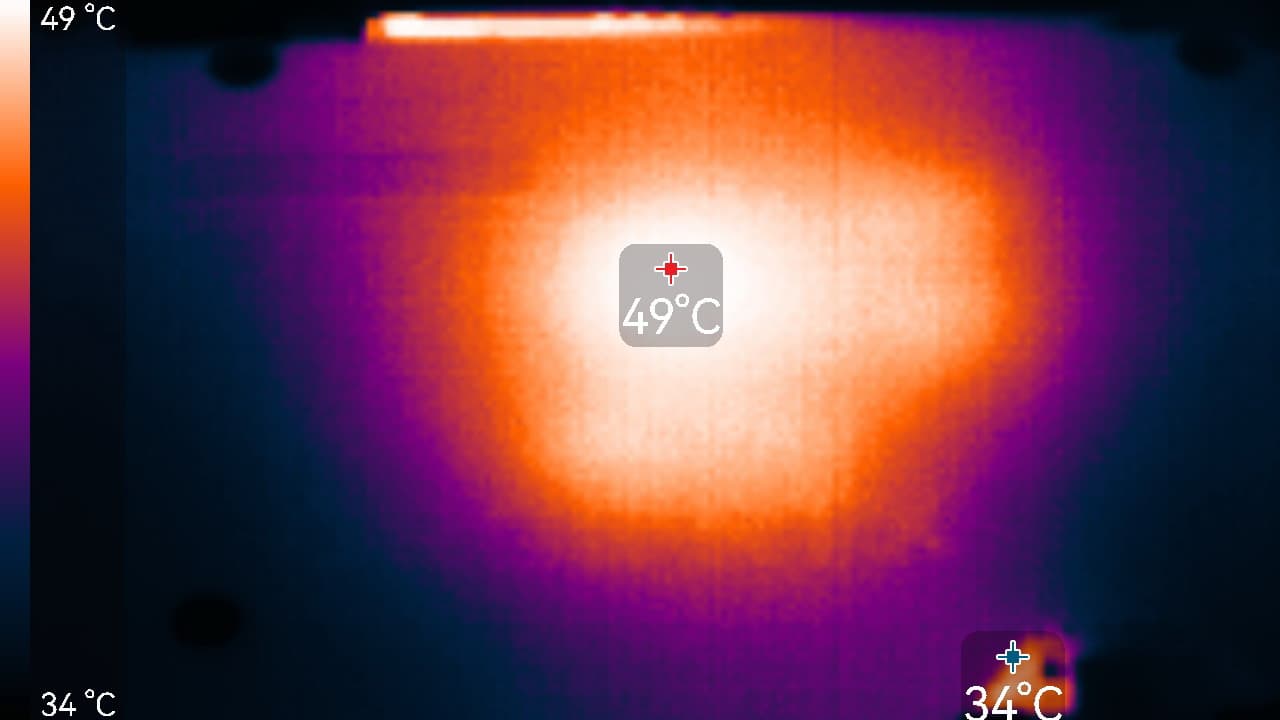 Максимальный нагрев наблюдался в нижней части PCB около разъема PCIe, а также в области GPU.