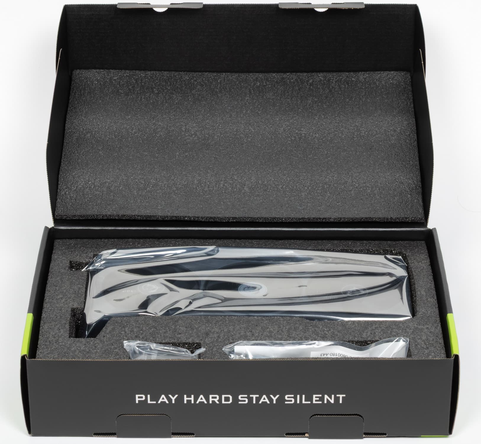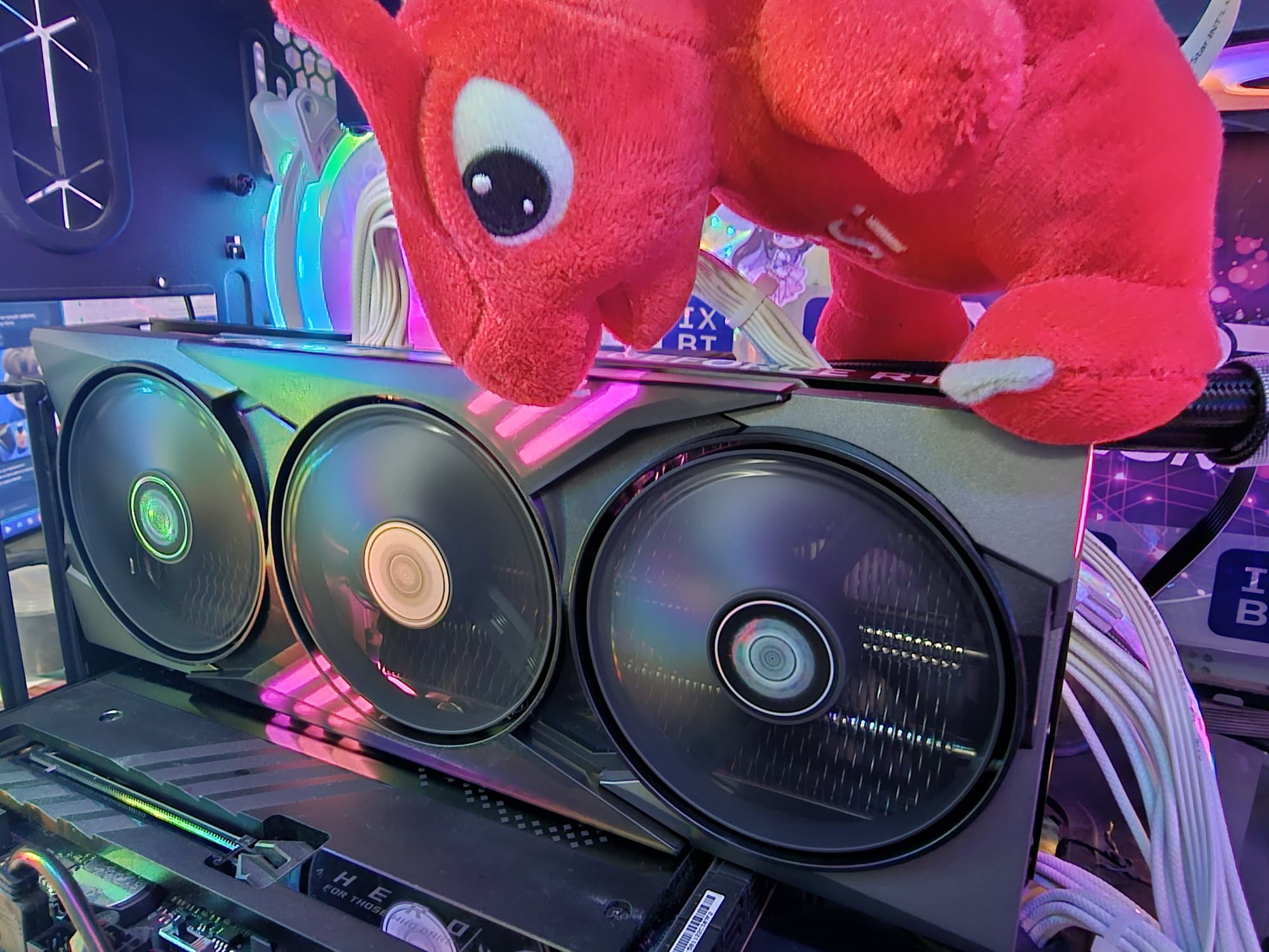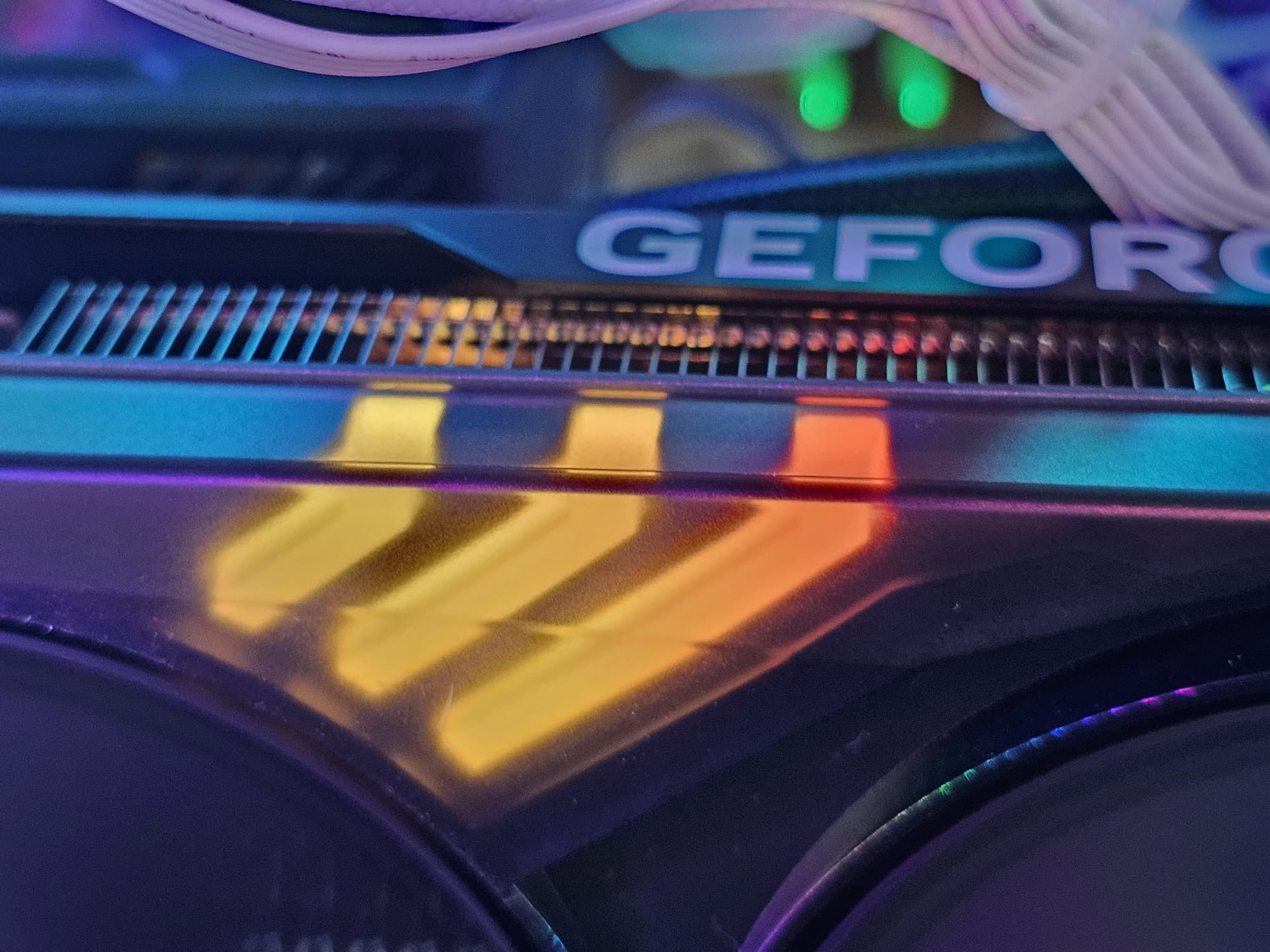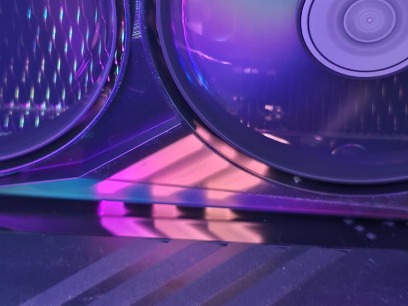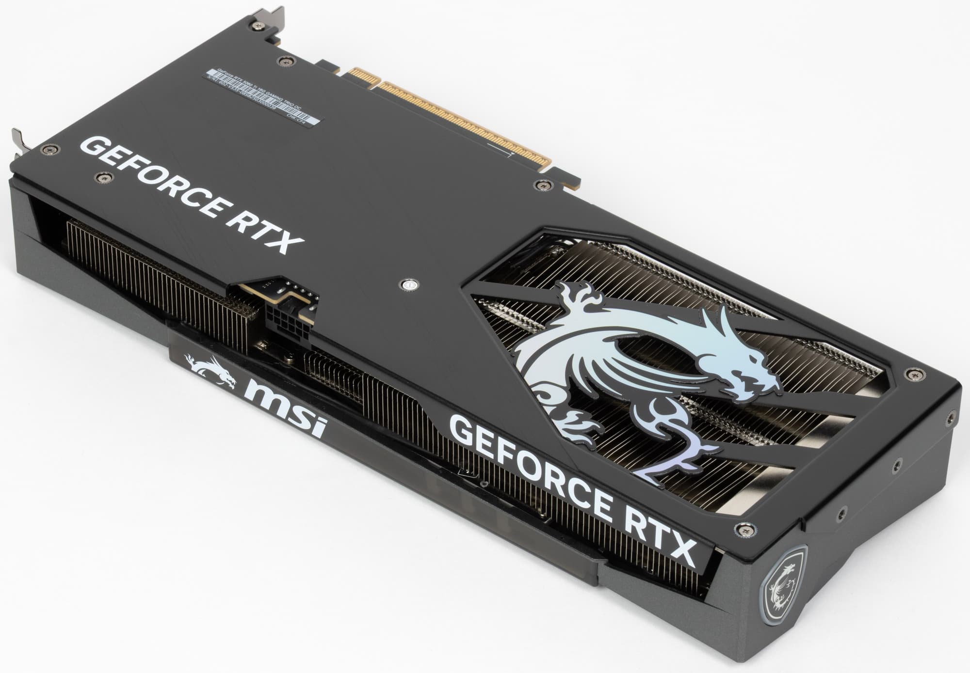 Карта имеет подсветку в виде диагональных полос между вентиляторами, а на заднем торце подсвечен логотип.