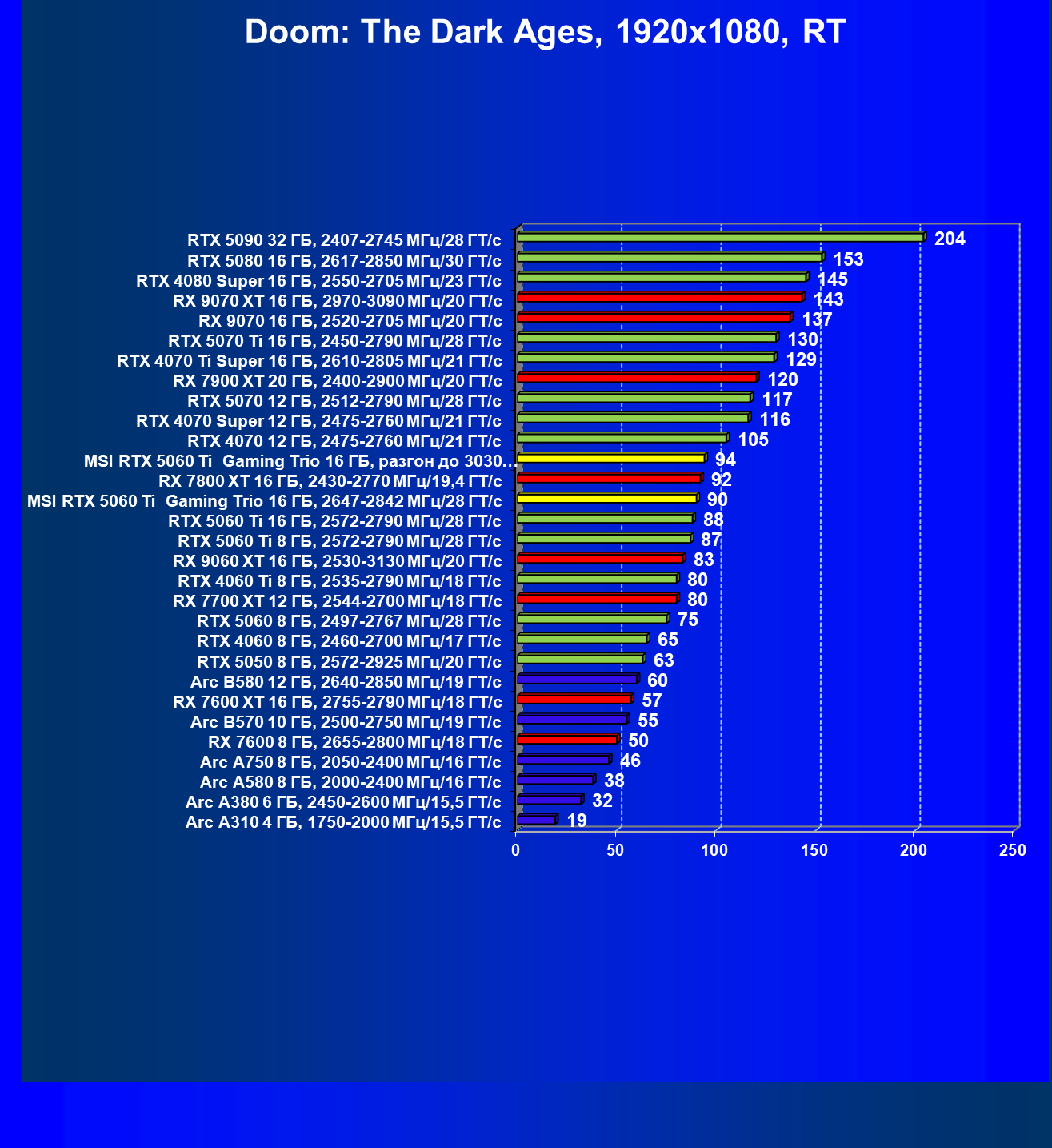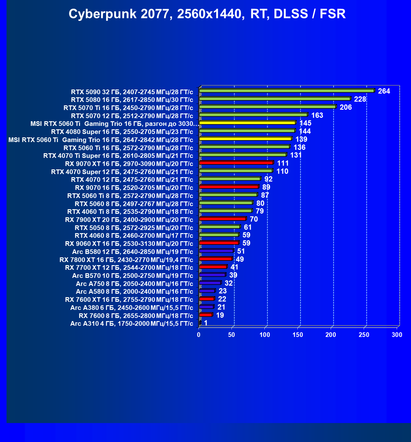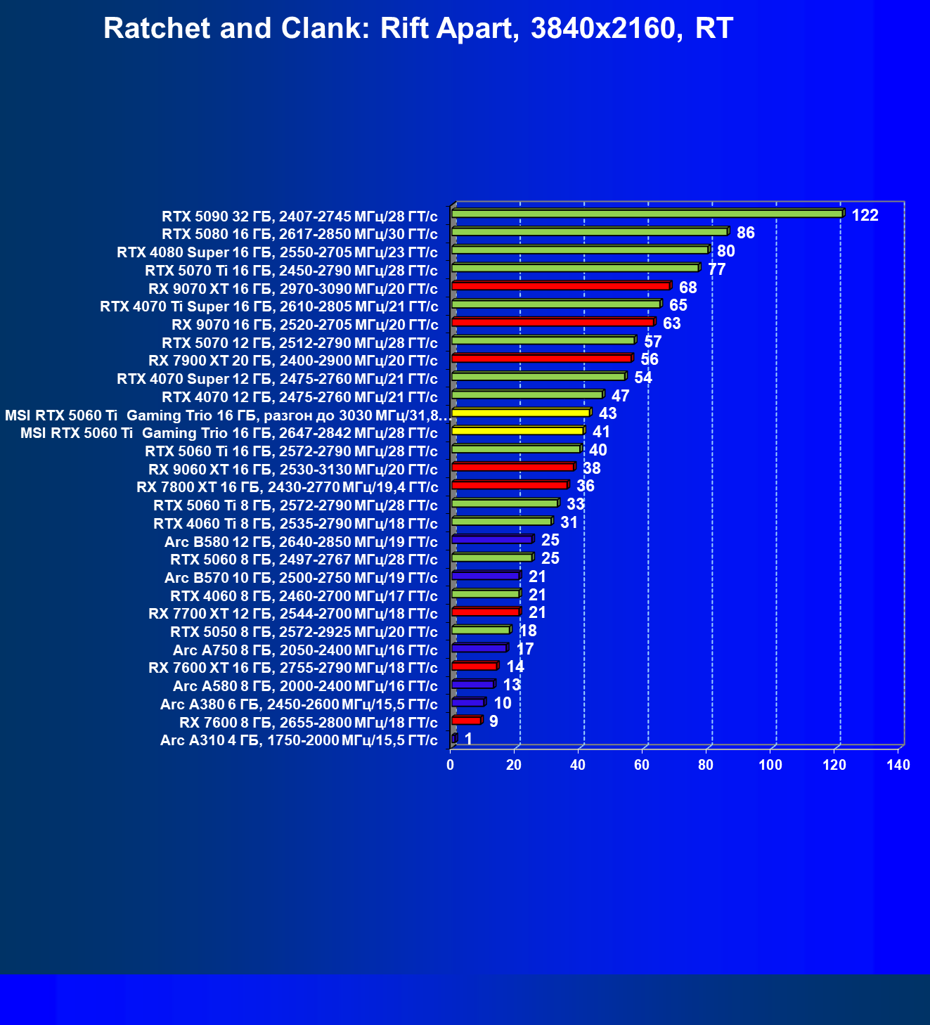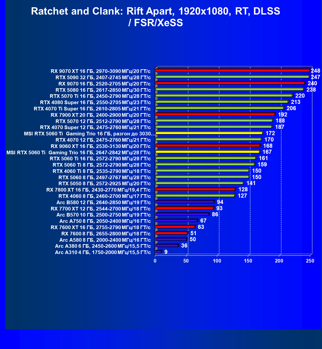 | 08 | RX 9060 XT 16 ГБ, 2530—3130 МГц/20 ГТ/с | 298 | 1339 | 45 000 |