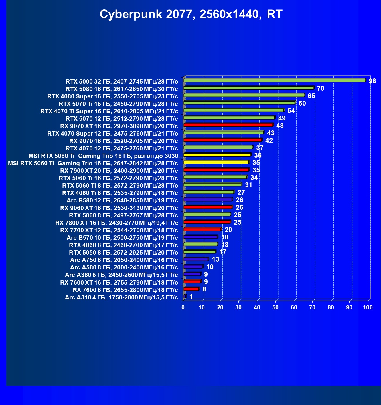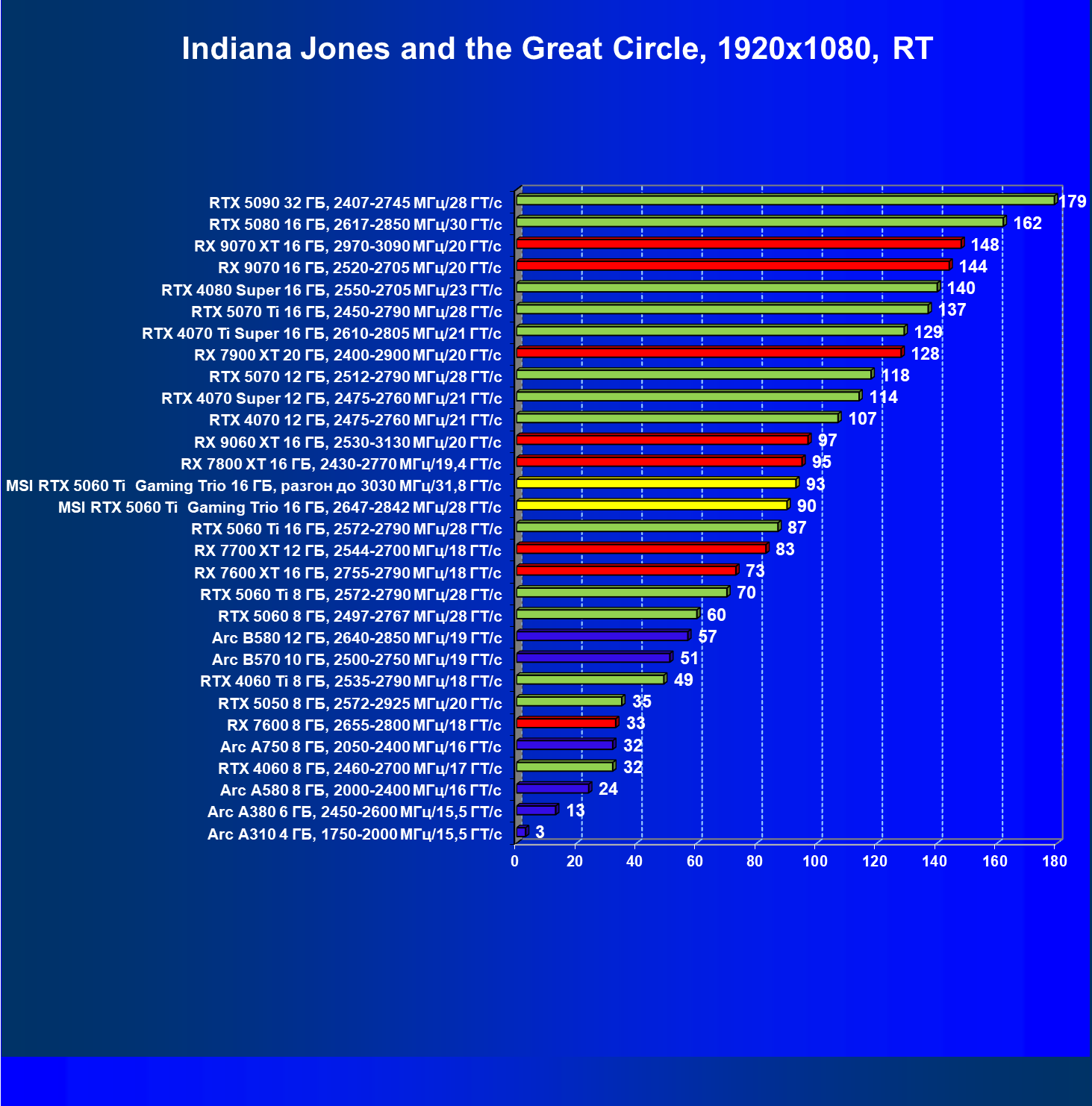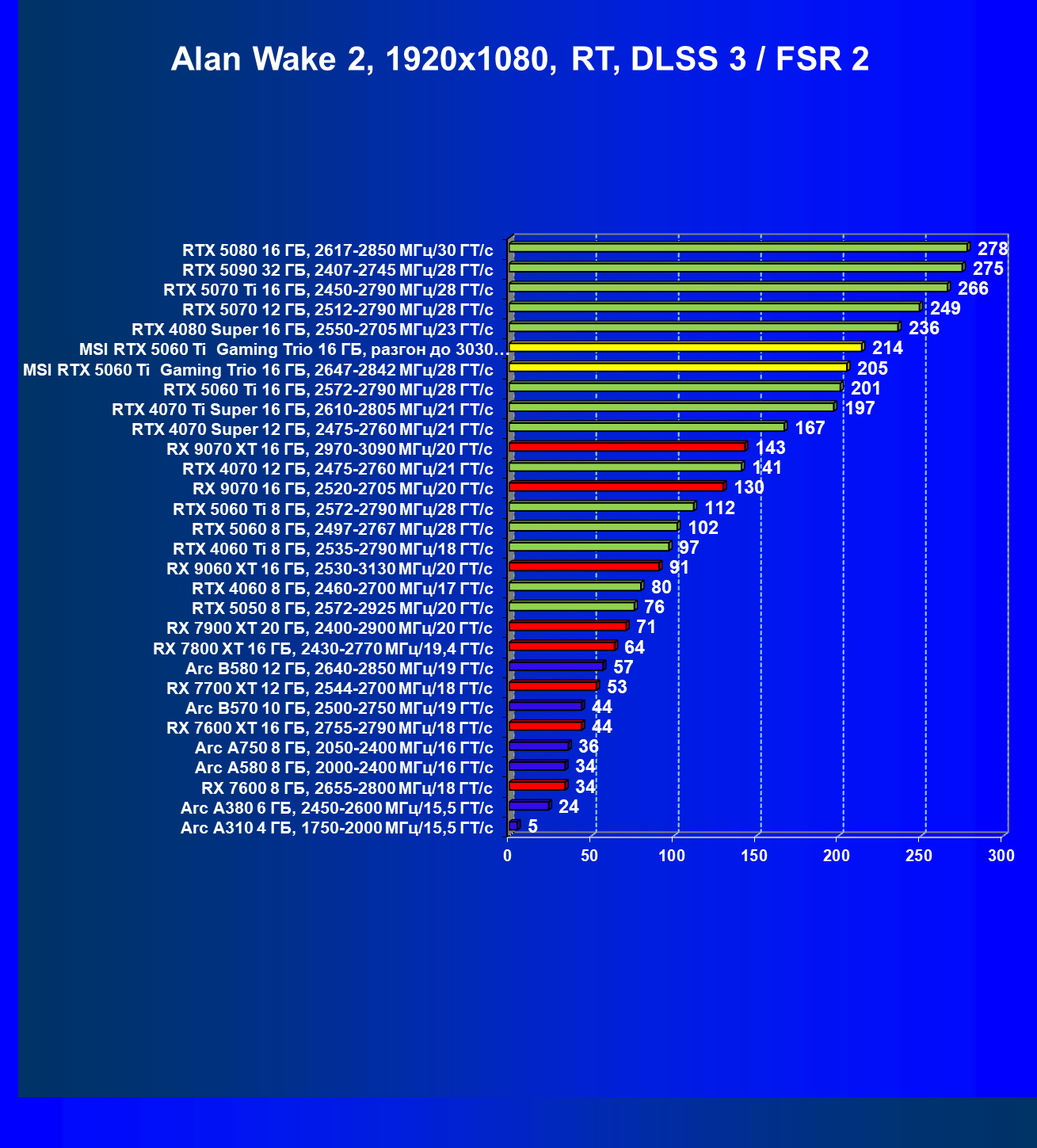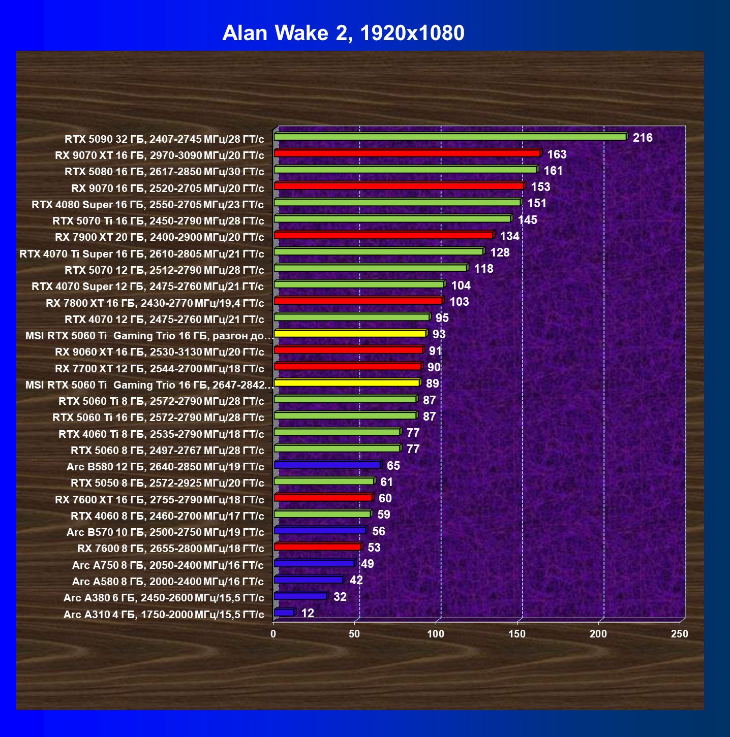 | 08 | RX 9060 XT 16 ГБ, 2530—3130 МГц/20 ГТ/с | 298 | 1339 | 45 000 |