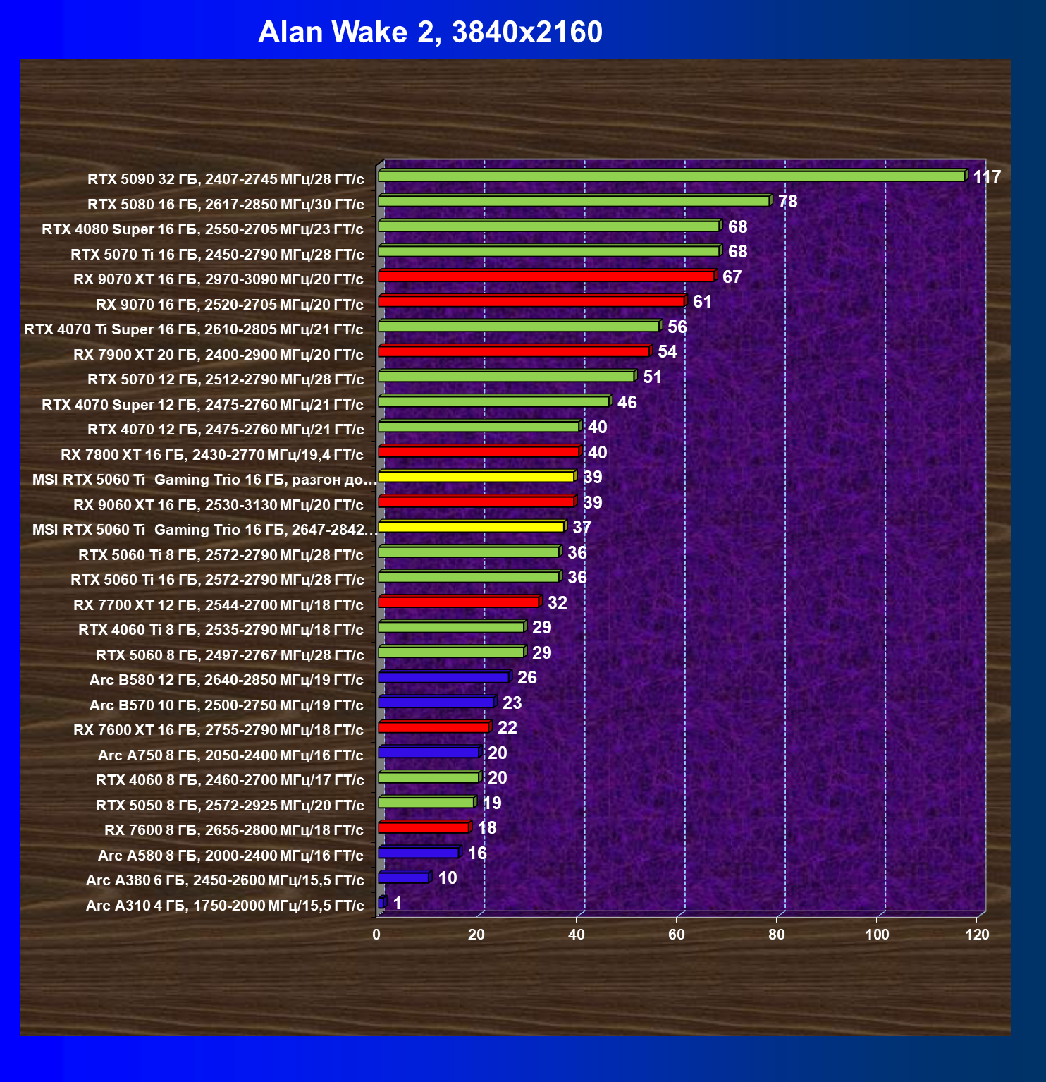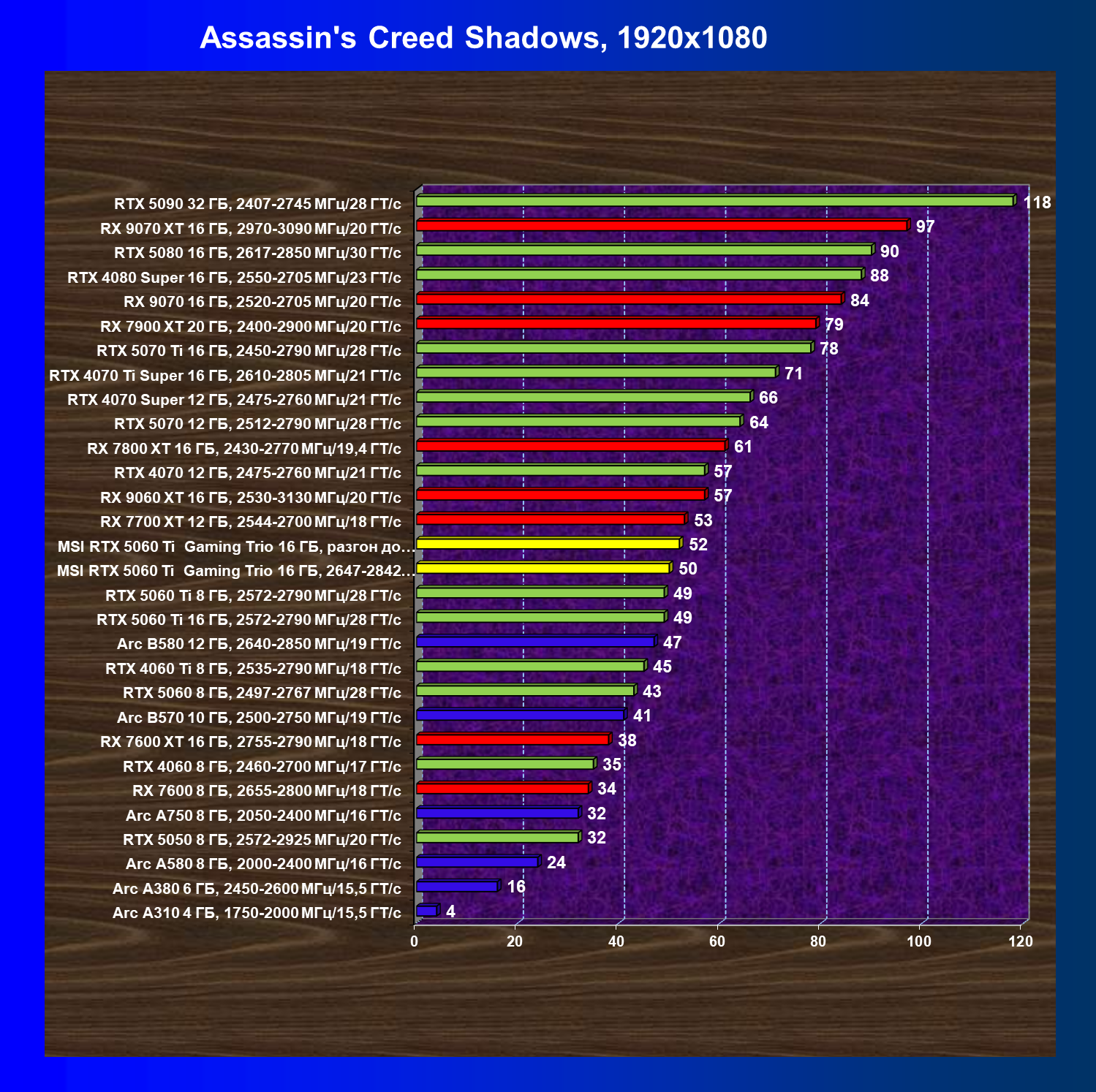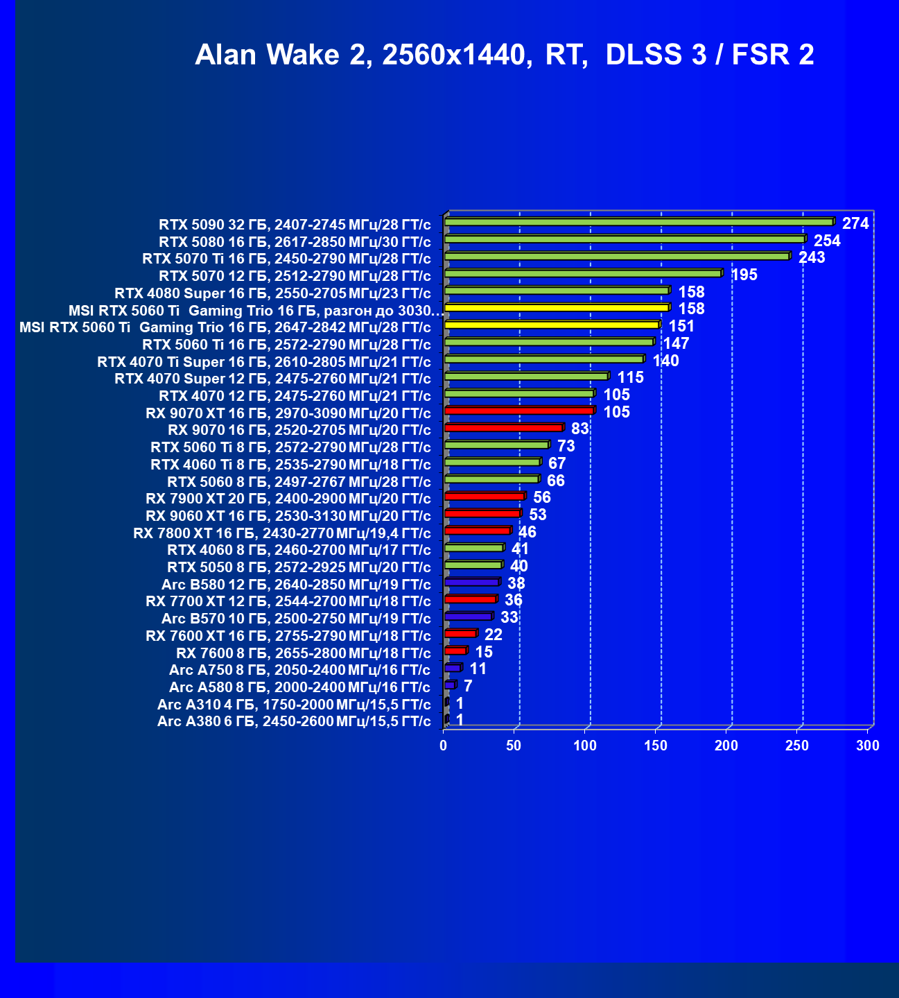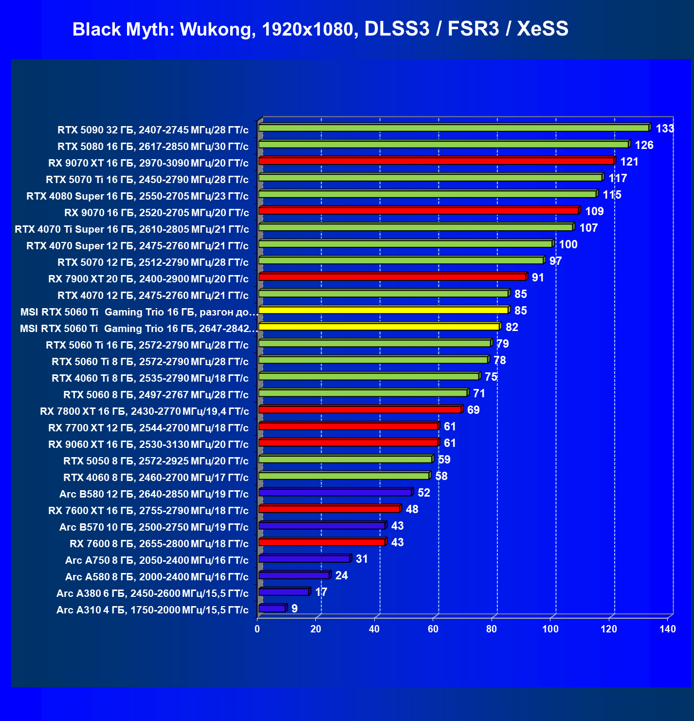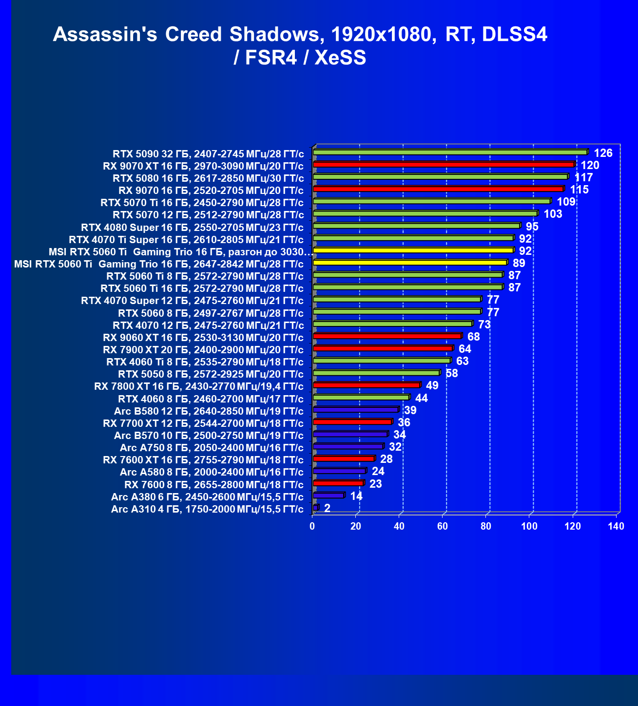 | 08 | RX 9060 XT 16 ГБ, 2530—3130 МГц/20 ГТ/с | 298 | 1339 | 45 000 |