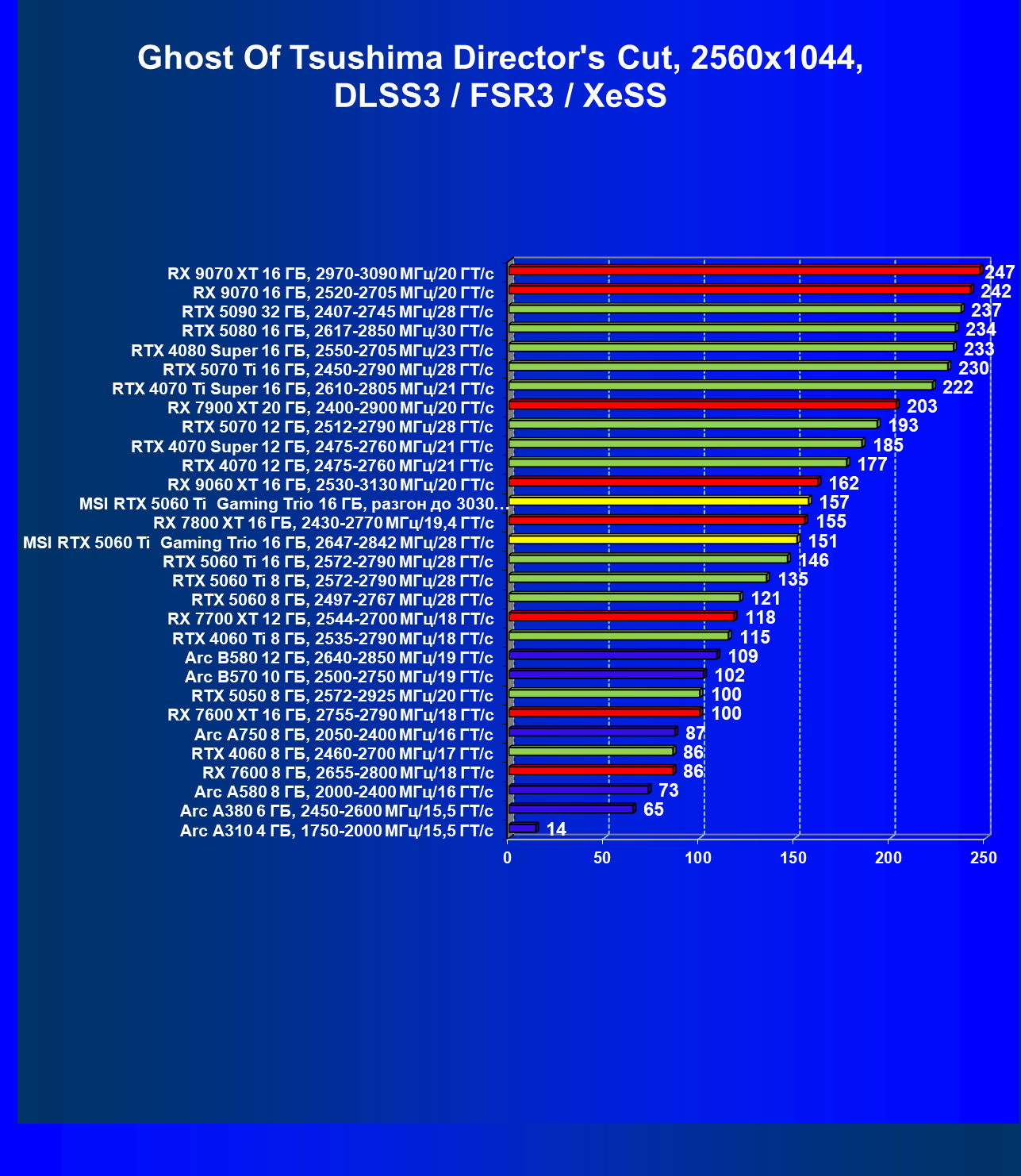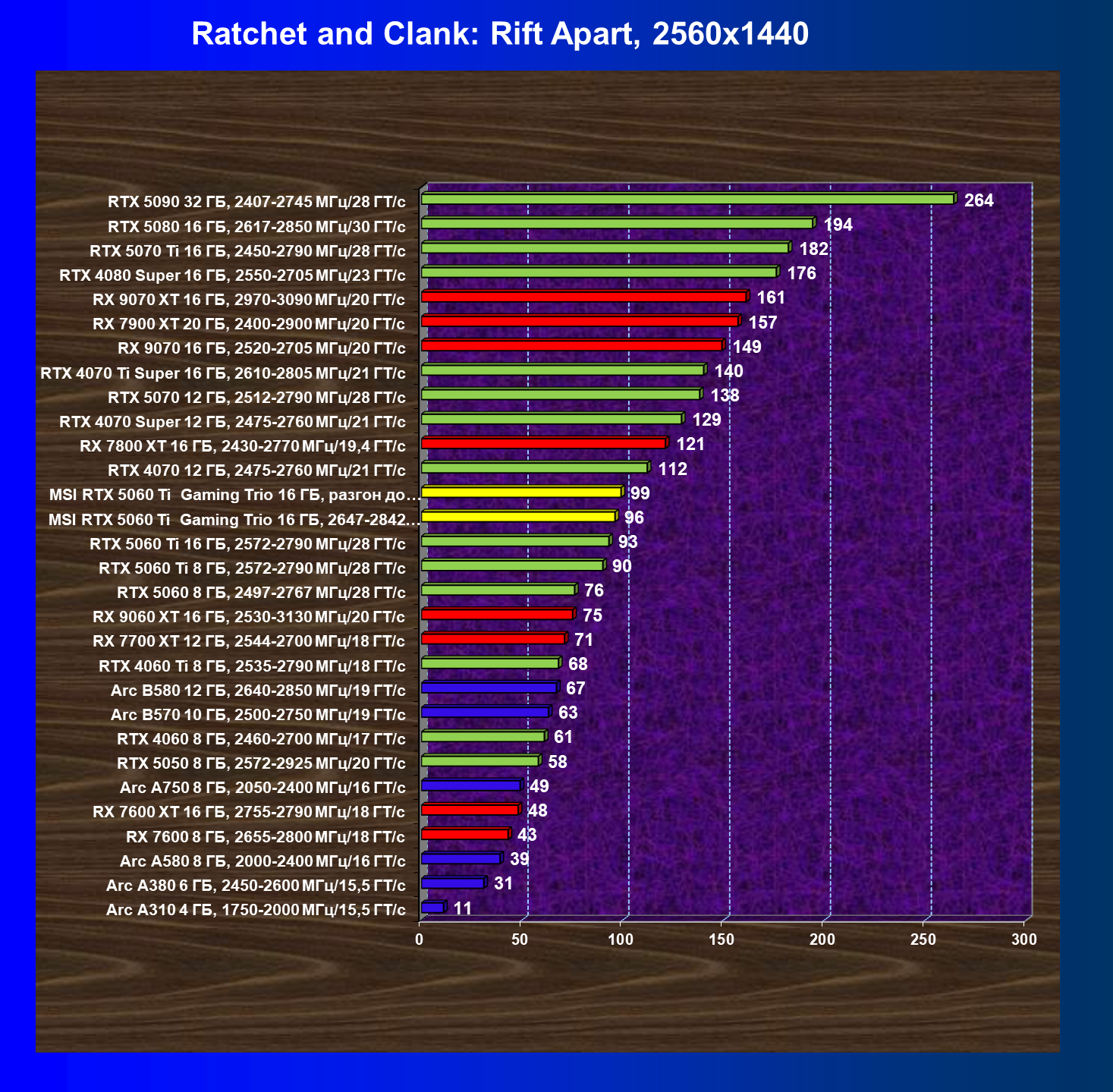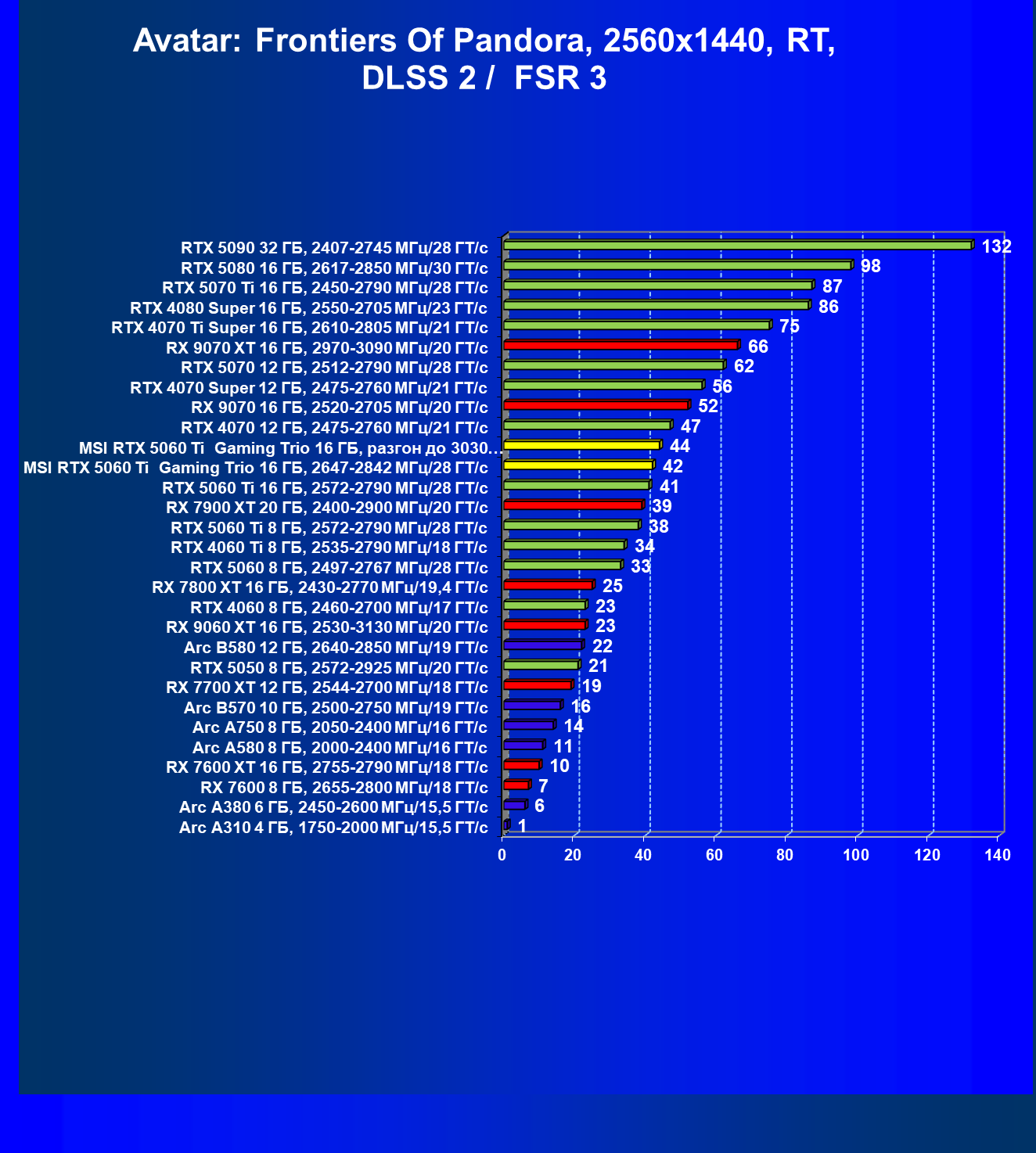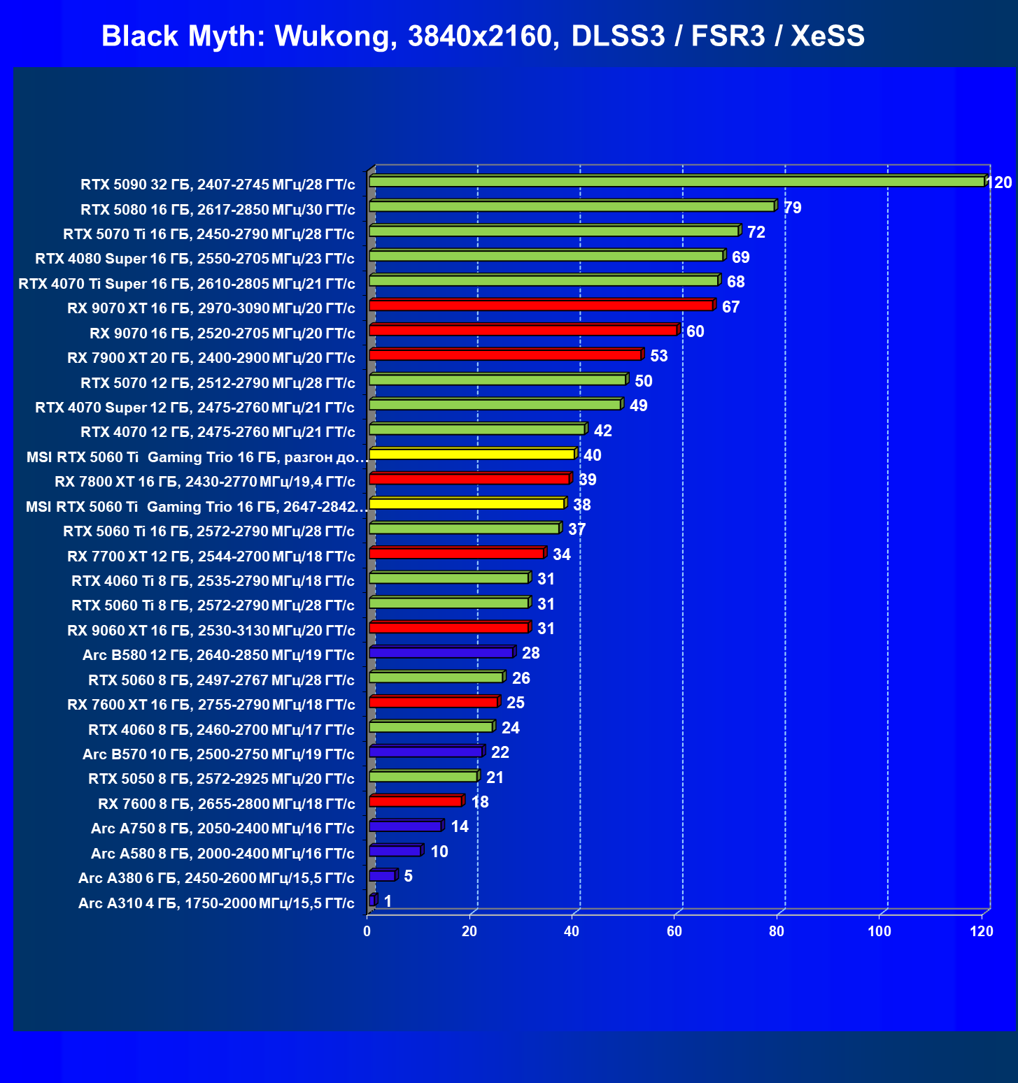 | 08 | RX 9060 XT 16 ГБ, 2530—3130 МГц/20 ГТ/с | 298 | 1339 | 45 000 |
