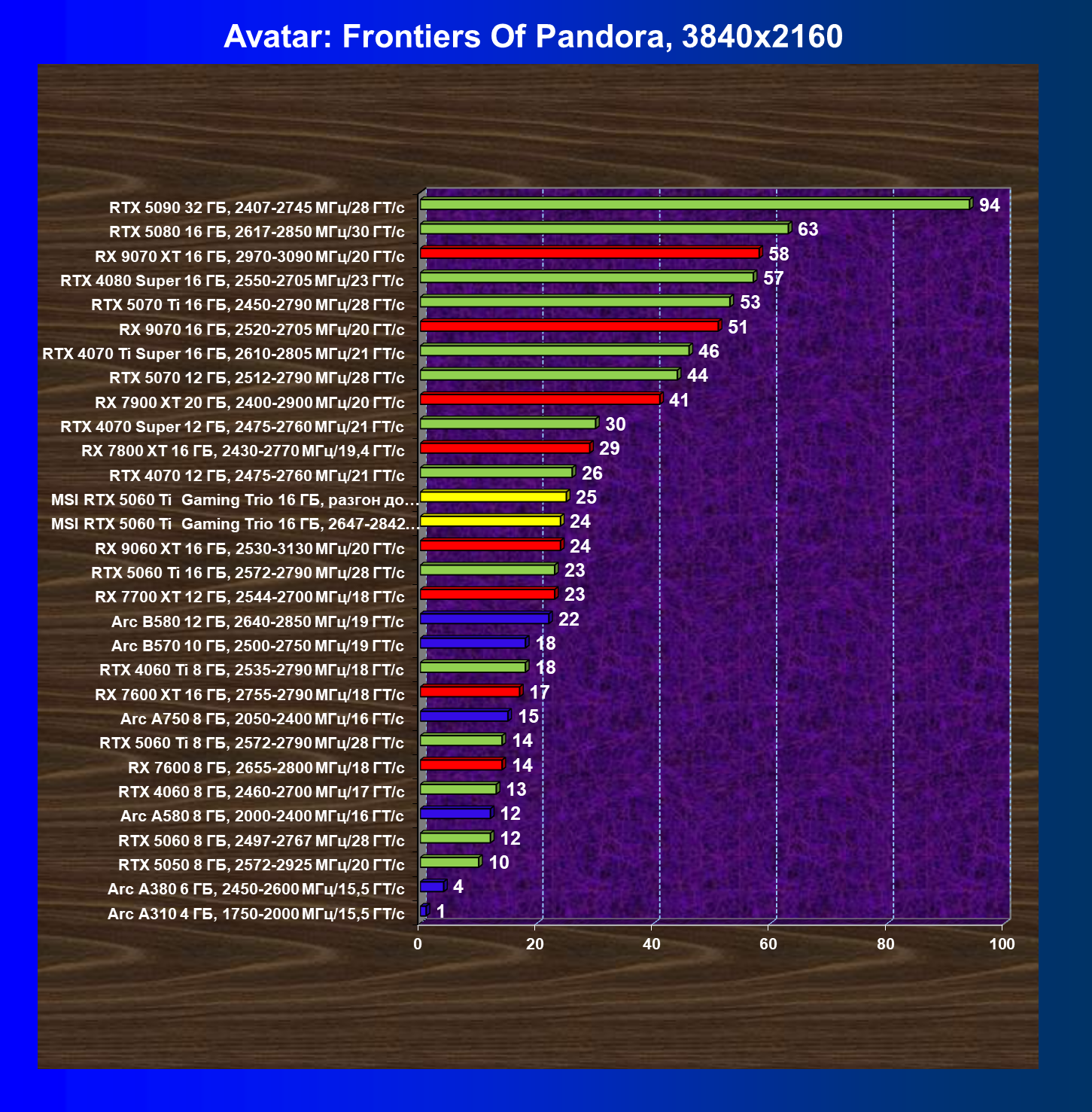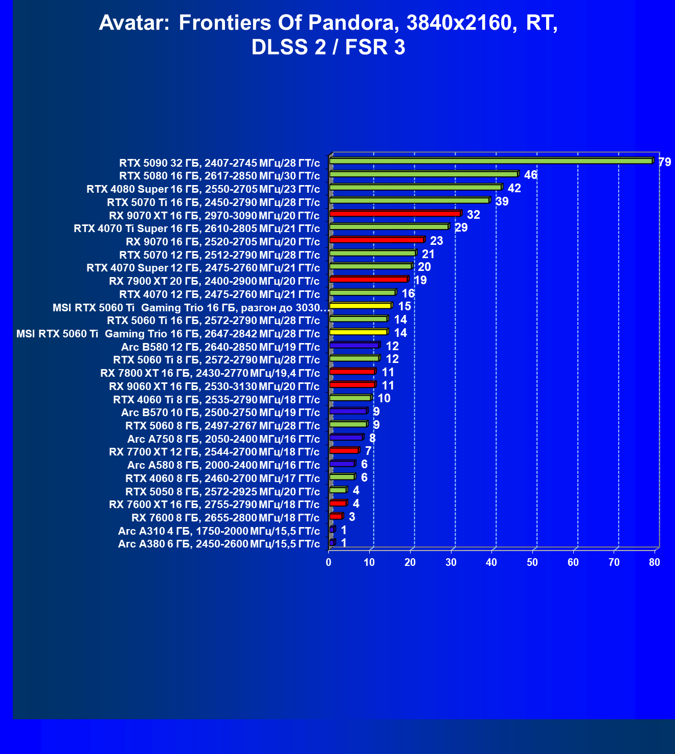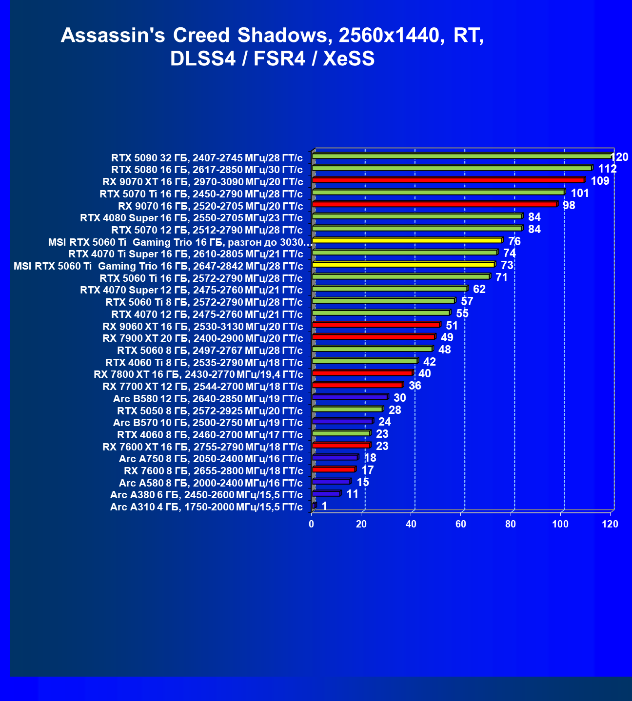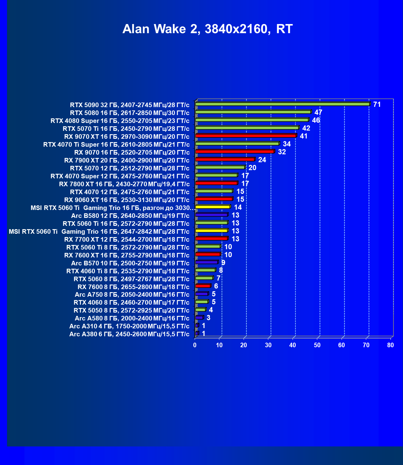 | 08 | RX 9060 XT 16 ГБ, 2530—3130 МГц/20 ГТ/с | 298 | 1339 | 45 000 |
