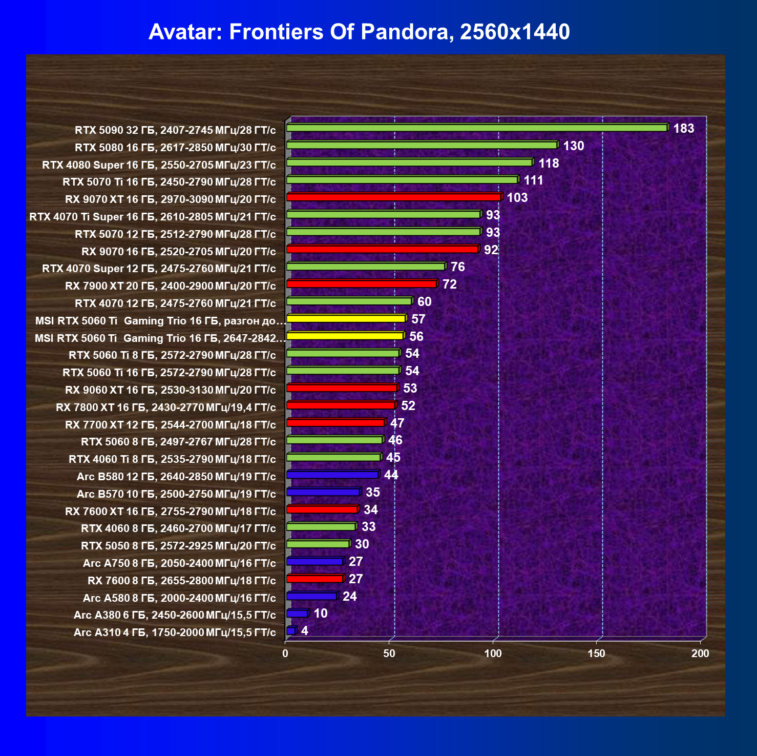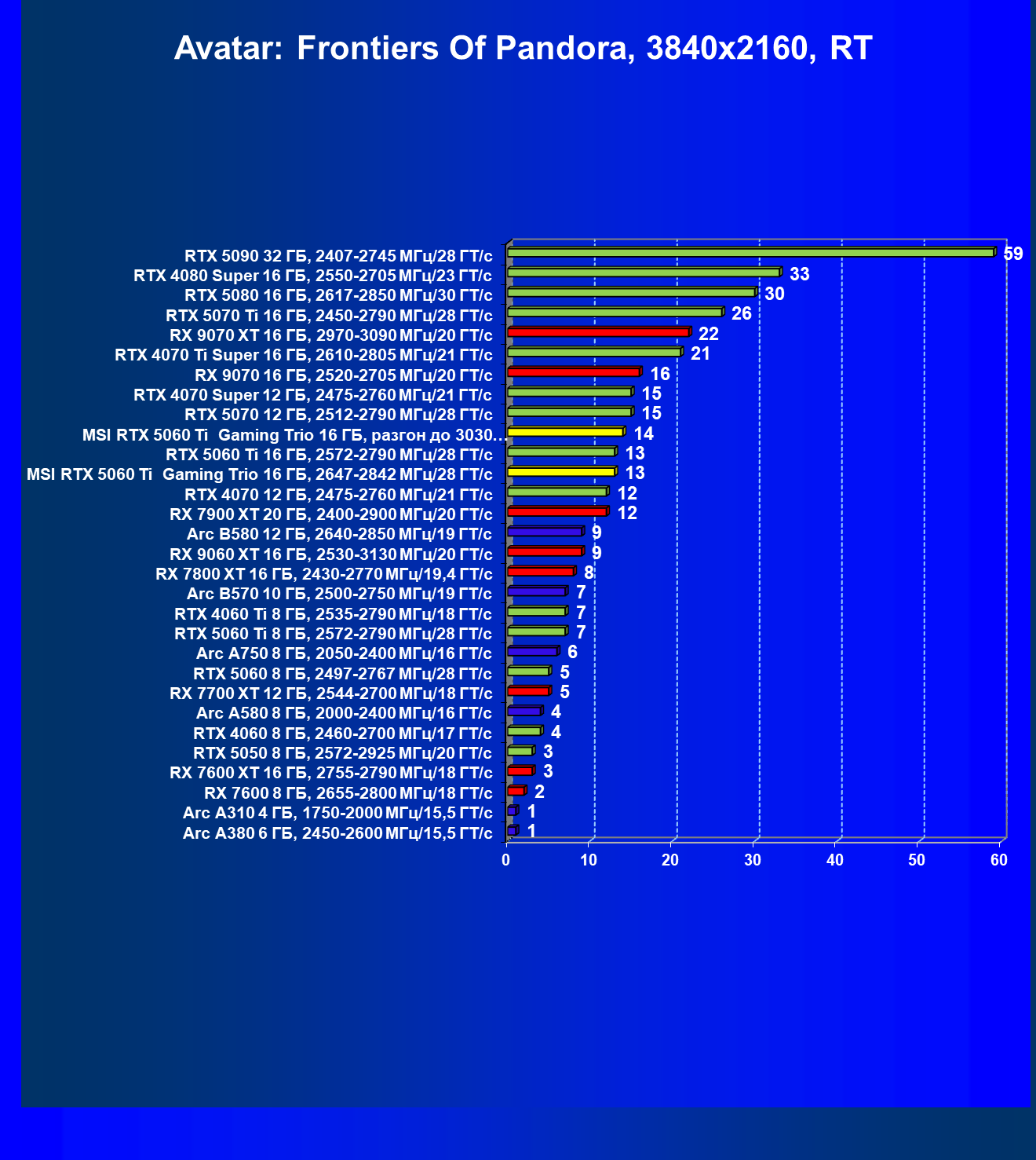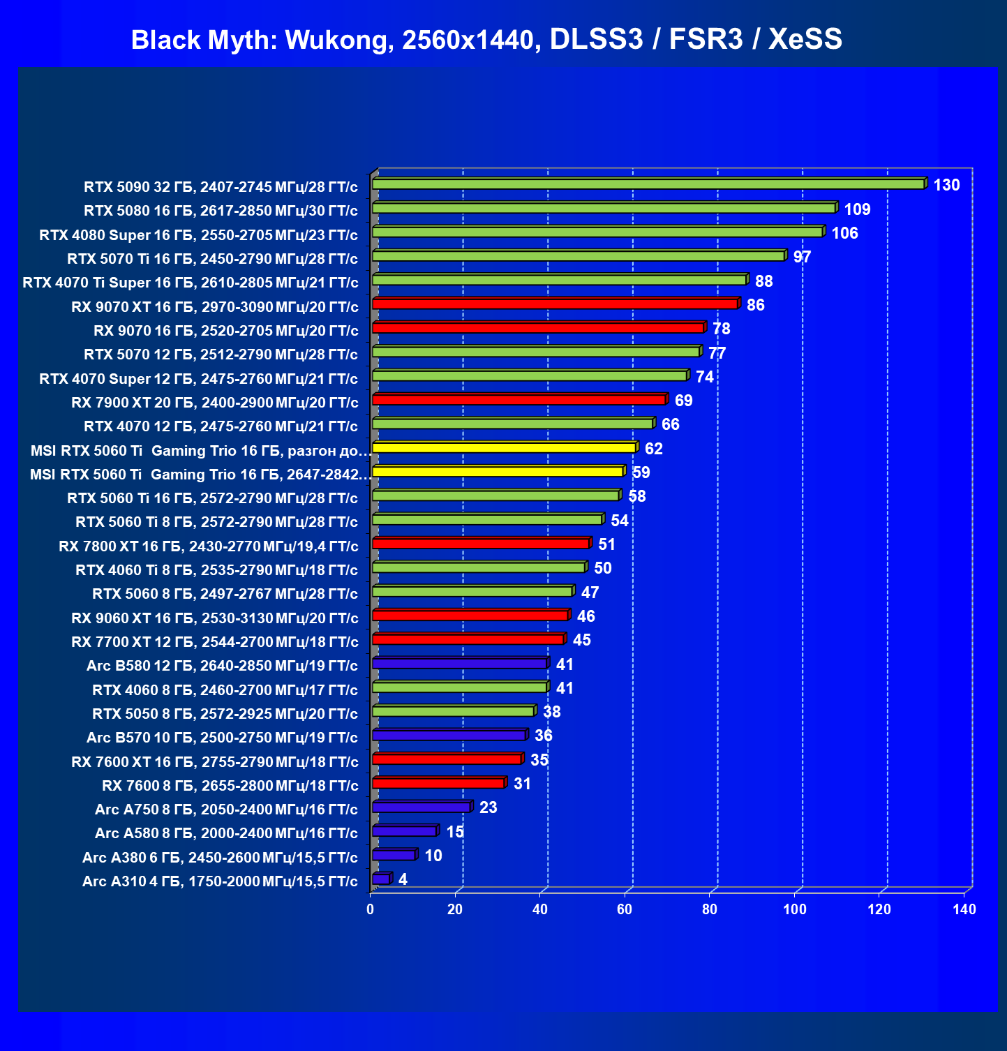 | 10 | MSI RTX 5060 Ti Gaming Trio 16 ГБ, 2647—2842 МГц/28 ГТ/с | 3657 | 731 | 50 000 |