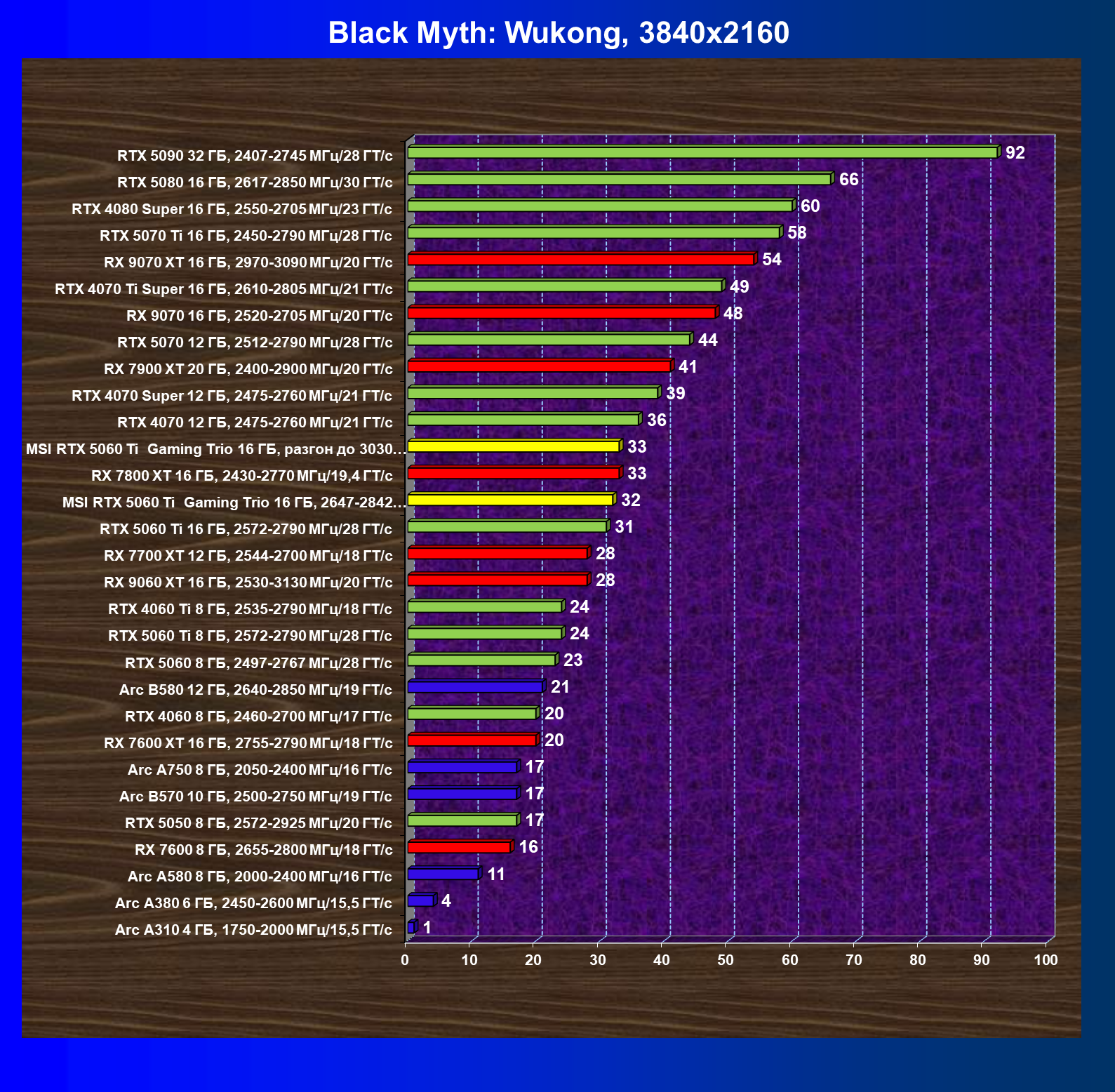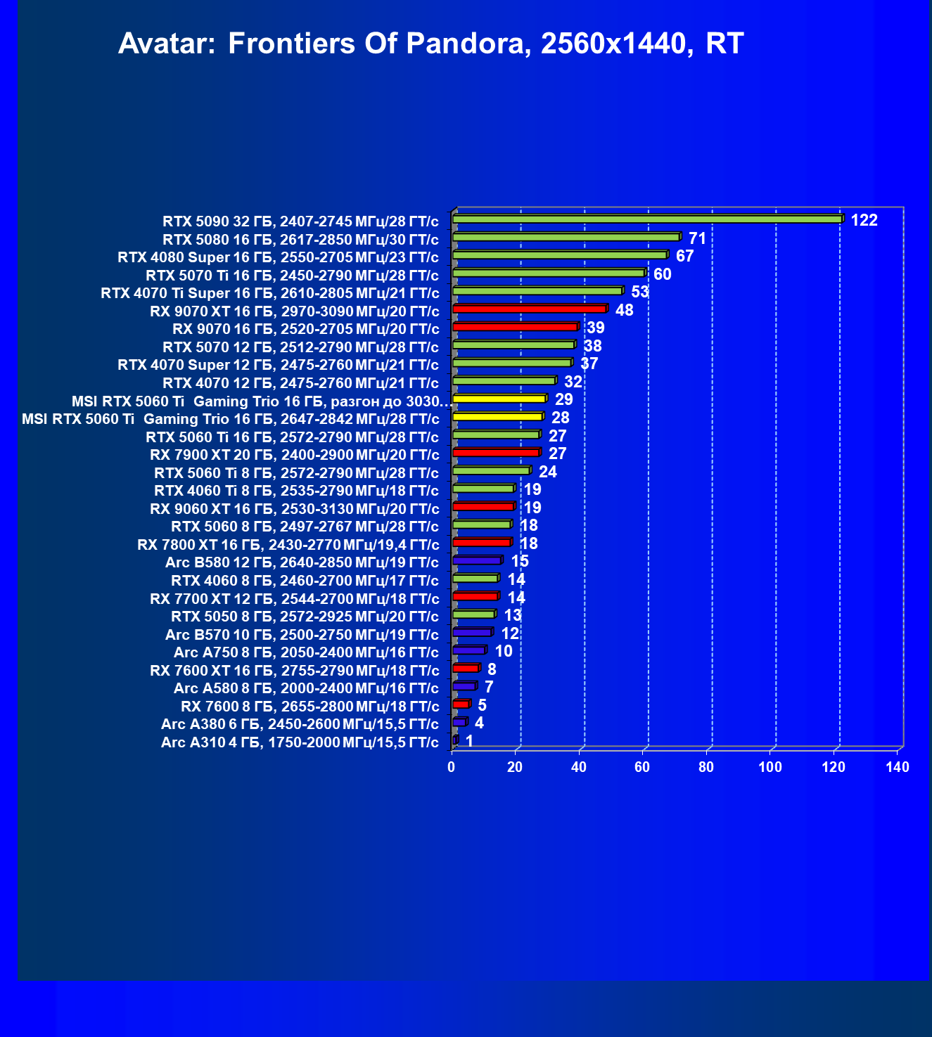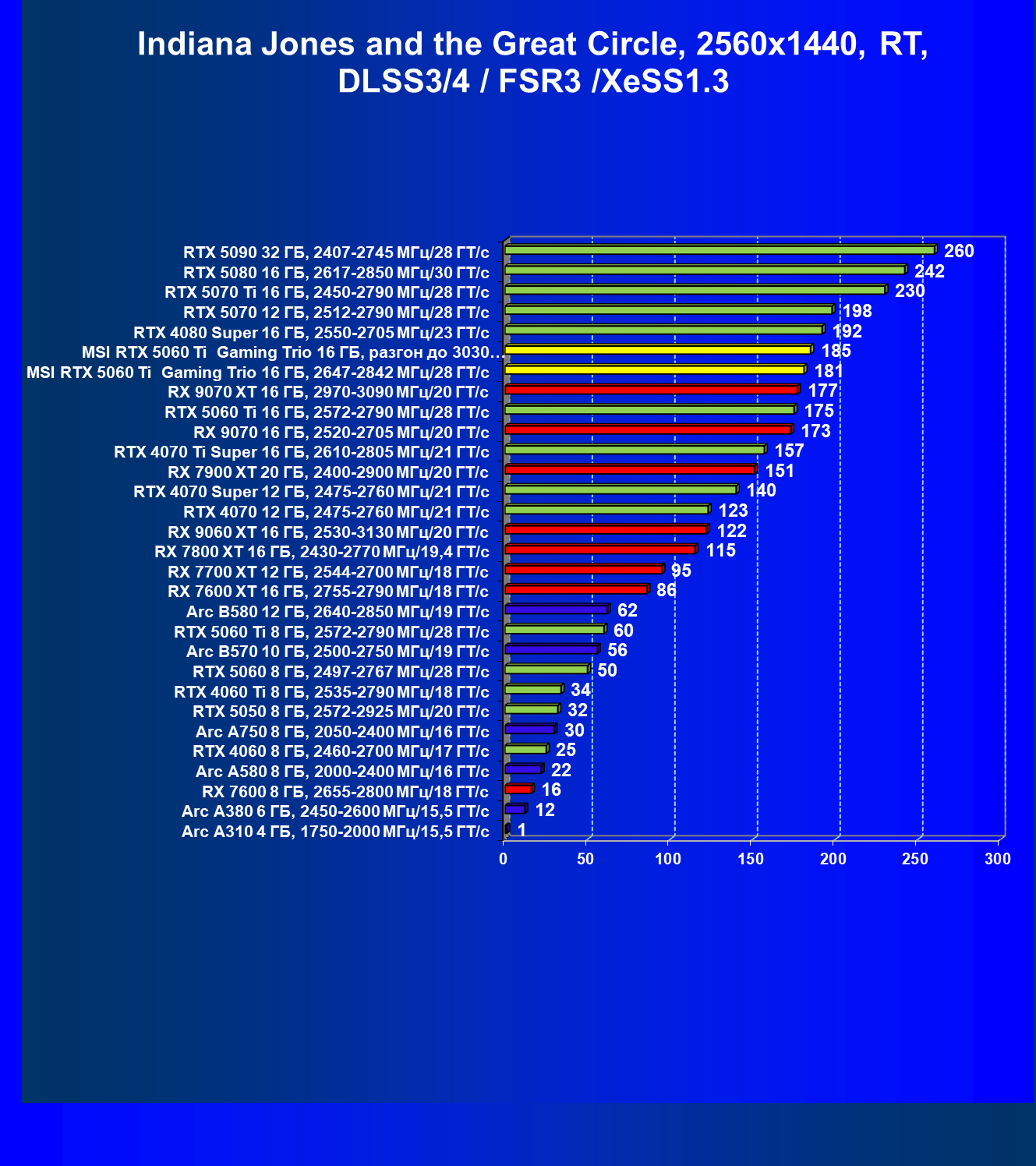 | 01 | MSI RTX 5060 Ti Gaming Trio 16 ГБ, разгон до 3030 МГц/31,8 ГТ/с | 761 | 3804 | 50 000 |