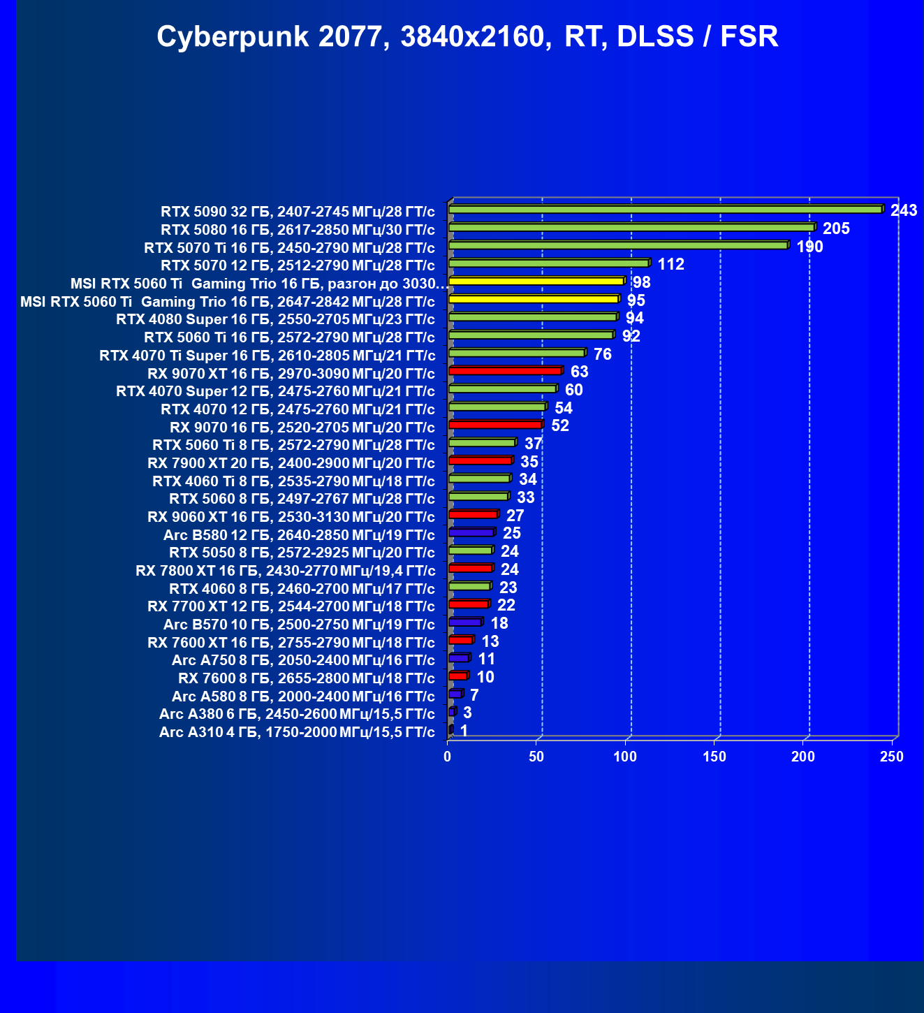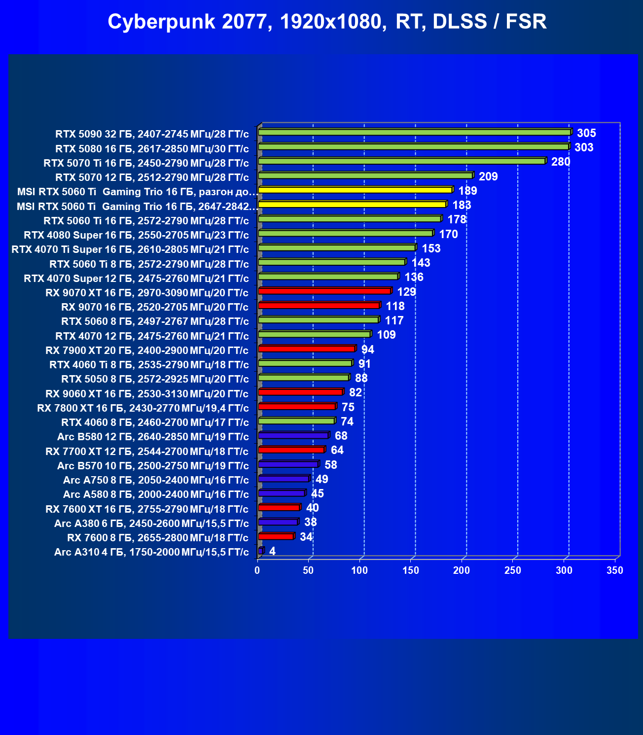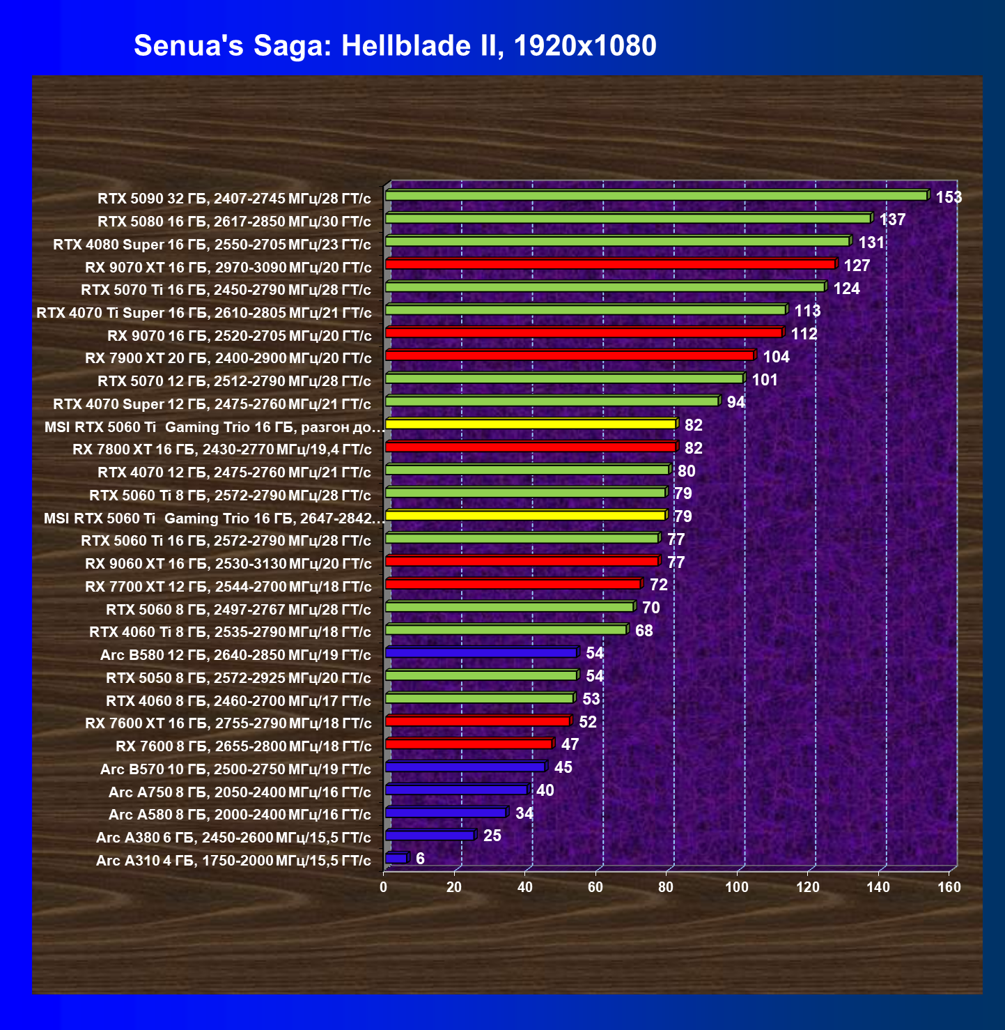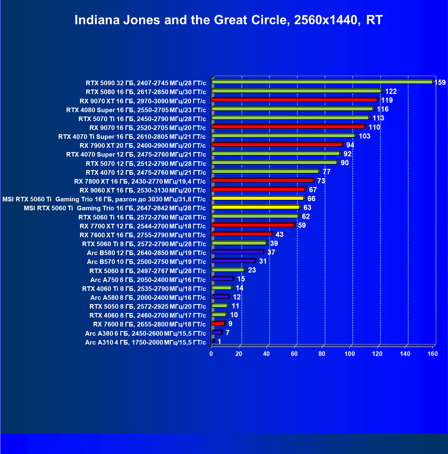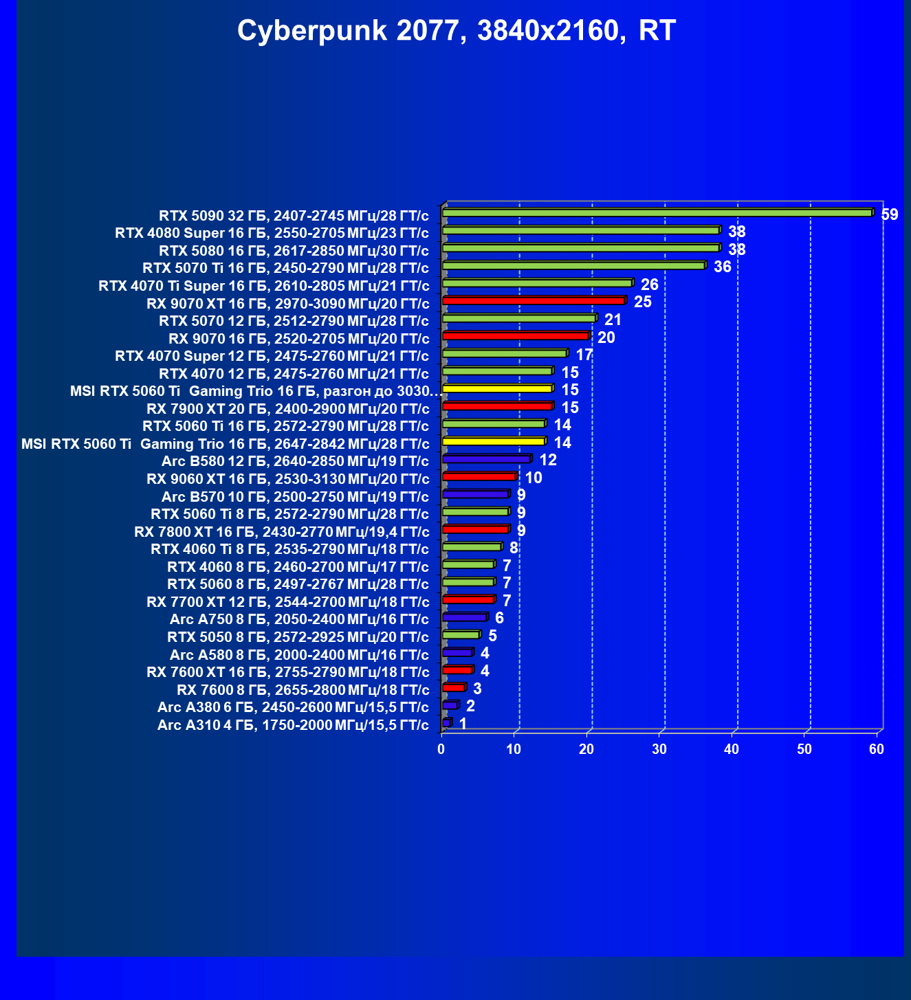 В данном рейтинге учитываются только результаты в играх без включения RT и техник апскейлинга, в целом даже в классических играх RTX 5060 Ti (16 ГБ) смотрится неплохо.