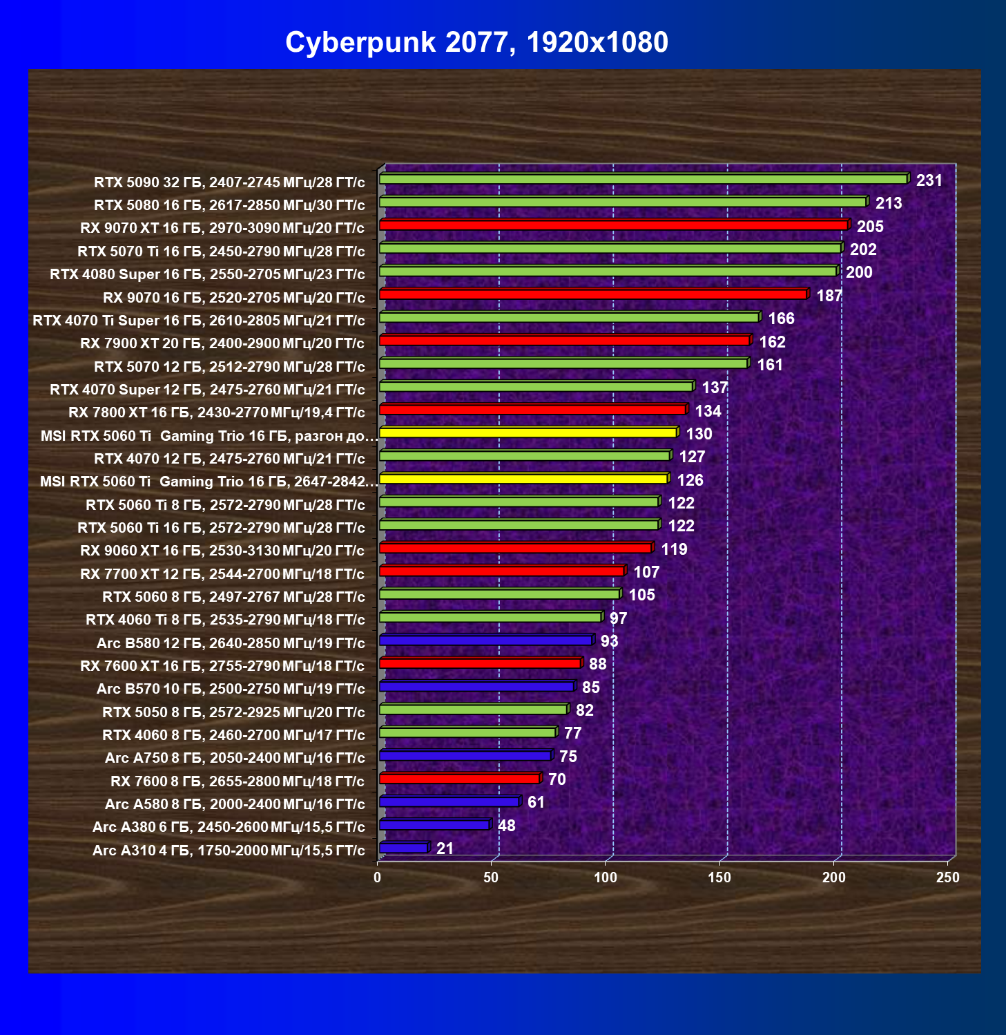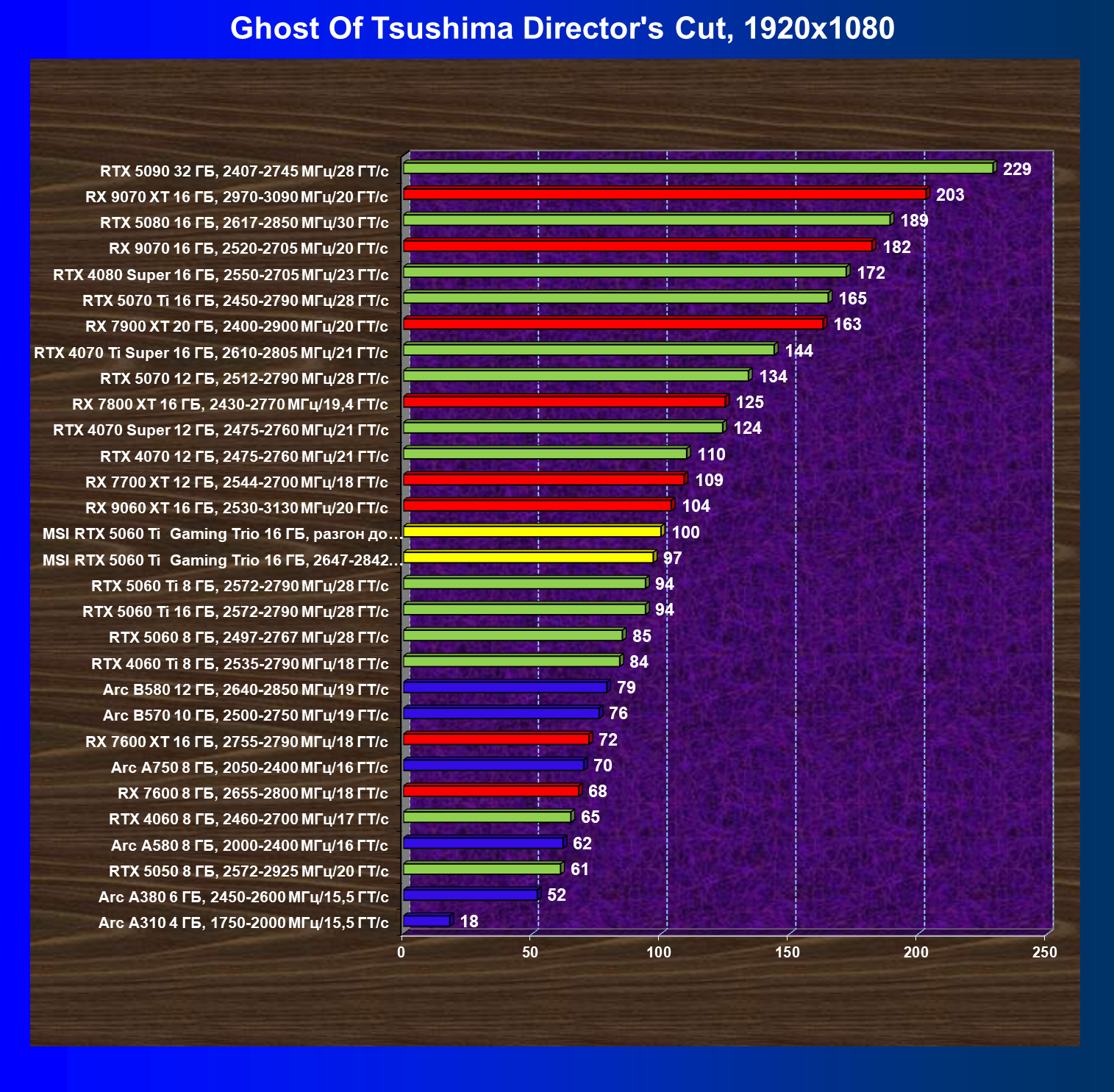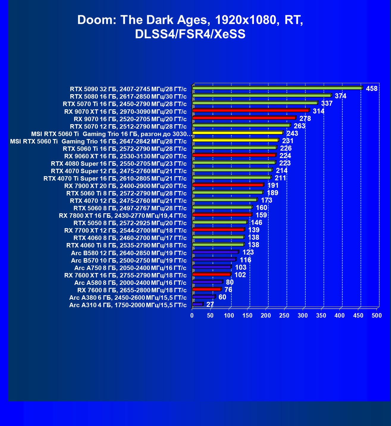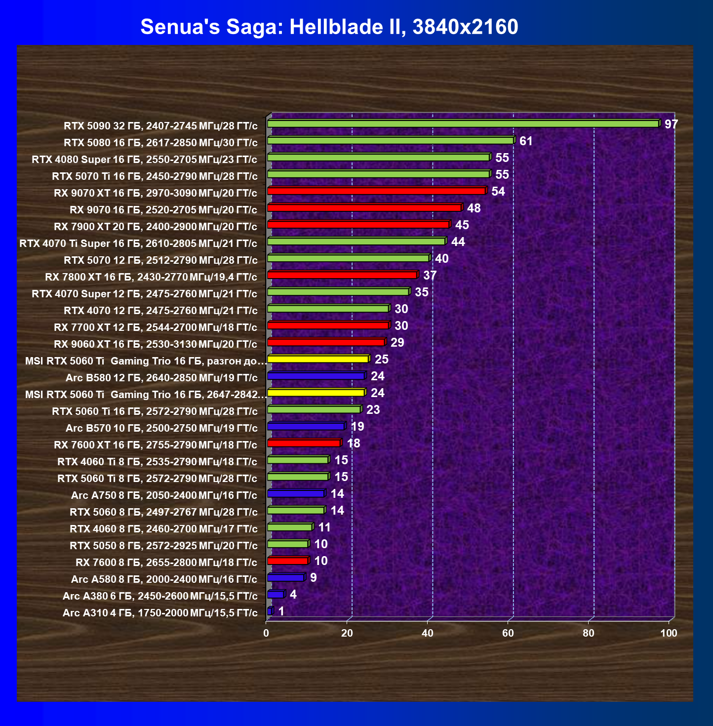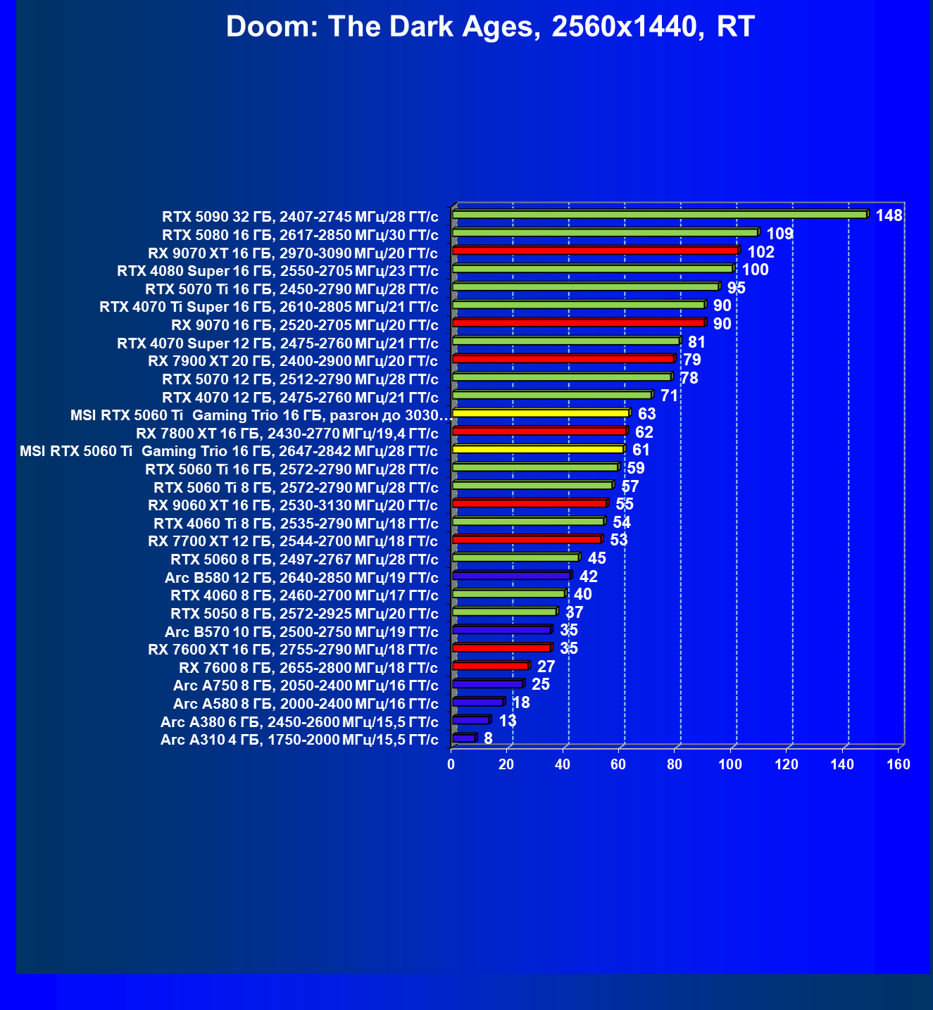 В данном рейтинге учитываются только результаты в играх без включения RT и техник апскейлинга, в целом даже в классических играх RTX 5060 Ti (16 ГБ) смотрится неплохо.