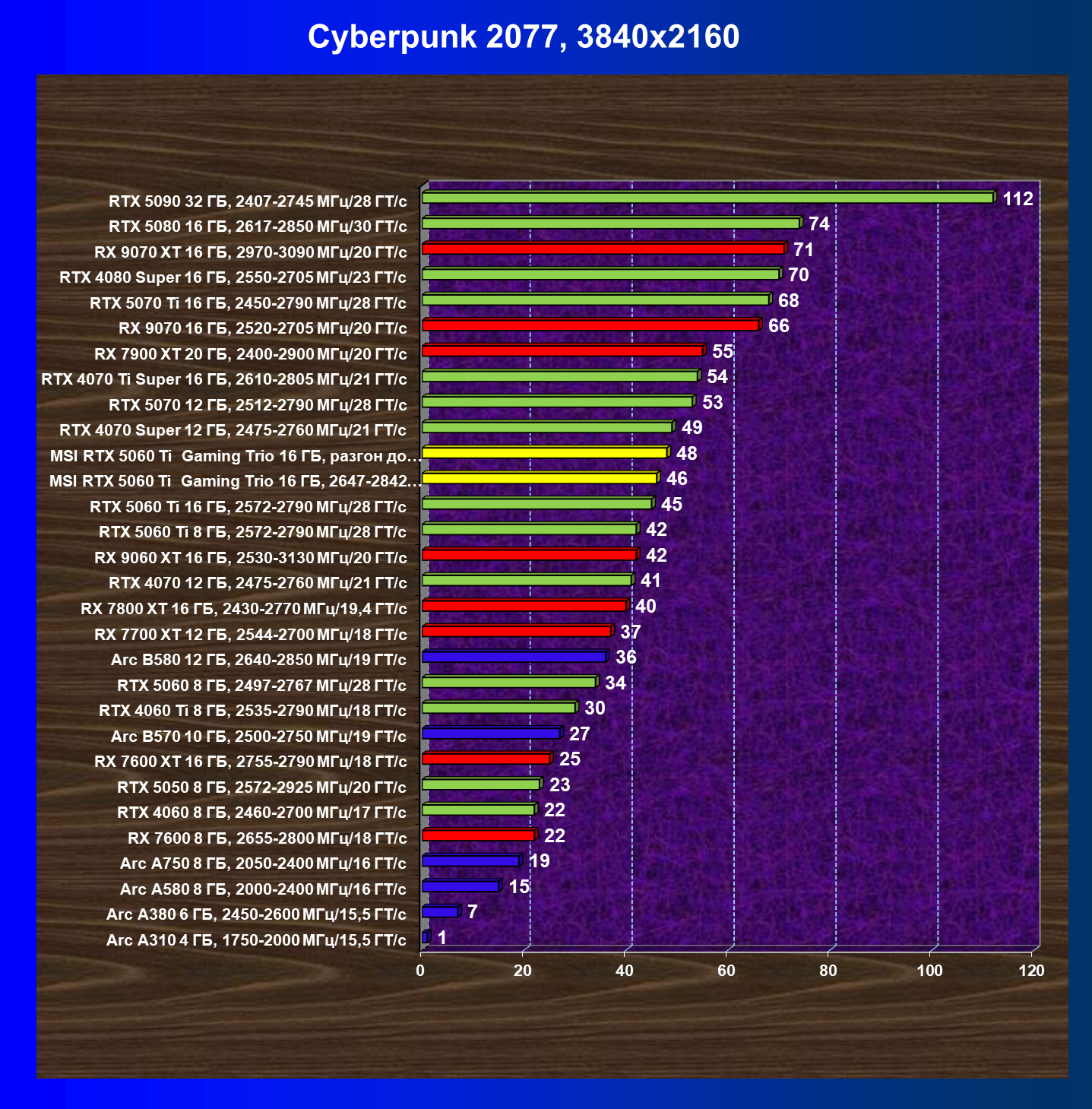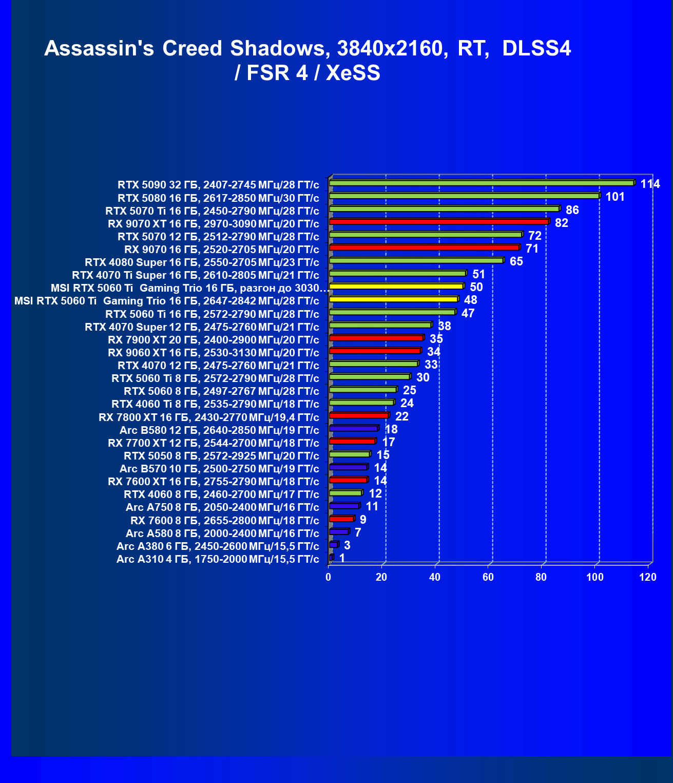 | 11 | RTX 5060 Ti 16 ГБ, 2572—2790 МГц/28 ГТ/с | 3564 | 743 | 48 000 |