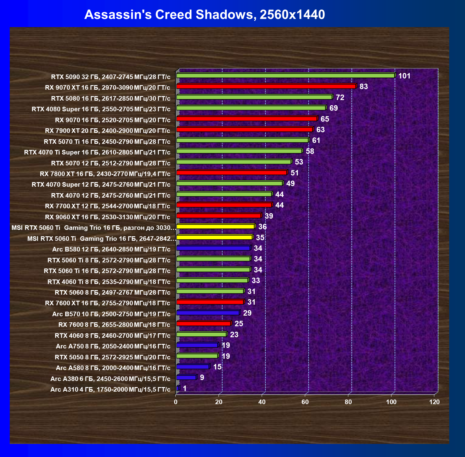 | 16 | RTX 5060 Ti 8 ГБ, 2572—2790 МГц/28 ГТ/с | 2444 | 643 | 38 000 |