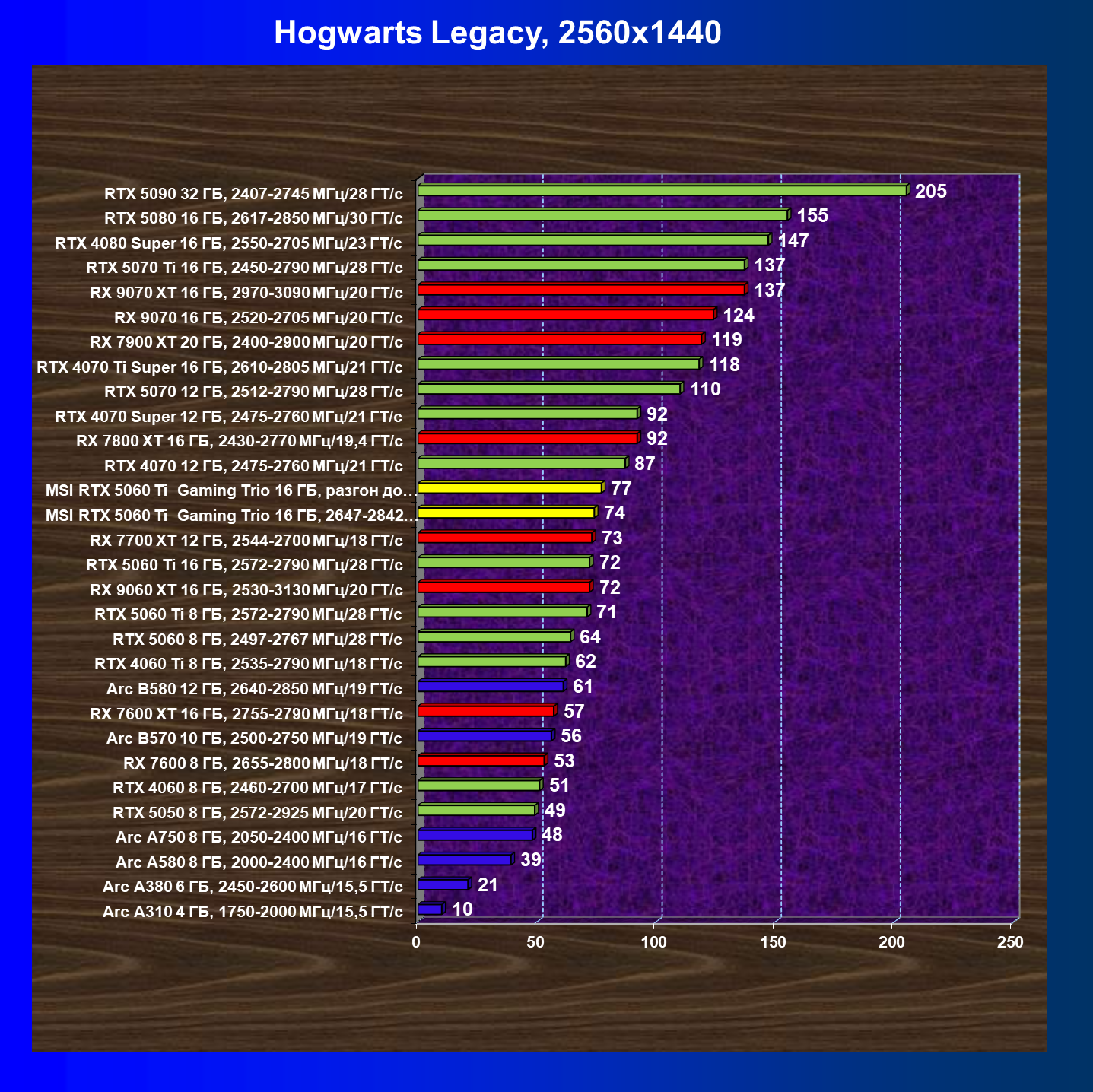 | 15 | RX 9060 XT 16 ГБ, 2530—3130 МГц/20 ГТ/с | 2497 | 555 | 45 000 |