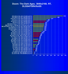 Рейтинг составлен по 10 тестам, в которых используется технология трассировки лучей и одновременно технология Nvidia DLSS, AMD FSR или Intel XeSS. Этот рейтинг нормирован по самому слабому ускорителю в данной группе — Arc A310 (то есть сочетание скорости и функций Arc A310 приняты за 100%).