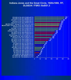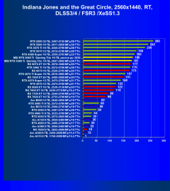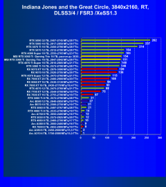 Результаты тестов со включенной аппаратной трассировкой лучей и/или DLSS/FSR/XeSS в разрешениях 1920×1080, 2560×1440 и 3840×2160