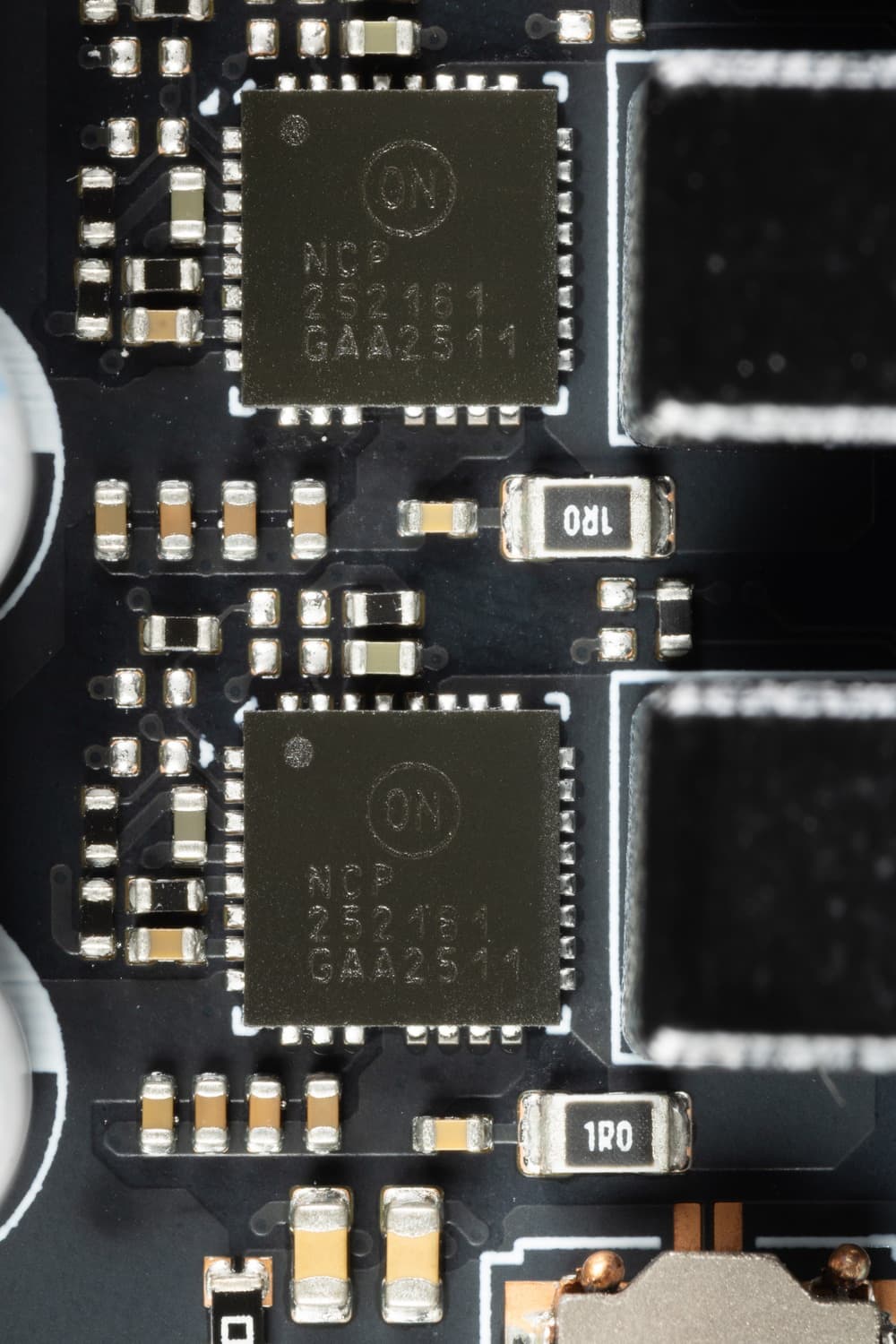 В преобразователе питания ядра используются транзисторные сборки DrMOS — NCP252161 того же производителя On Semi, рассчитанные на 60 А.