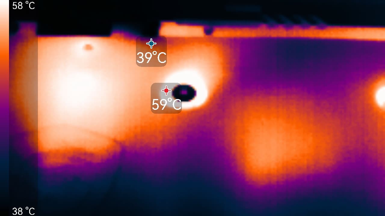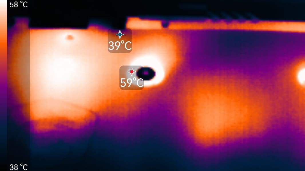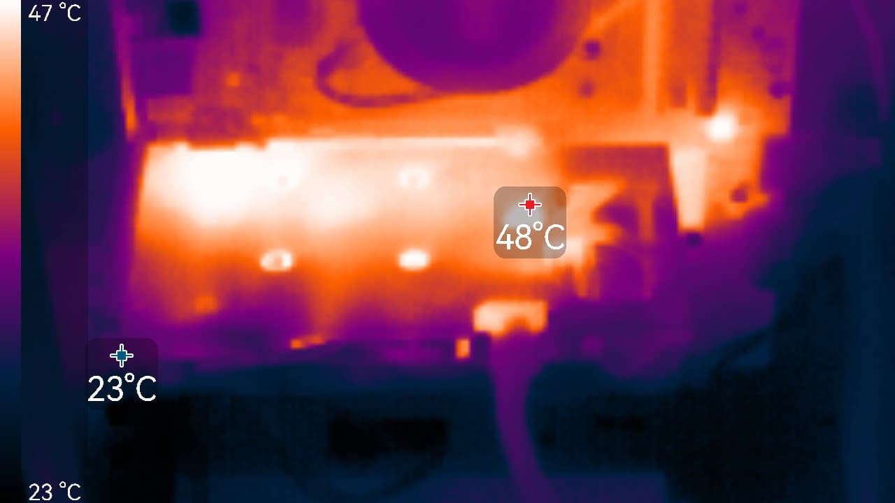 Максимальный нагрев наблюдался в центральной части PCB, а также около разъема PCIe.