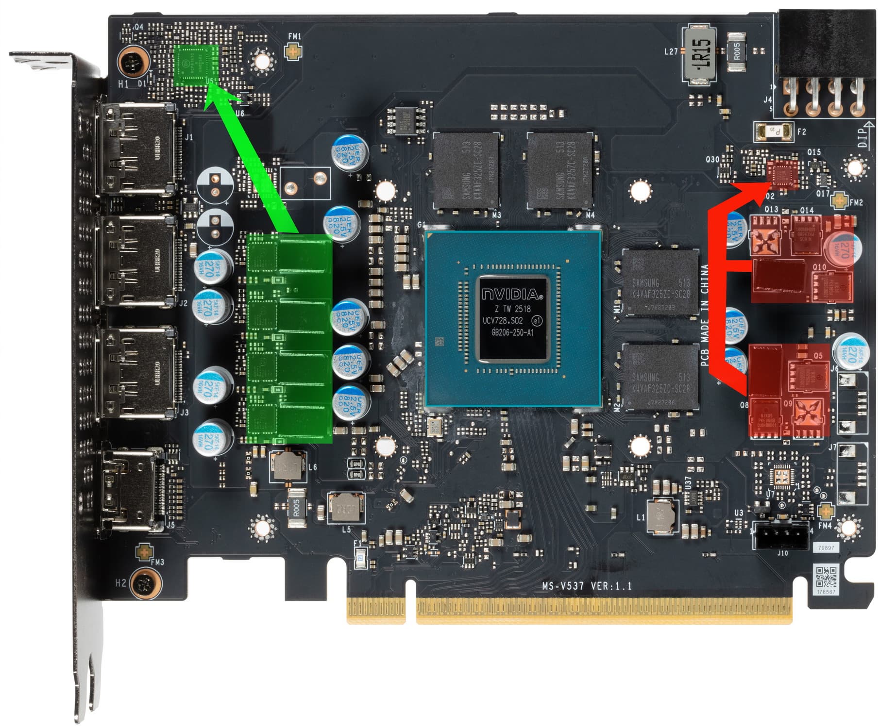 Зеленым цветом отмечена схема питания ядра, красным — памяти. Все ШИМ-контроллеры расположены на лицевой стороне печатной платы.