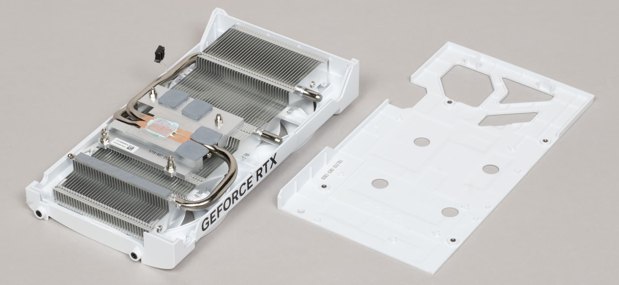 Для охлаждения преобразователей питания VRM ядра имеется своя подошва на радиаторе, а VRM микросхем памяти — без охлаждения. Задняя пластина не участвует в охлаждении и служит элементом защиты PCB.