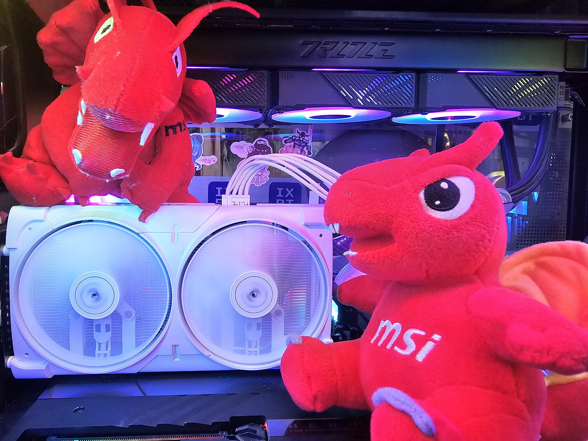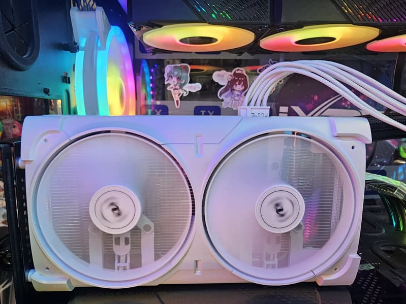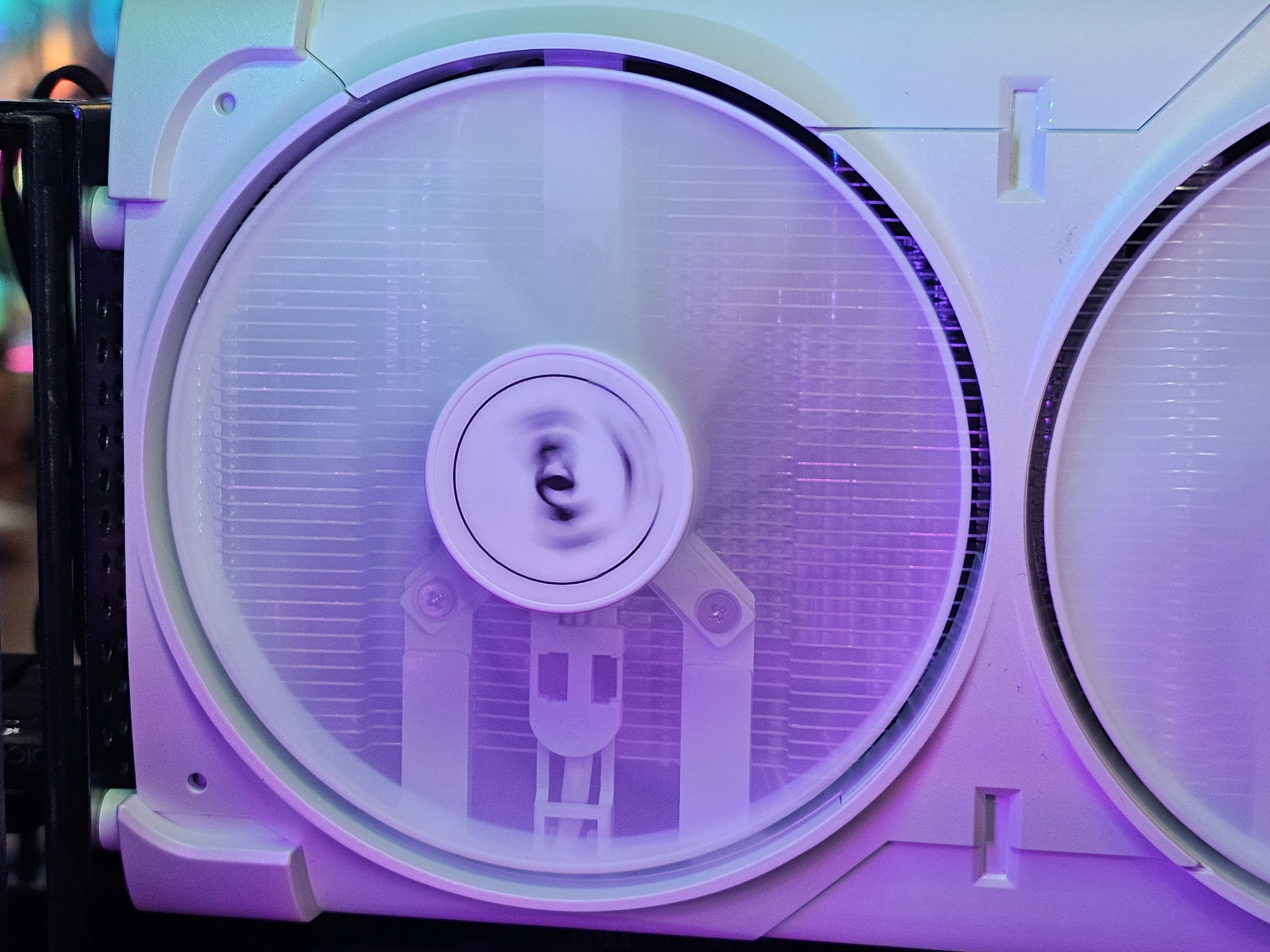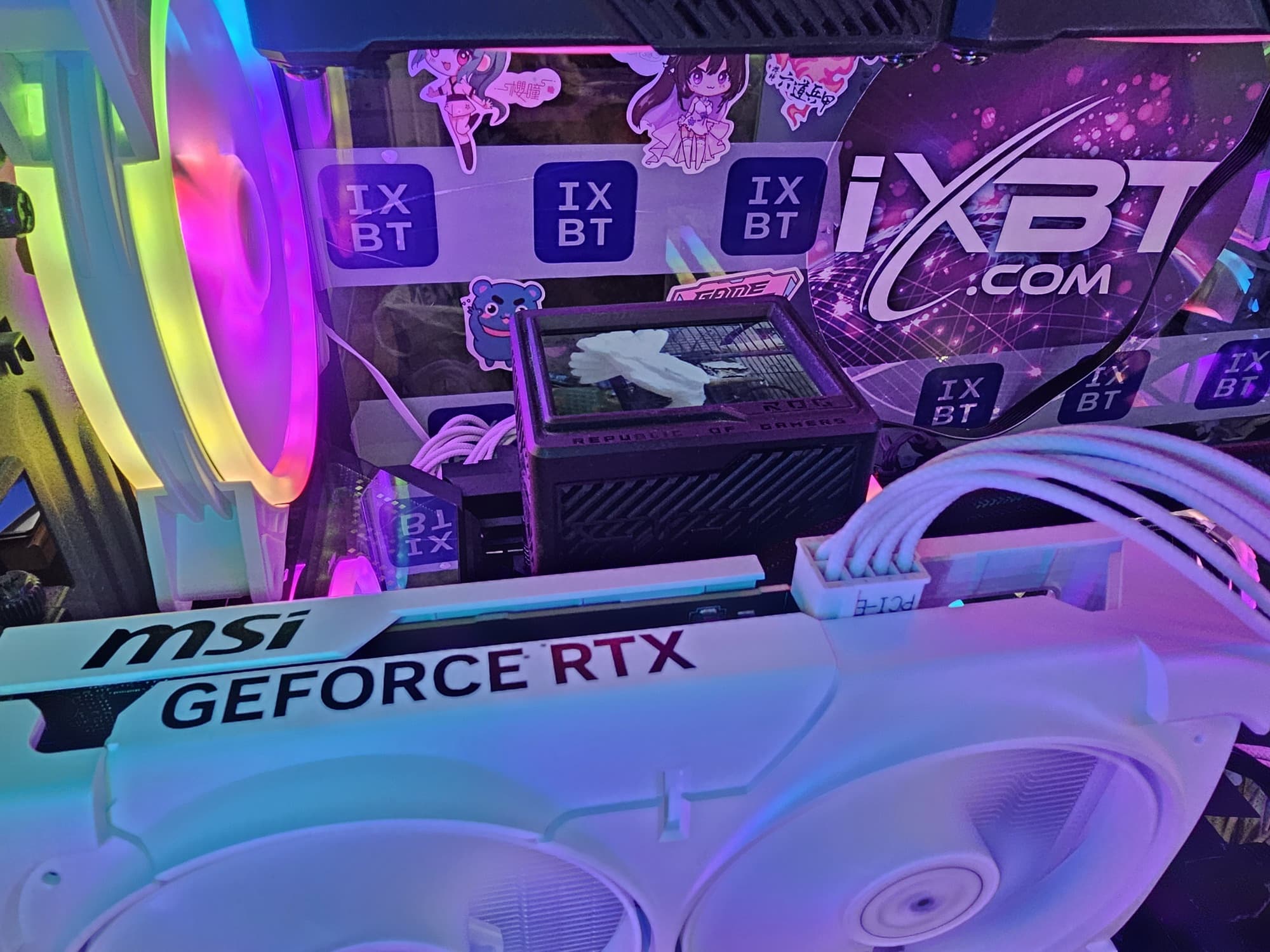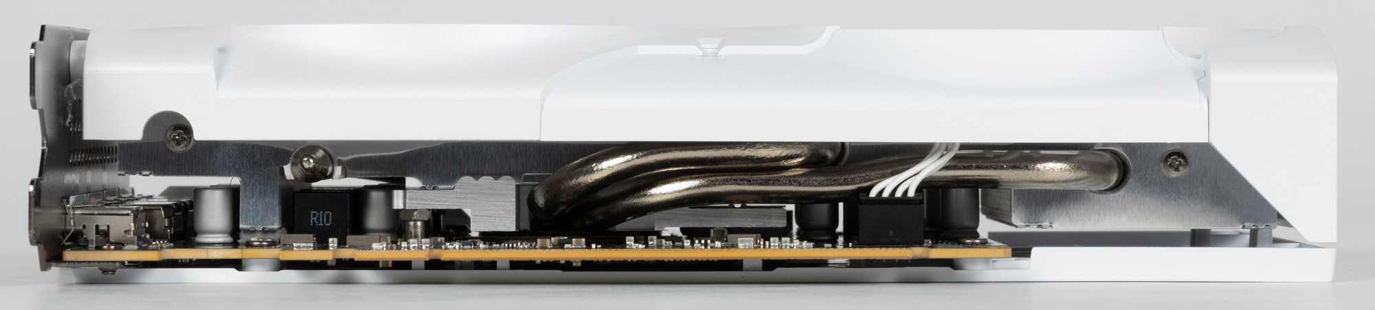 К сожалению, мы не можем сказать, что кулер тихий — его слышно очень хорошо, а особого резерва для снижения частоты вращения вентиляторов нет: нагрев и так лишь на приемлемом уровне. Карта лишена подсветки, но на белом кожухе ее кулера будет отлично смотреться внутренняя подсветка корпуса, и с учетом общего белого окраса она хорошо подойдет владельцам белых ПК.