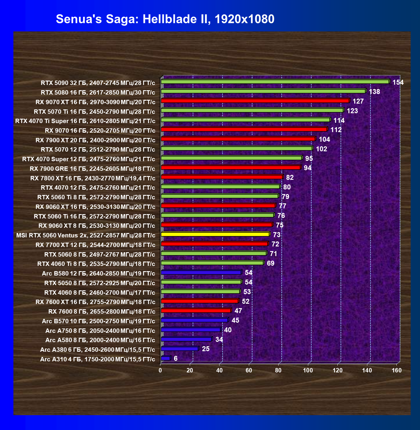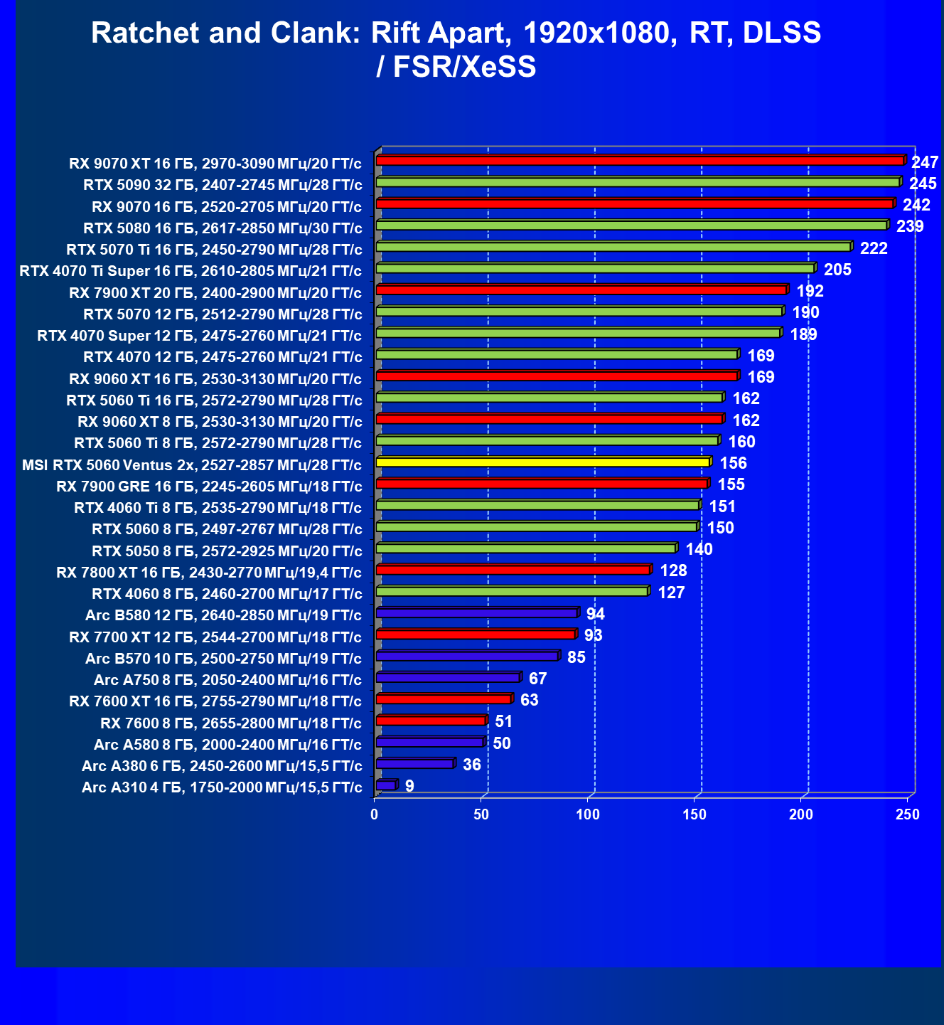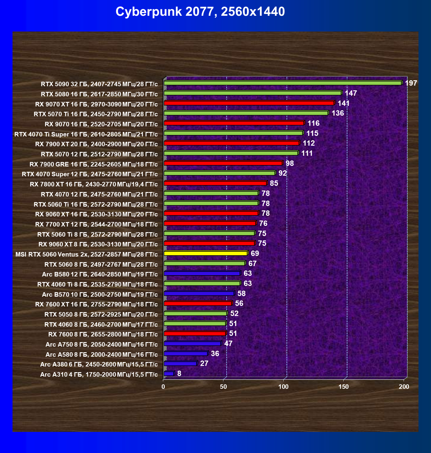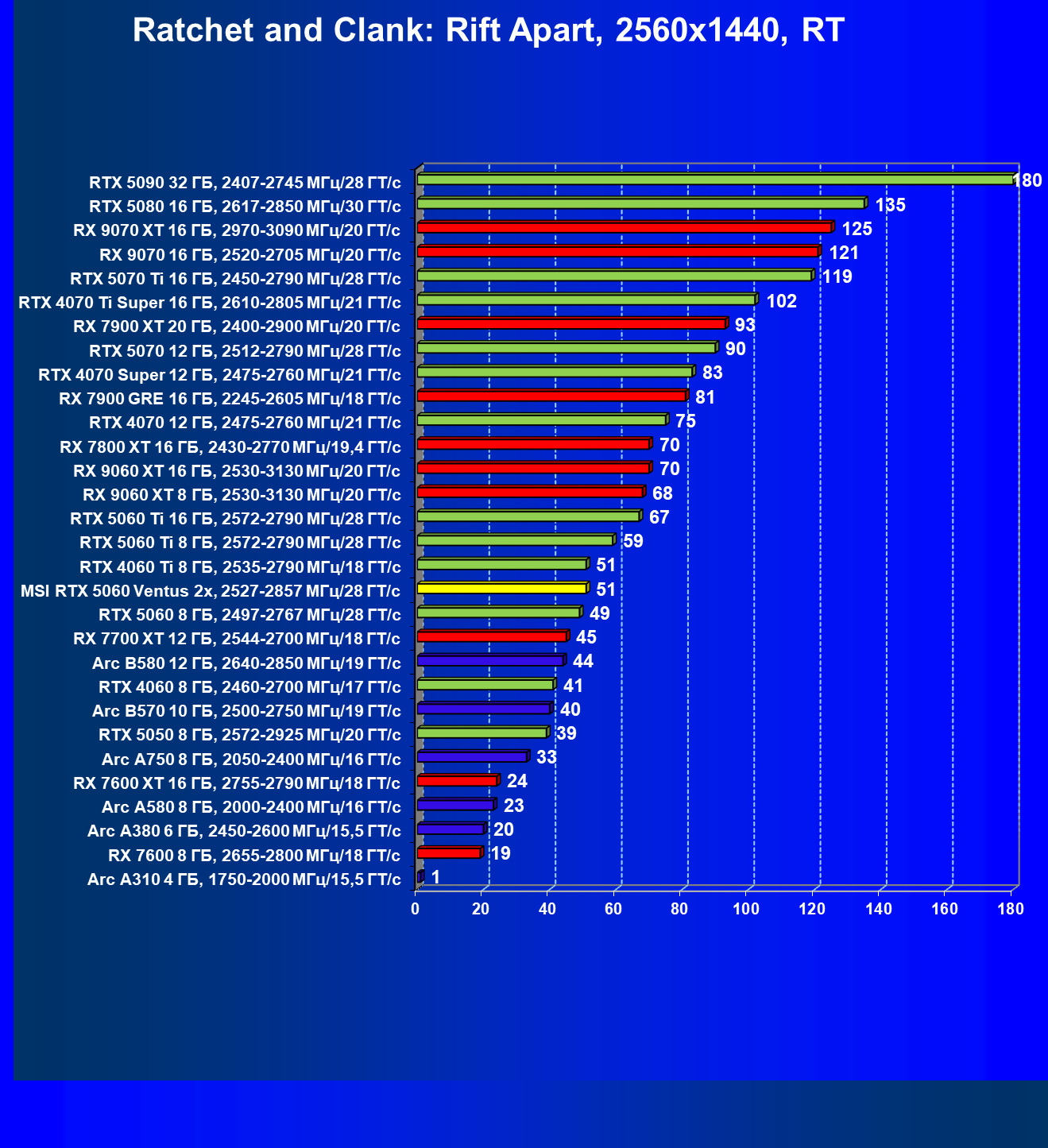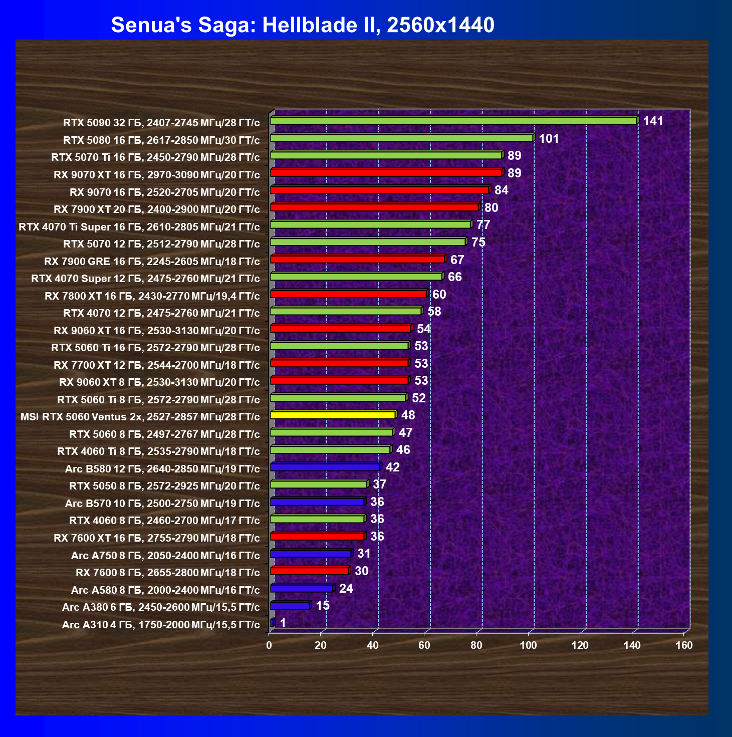 Мы видим, что GeForce RTX 5060 намного быстрее, чем Radeon RX 7600 XT (при этом последний дороже), также опережает GeForce RTX 4060 Ti, Arc B580 (однако последний сильно дешевле).