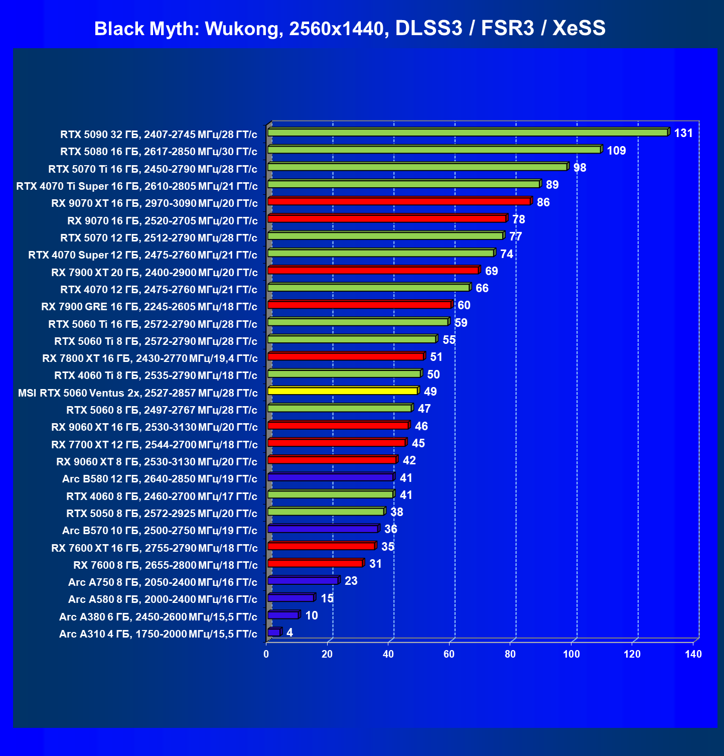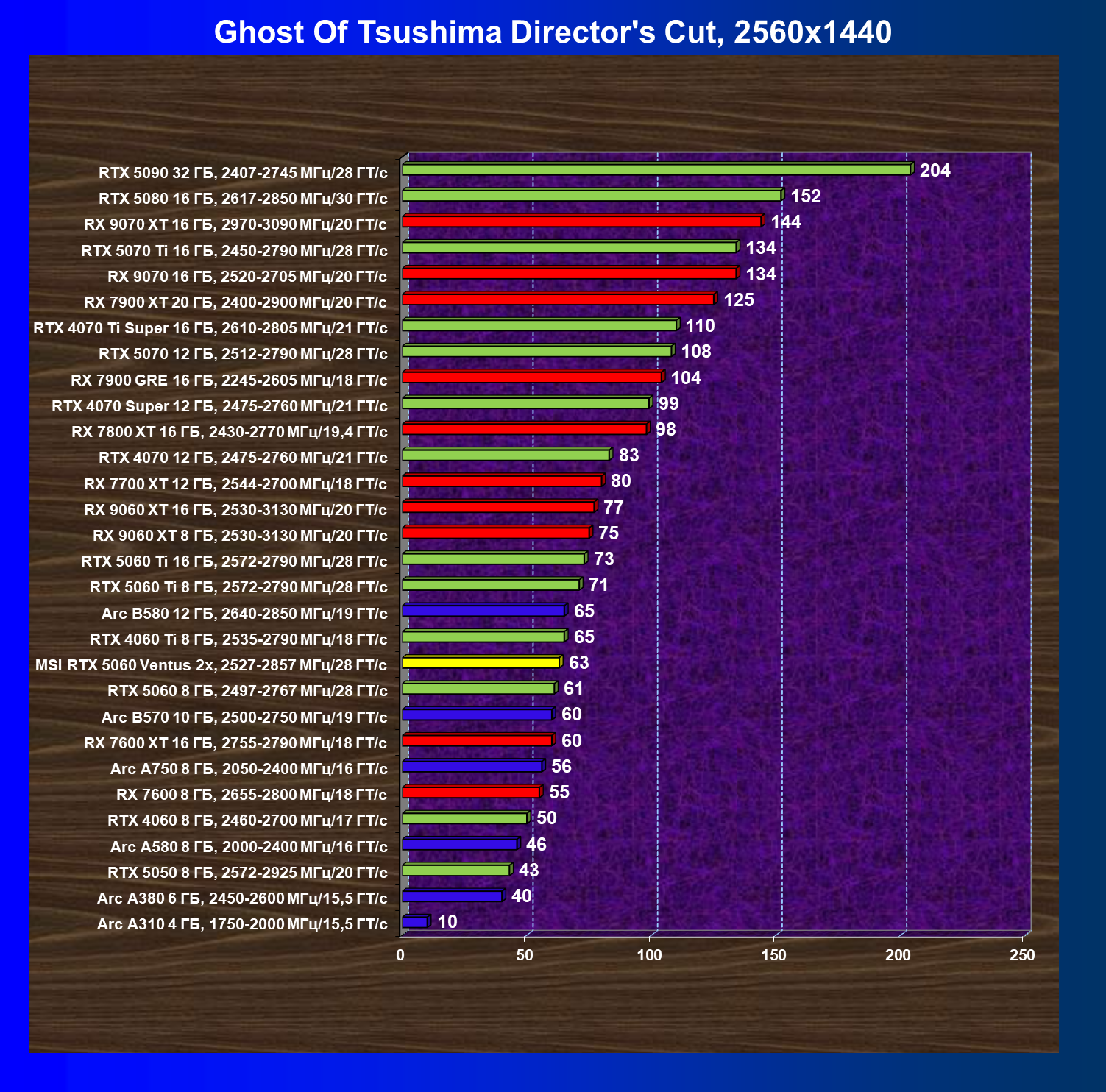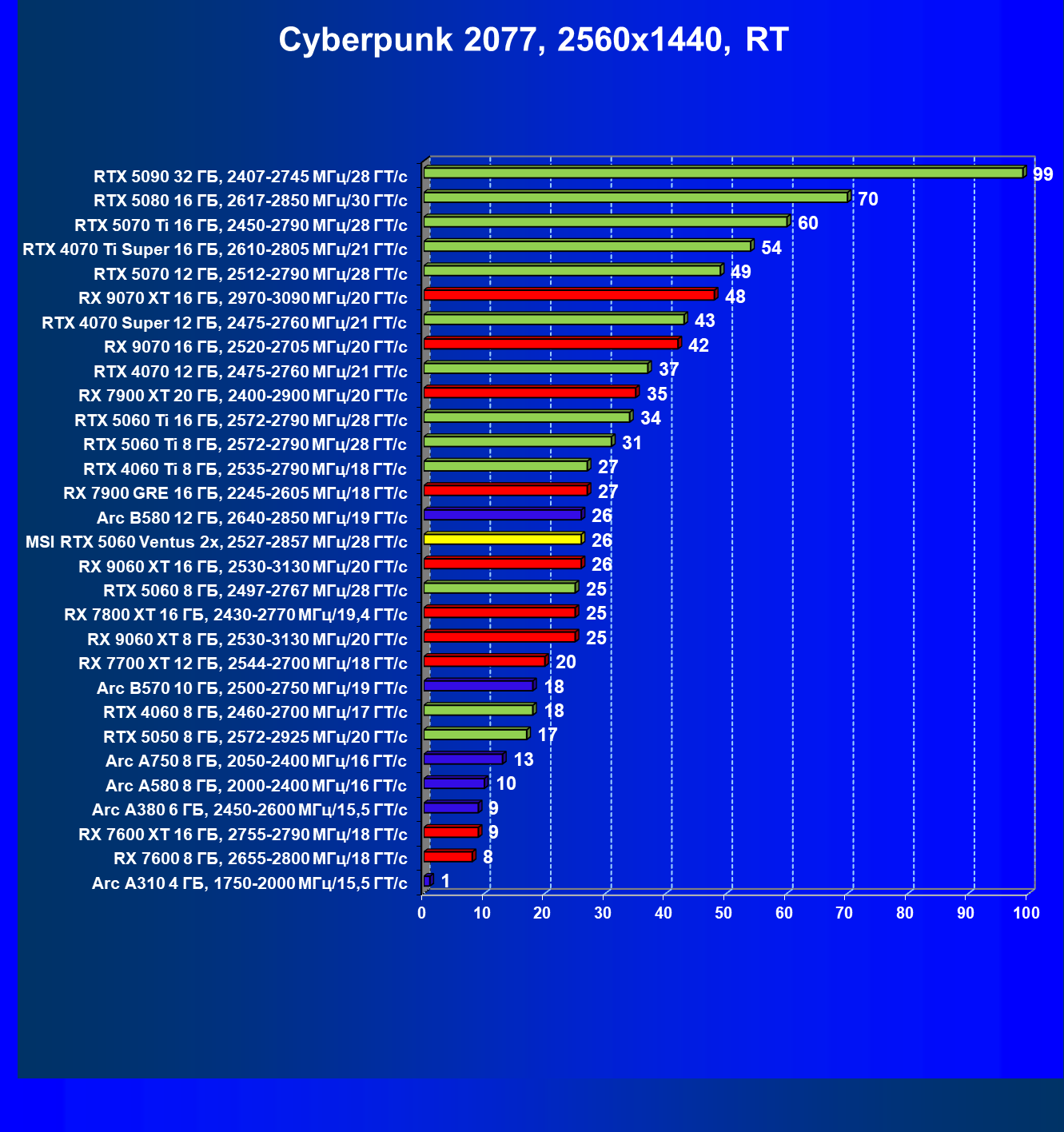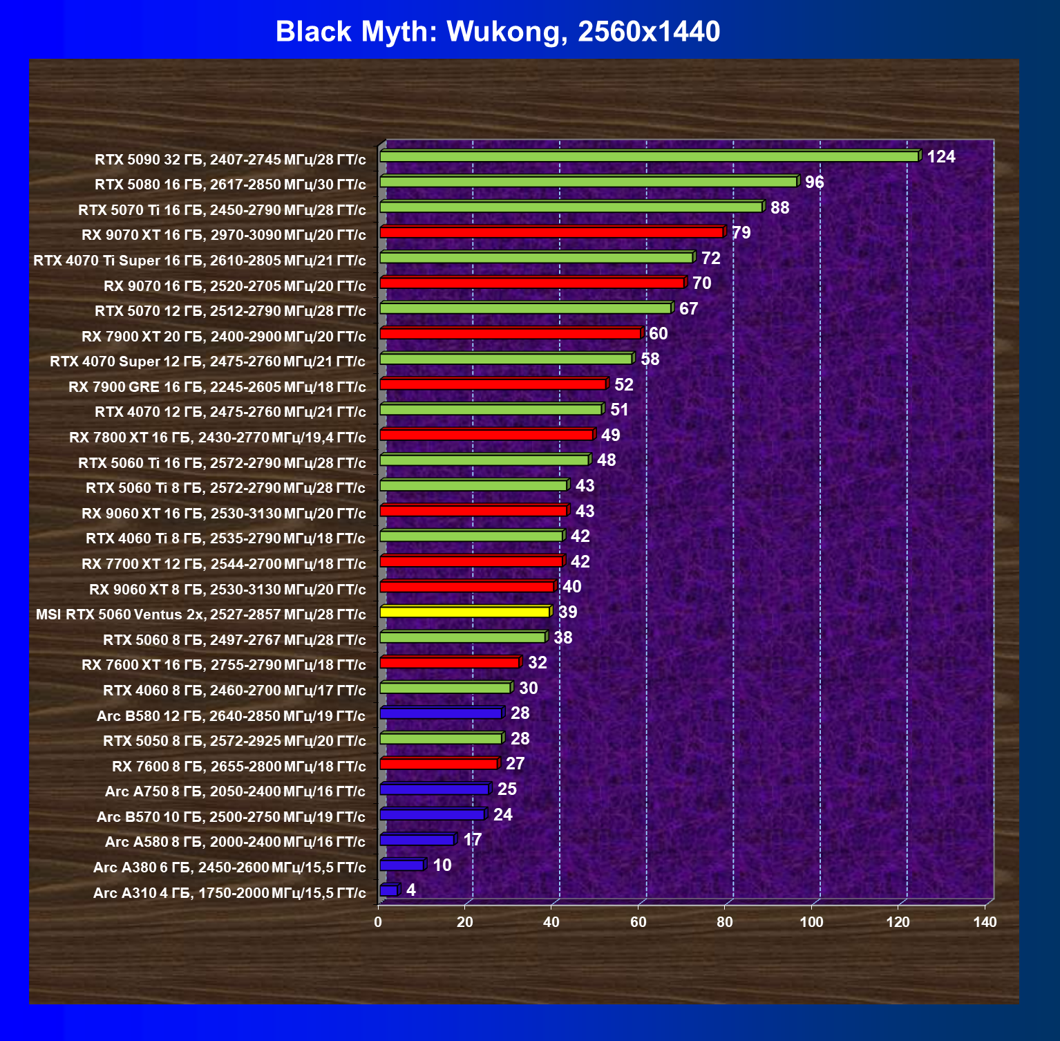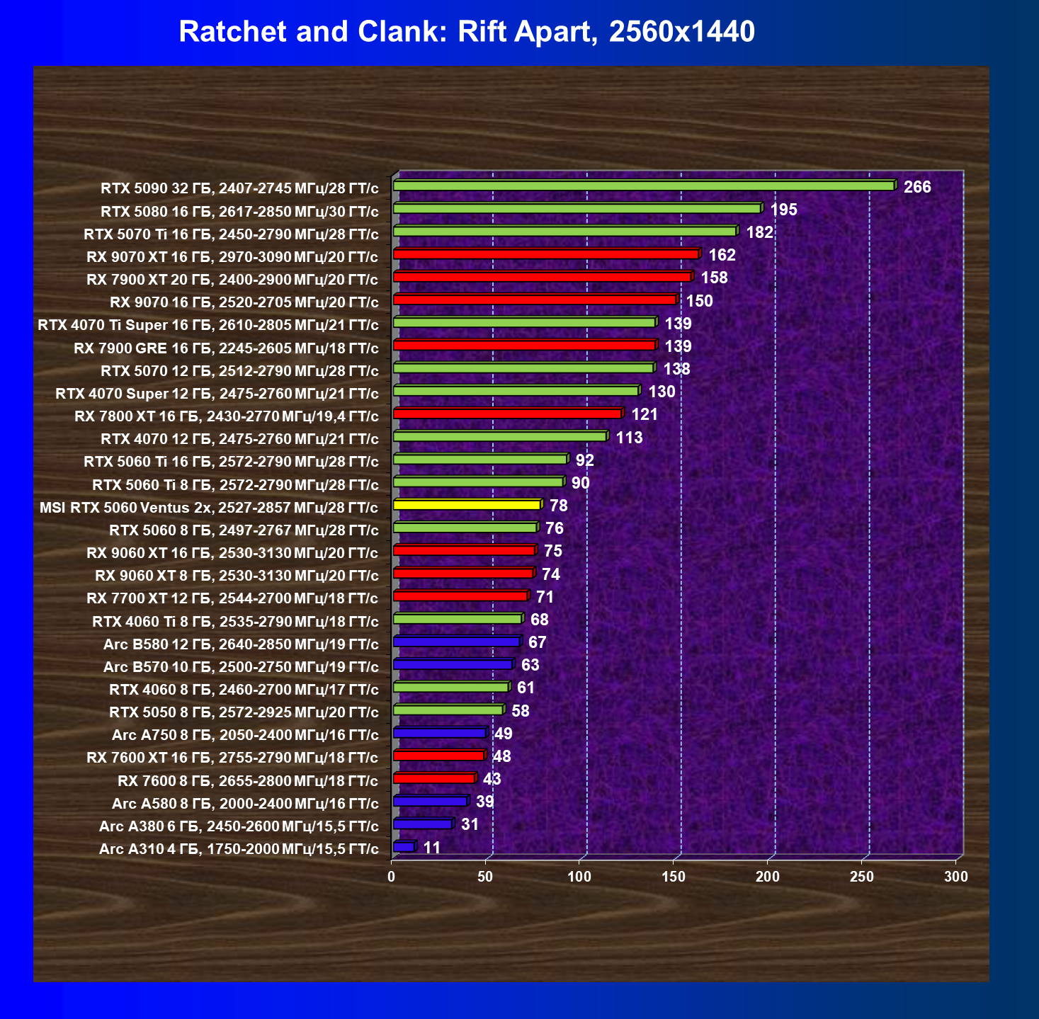 Мы видим, что GeForce RTX 5060 намного быстрее, чем Radeon RX 7600 XT (при этом последний дороже), также опережает GeForce RTX 4060 Ti, Arc B580 (однако последний сильно дешевле).