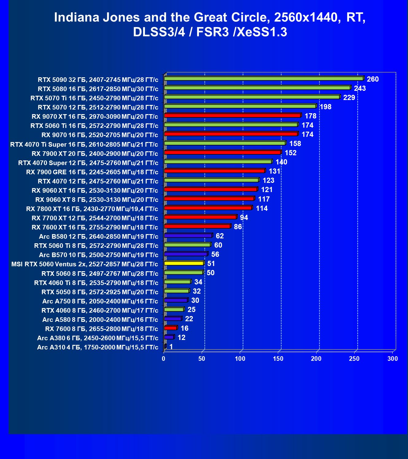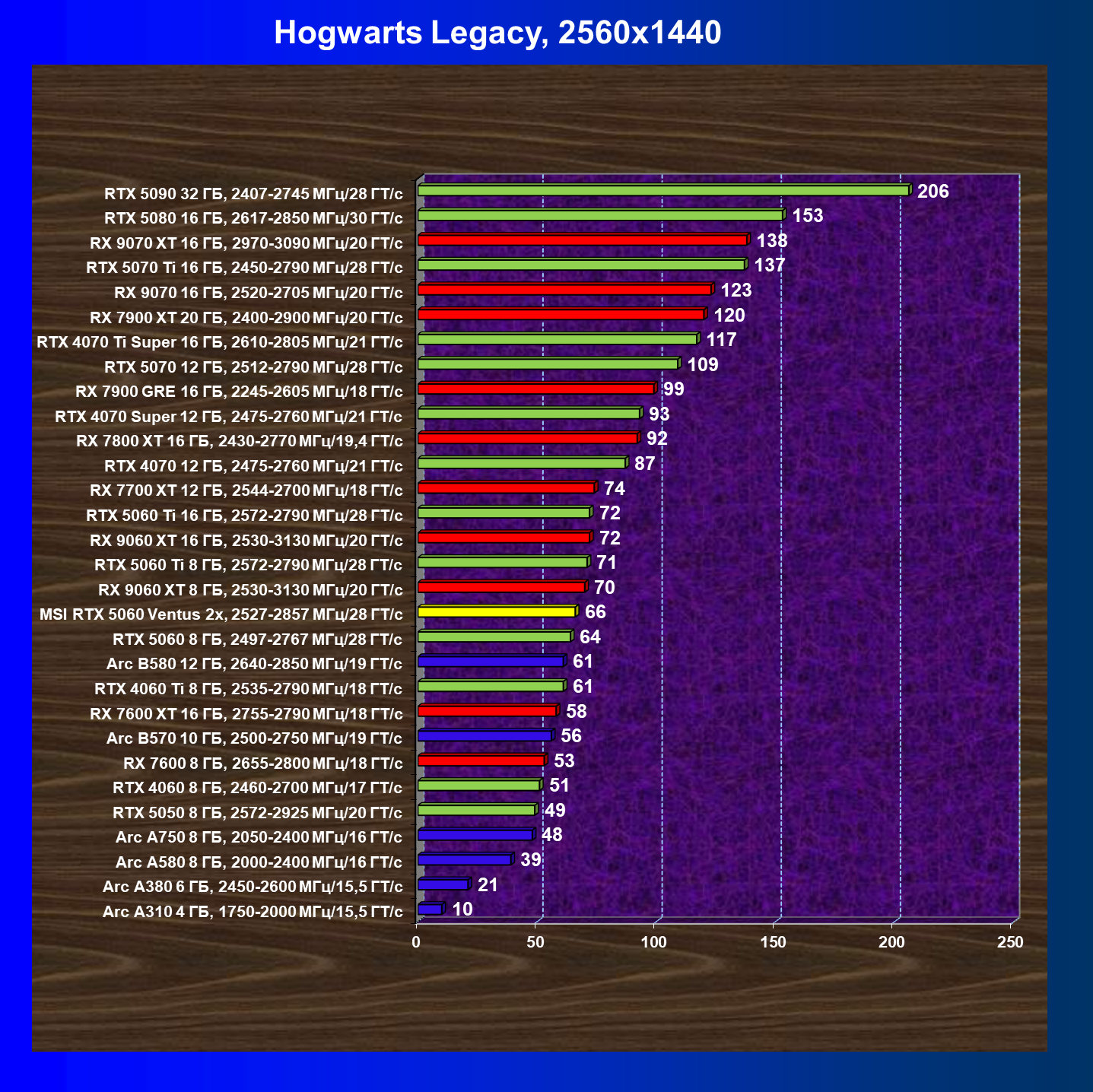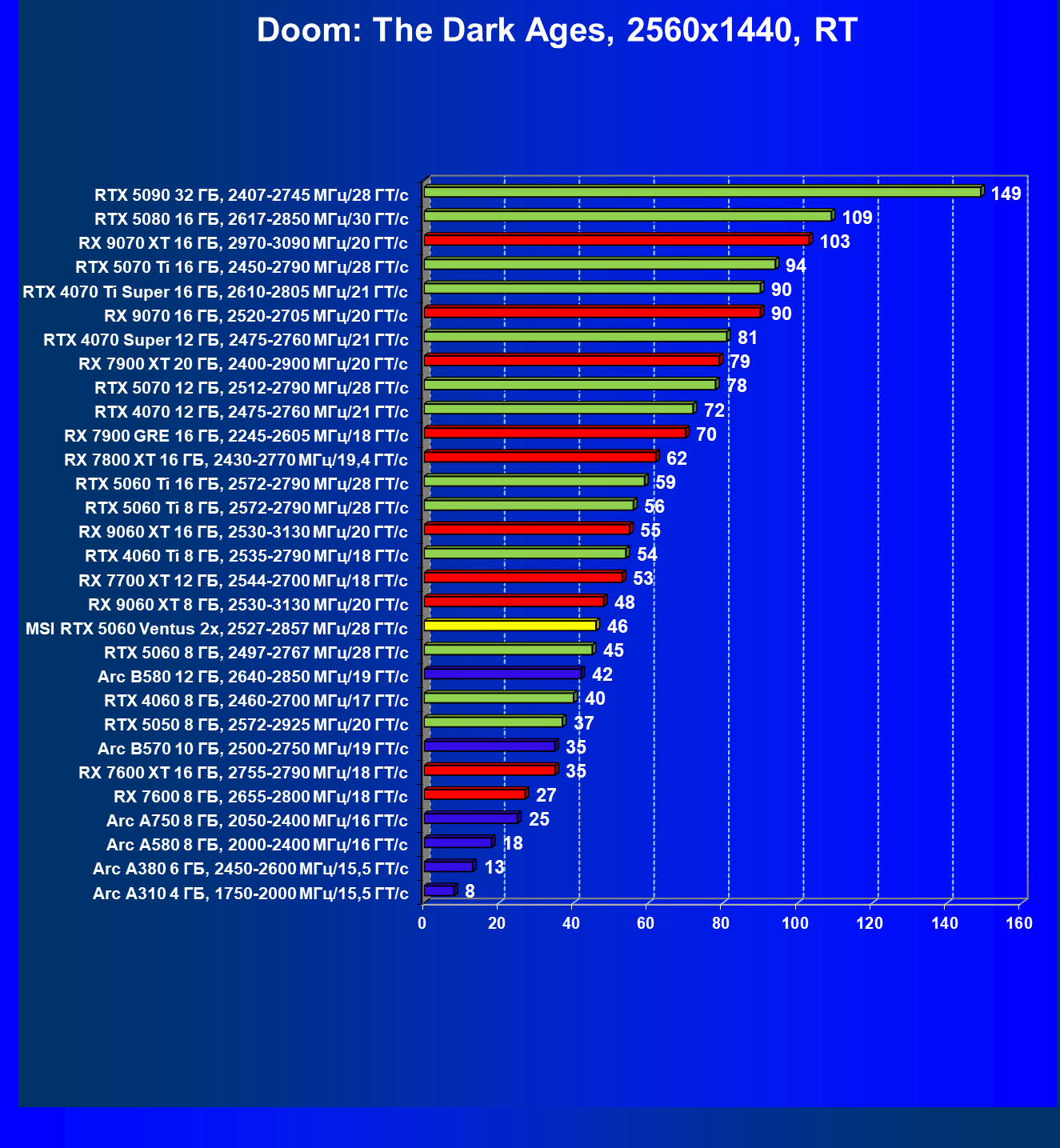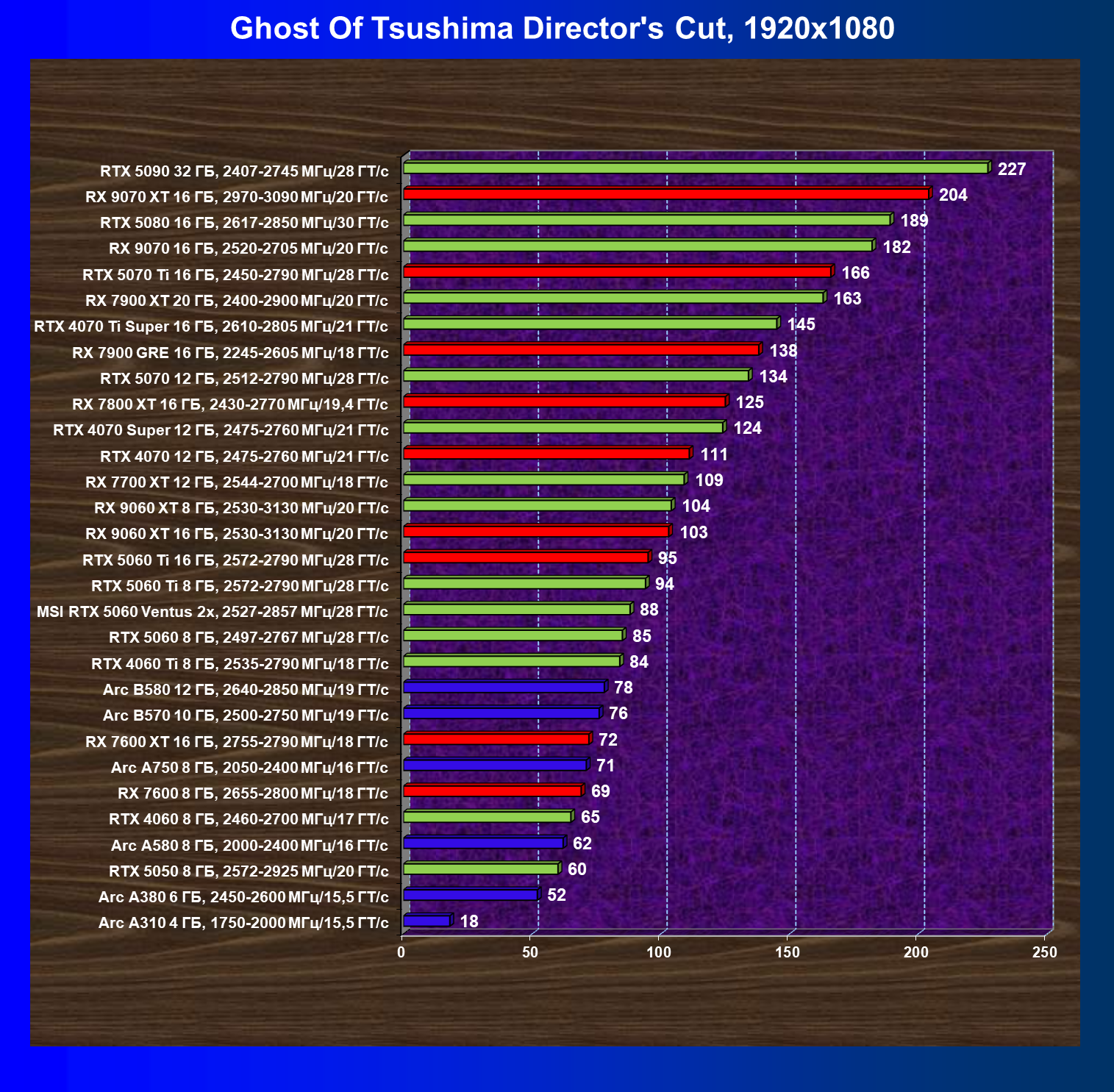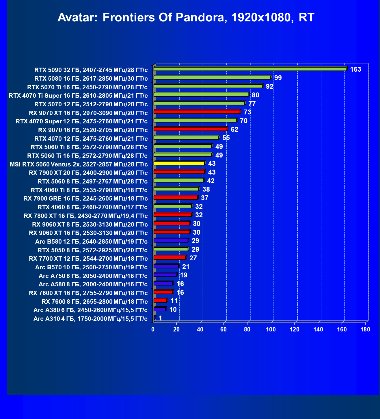Мы видим, что GeForce RTX 5060 намного быстрее, чем Radeon RX 7600 XT (при этом последний дороже), также опережает GeForce RTX 4060 Ti, Arc B580 (однако последний сильно дешевле).