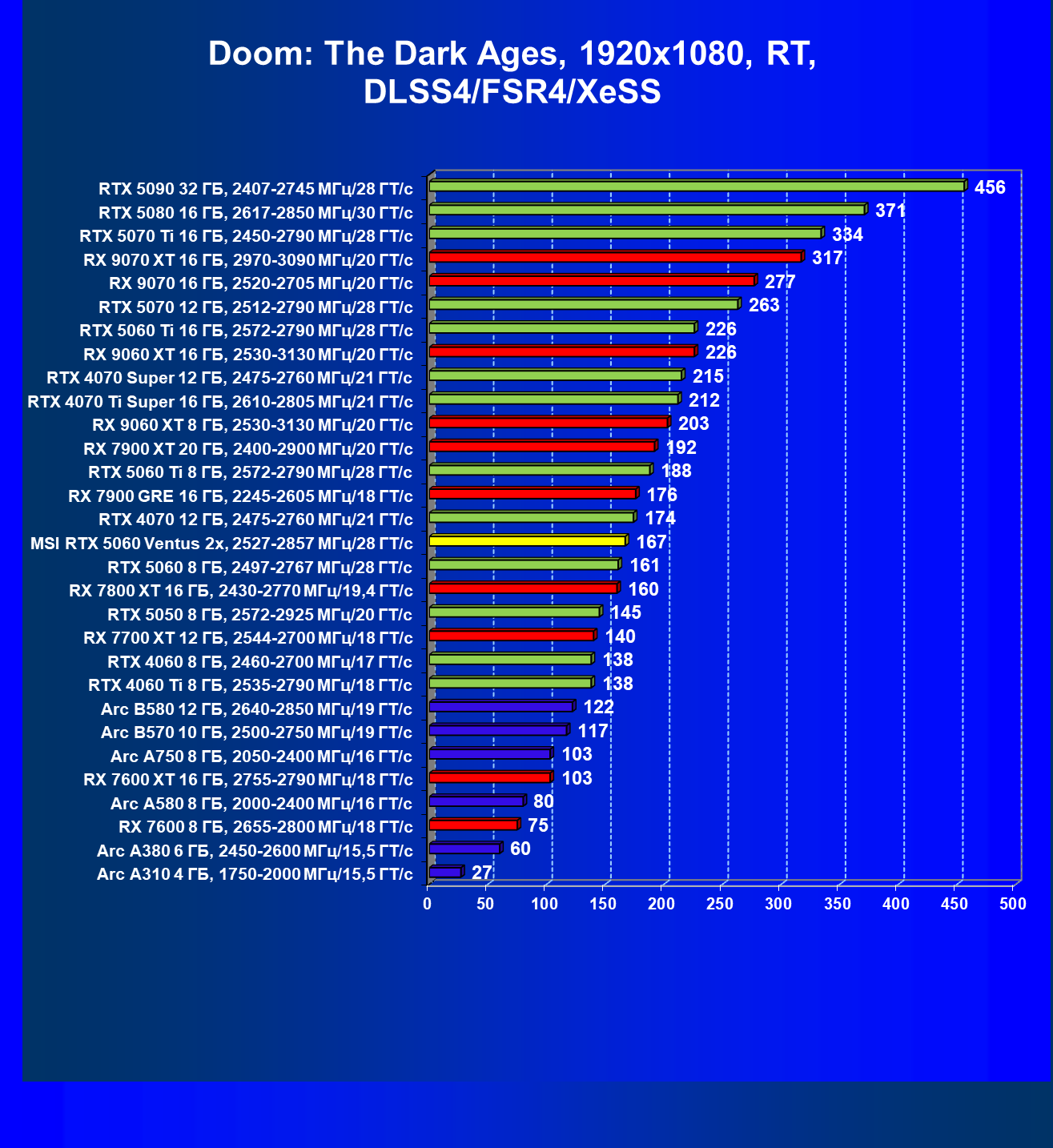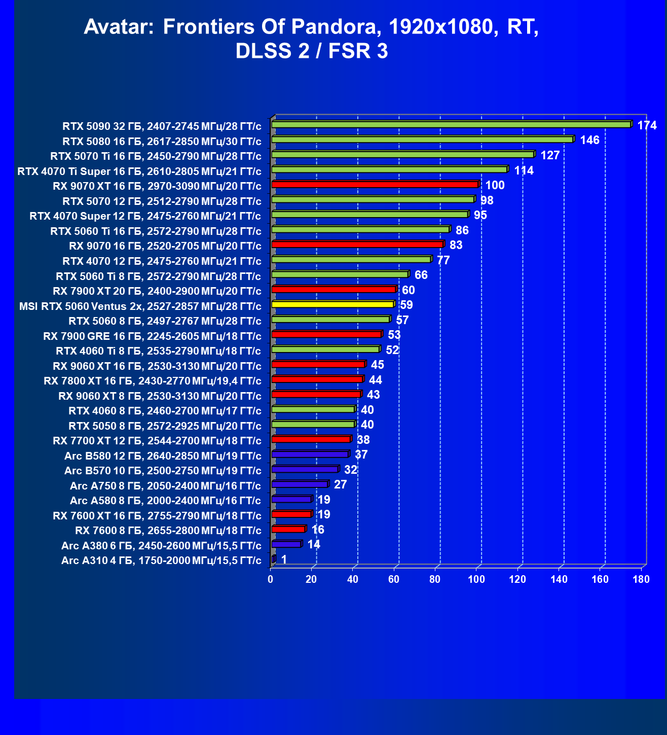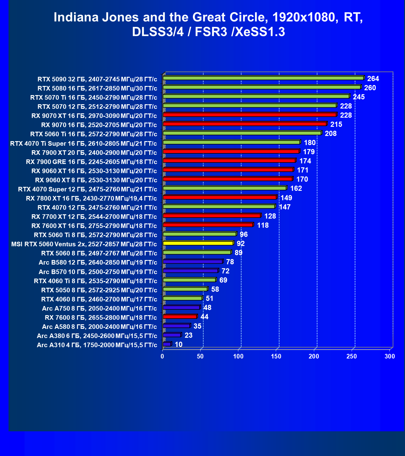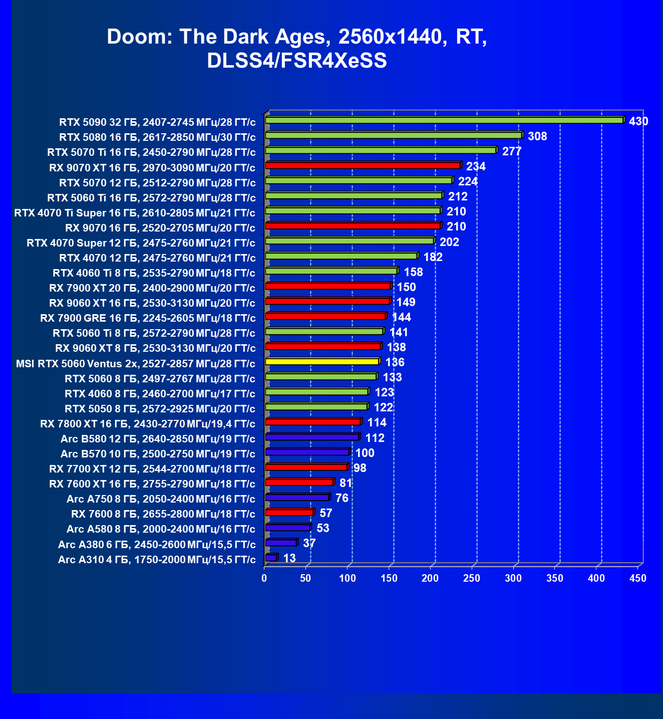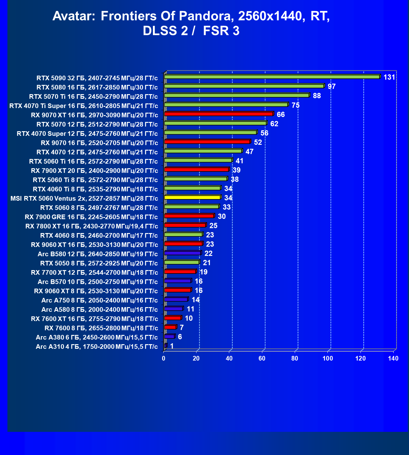 Мы видим, что GeForce RTX 5060 намного быстрее, чем Radeon RX 7600 XT (при этом последний дороже), также опережает GeForce RTX 4060 Ti, Arc B580 (однако последний сильно дешевле).