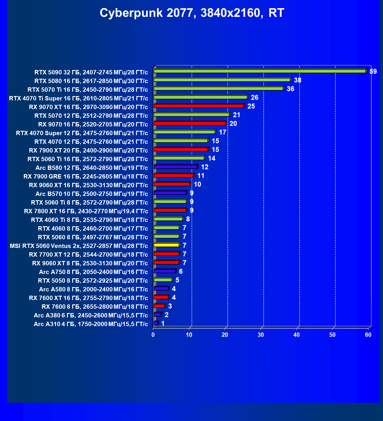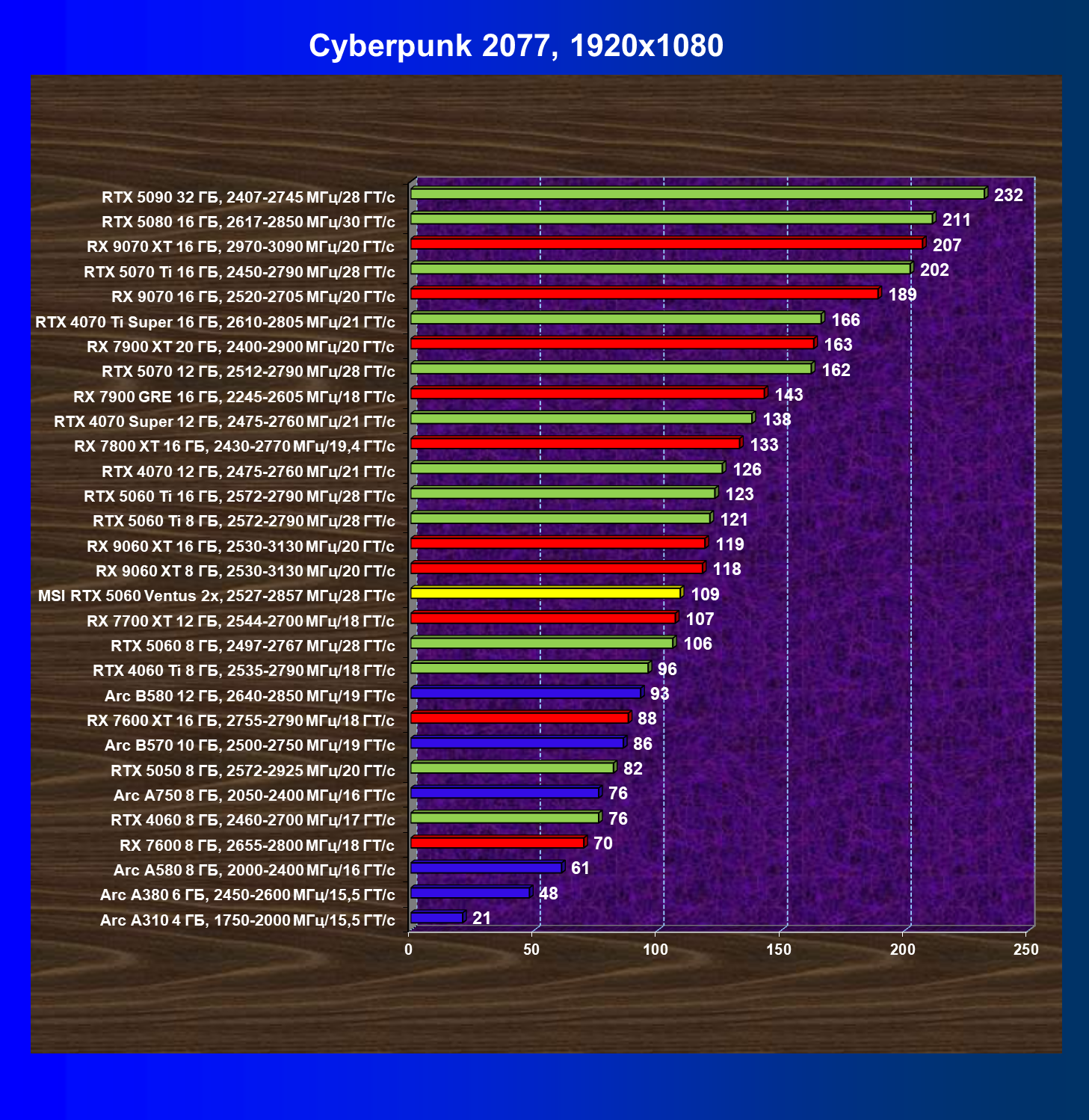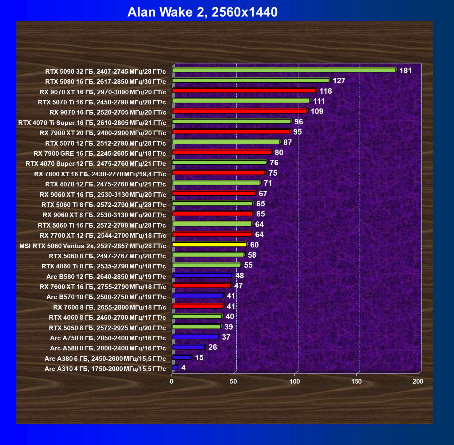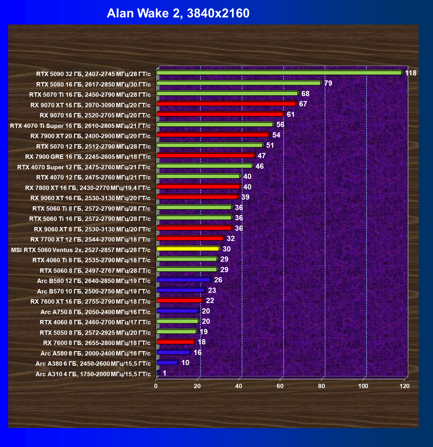 | 05 | MSI RTX 5060 Ventus 2x, 2527—2857 МГц/28 ГТ/с | 181 | 598 | 33 000 |