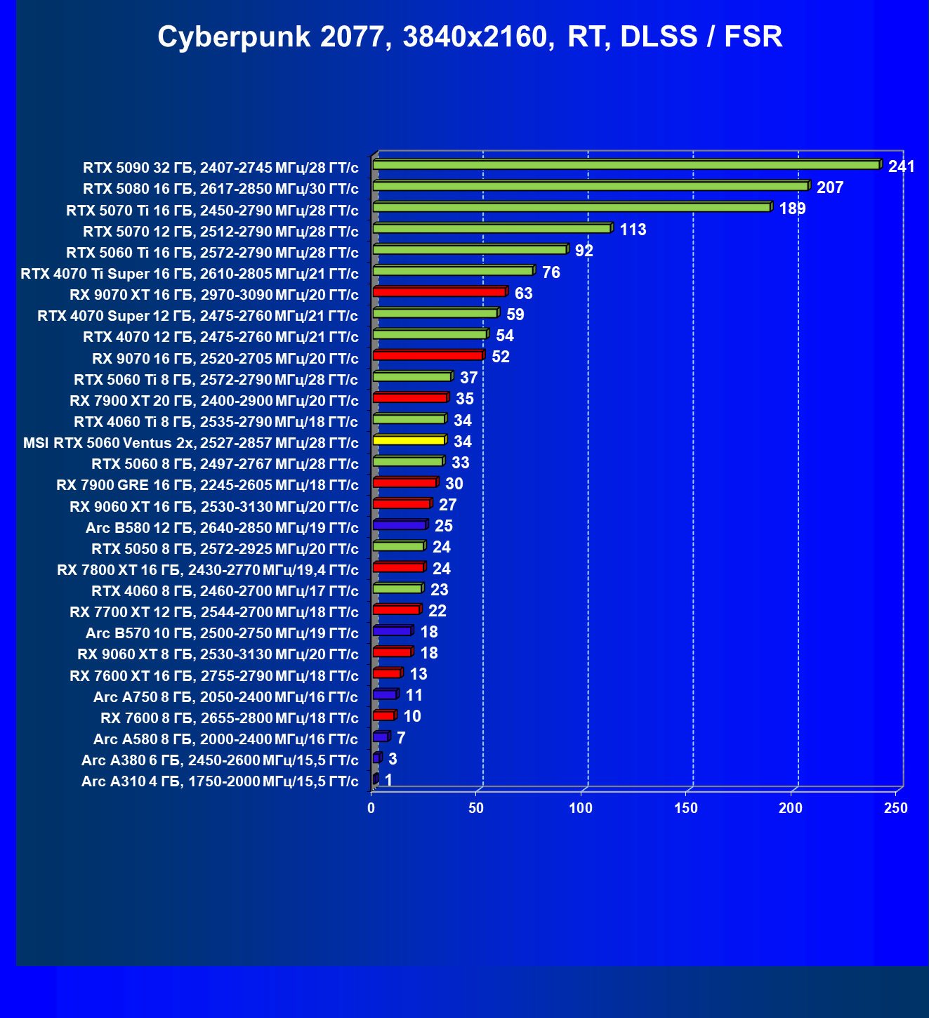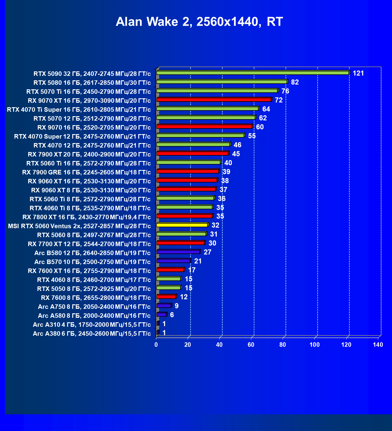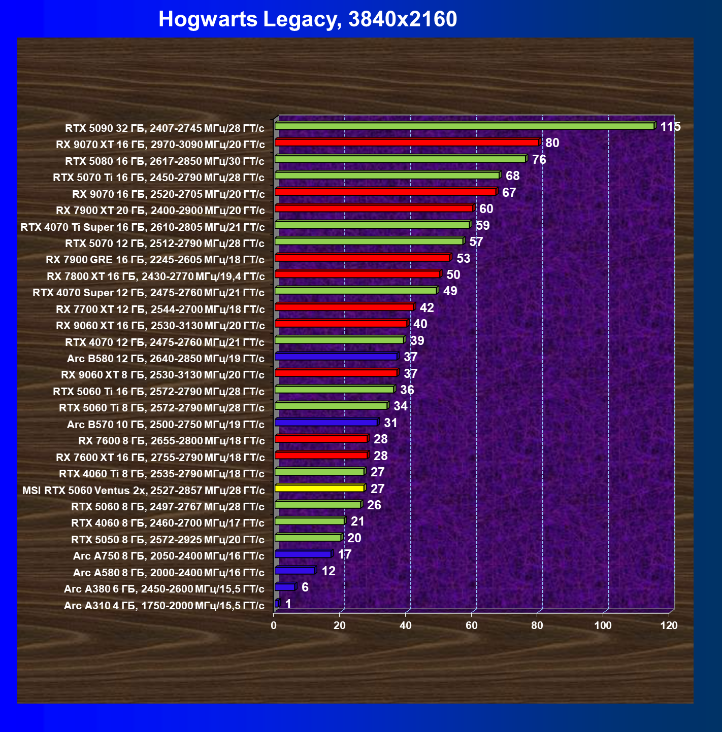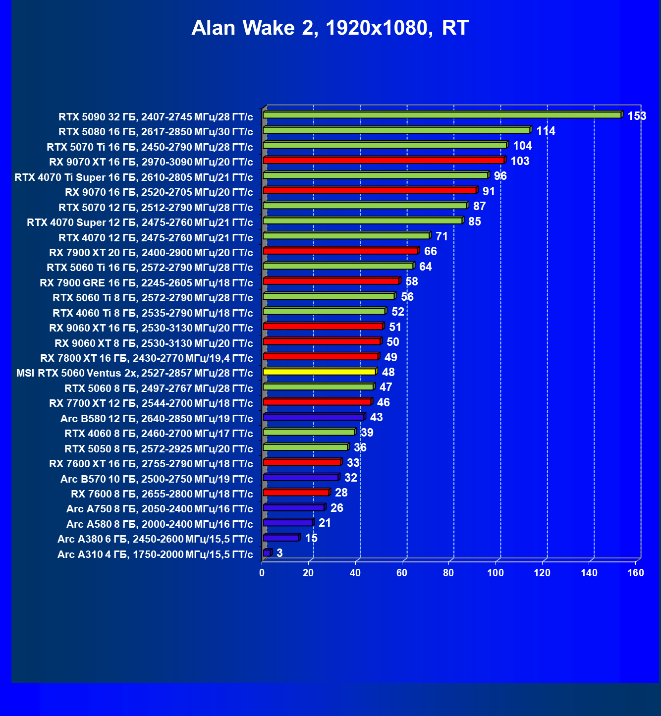 | 05 | MSI RTX 5060 Ventus 2x, 2527—2857 МГц/28 ГТ/с | 181 | 598 | 33 000 |