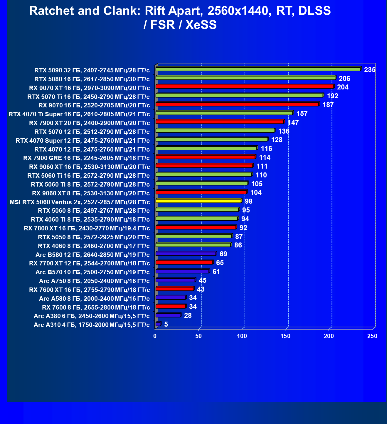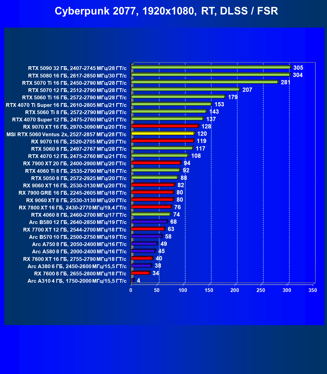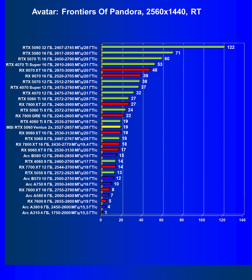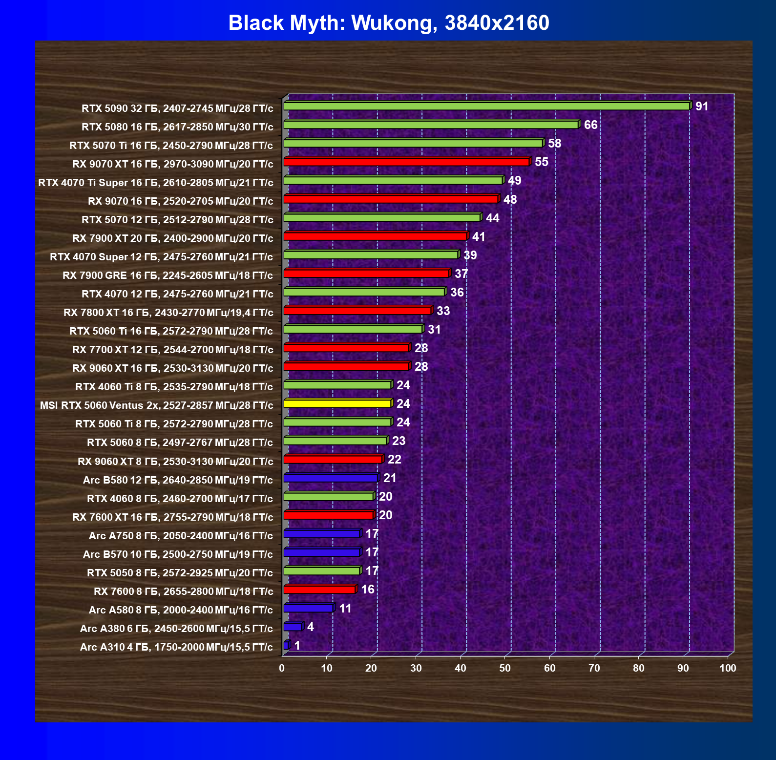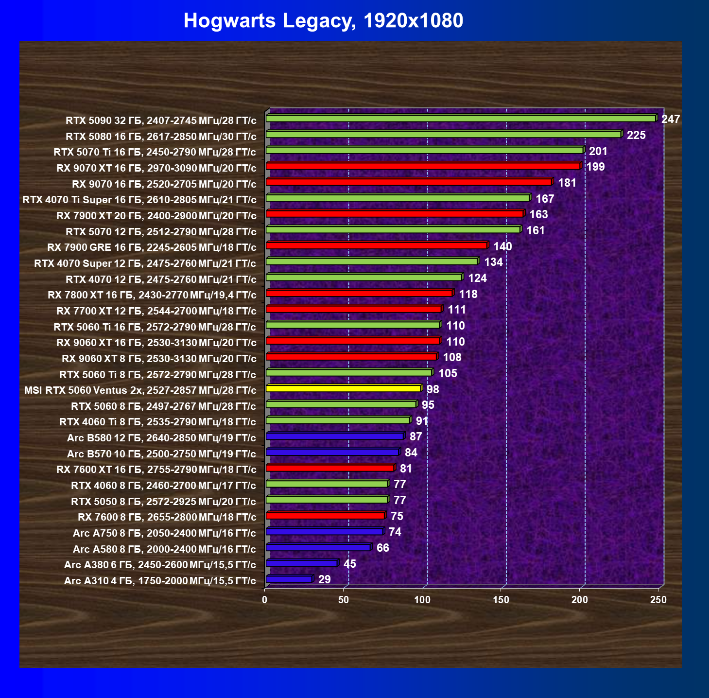 | 05 | MSI RTX 5060 Ventus 2x, 2527—2857 МГц/28 ГТ/с | 181 | 598 | 33 000 |