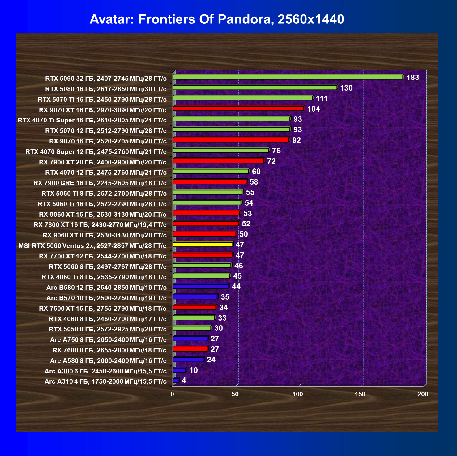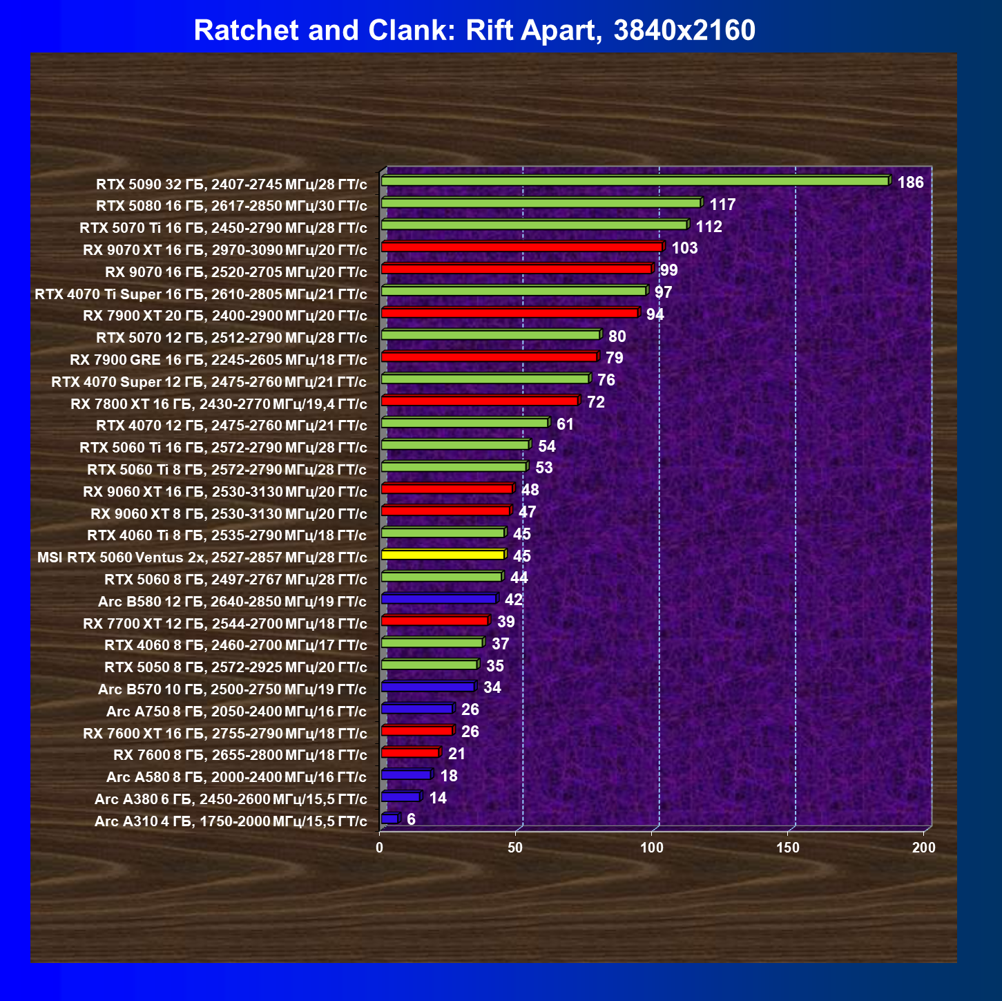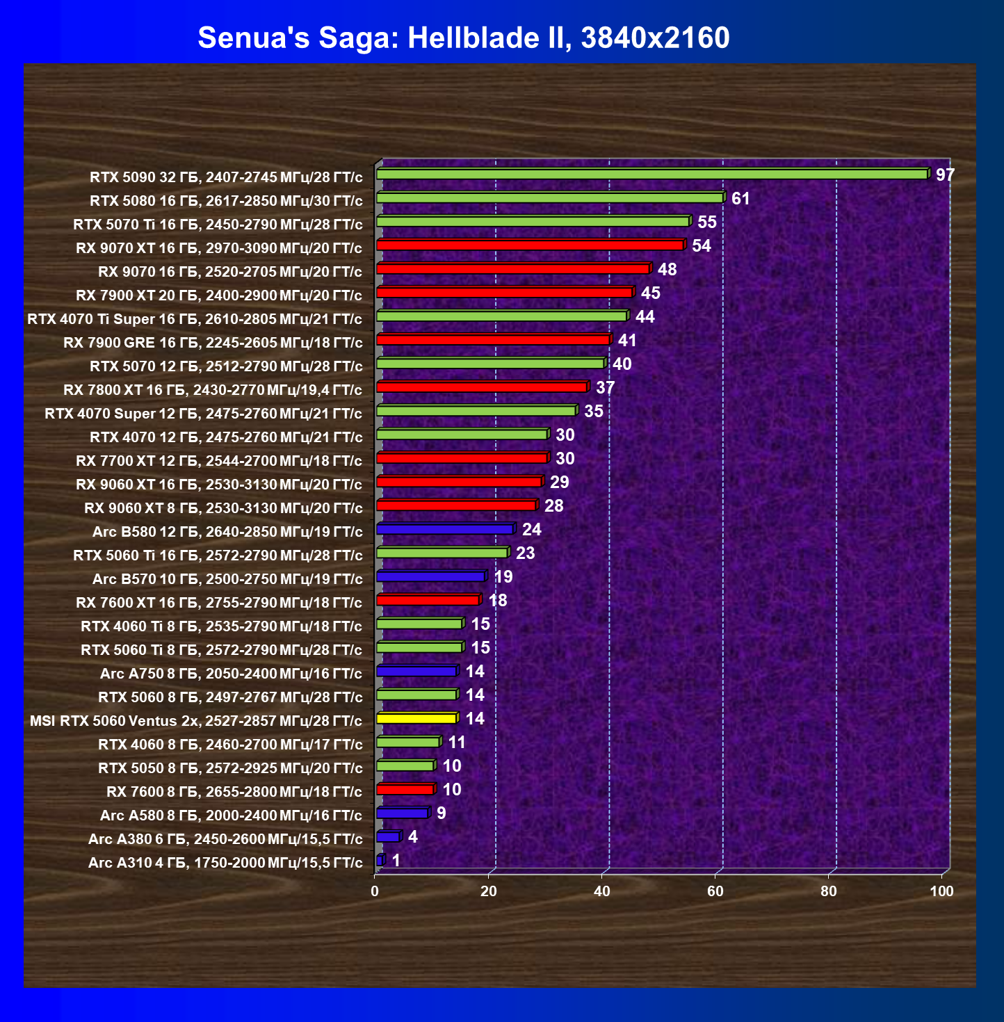 | 05 | RX 9060 XT 8 ГБ, 2530—3130 МГц/20 ГТ/с | 389 | 1324 | 34 000 |