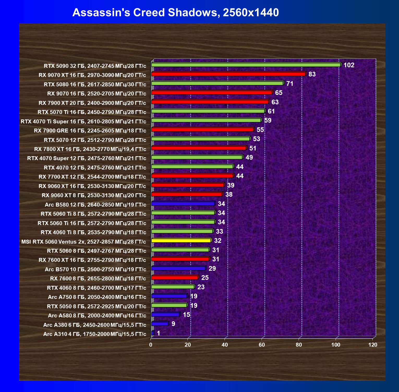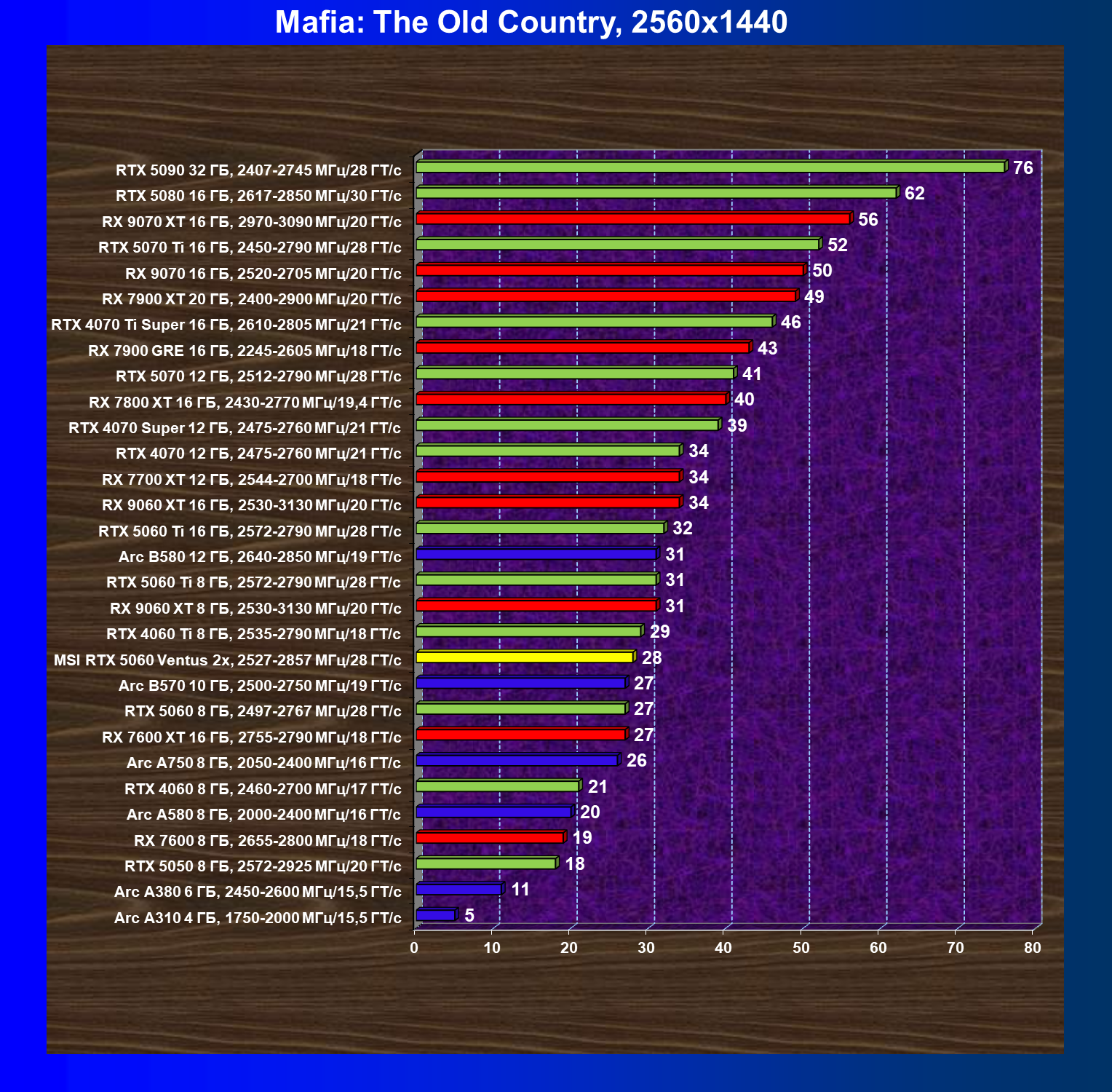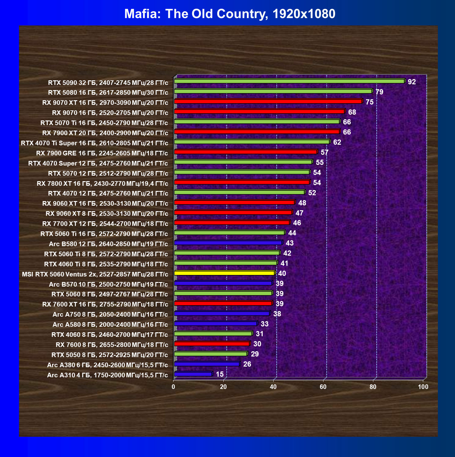 Напомню, что в данном рейтинге учитываются только результаты в играх без включения RT и DLSS, в целом в классических играх RTX 5060 смотрится очень хорошо!