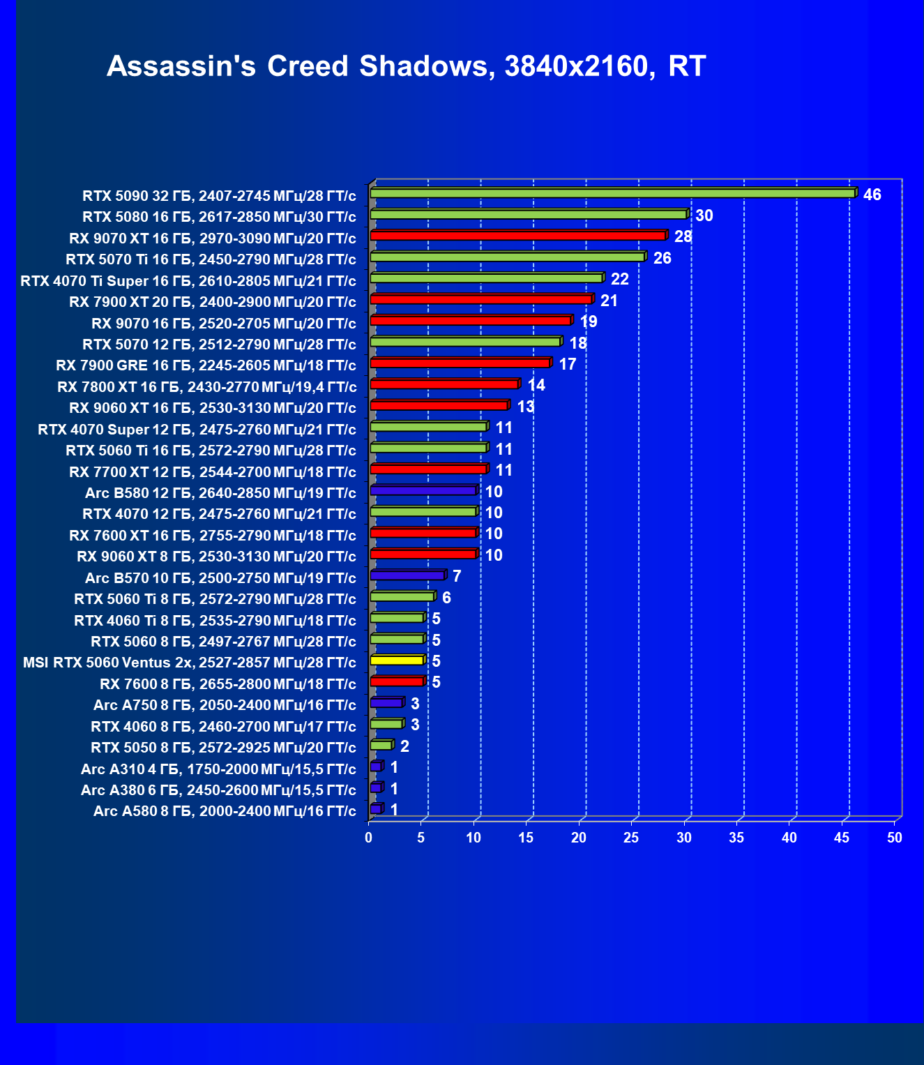 | 21 | Arc B580 12 ГБ, 2640—2850 МГц/19 ГТ/с | 510 | 387 | 28 000 |