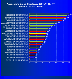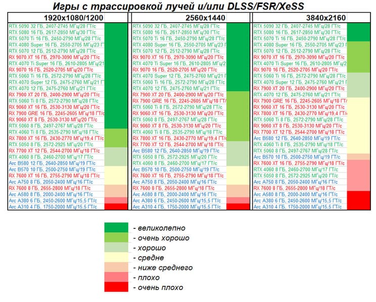 Если включить RT, то во все игры точно так же можно играть с высокими настройками графики в разрешении 1080p (Full HD), но динамическое масштабирование (DLSS или FSR/XeSS) будет при этом обязательным. В разрешении 1440p (2.5K) хорошую играбельность можно получить только в играх, поддерживающих DLSS 4 (за счет MFG).