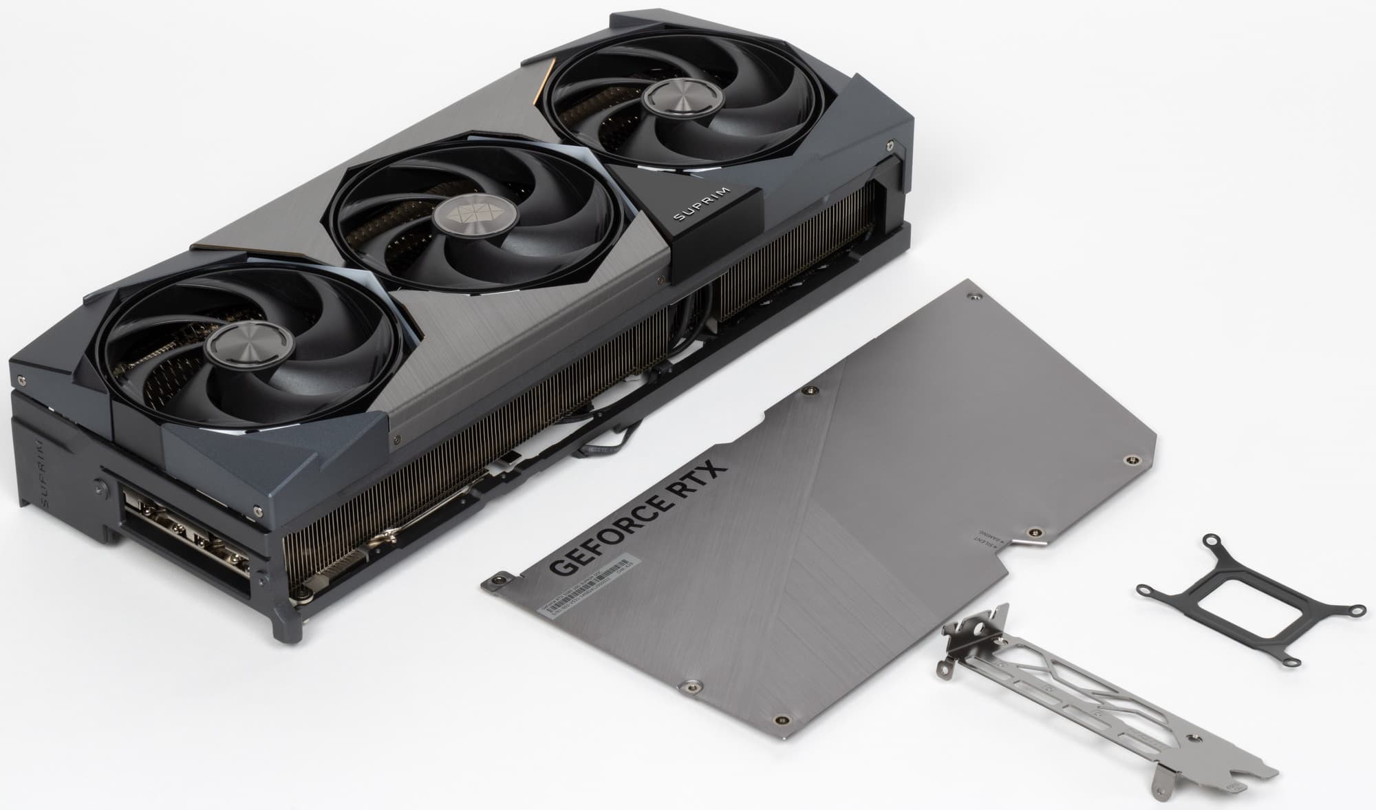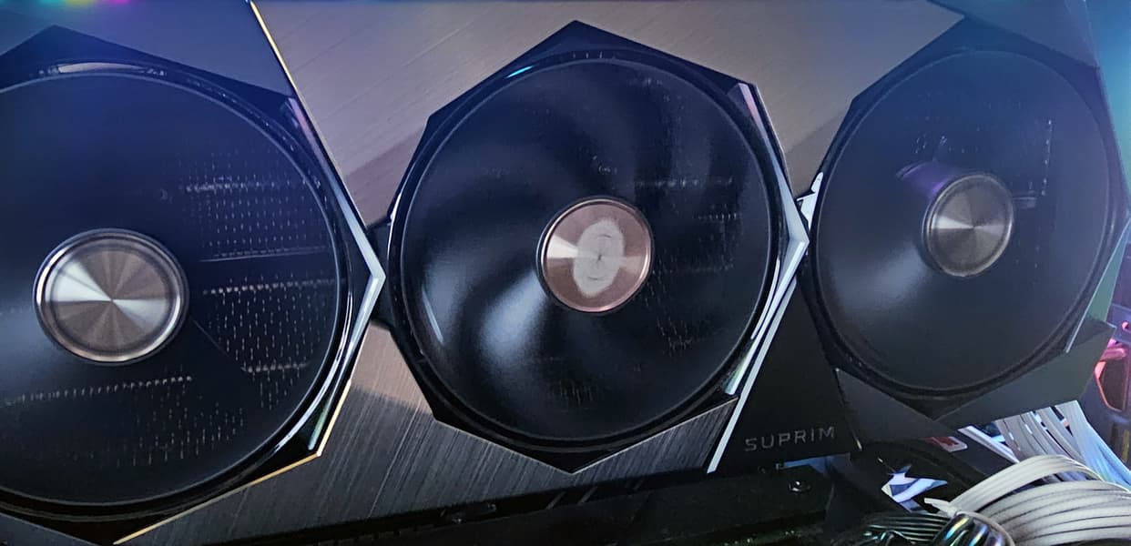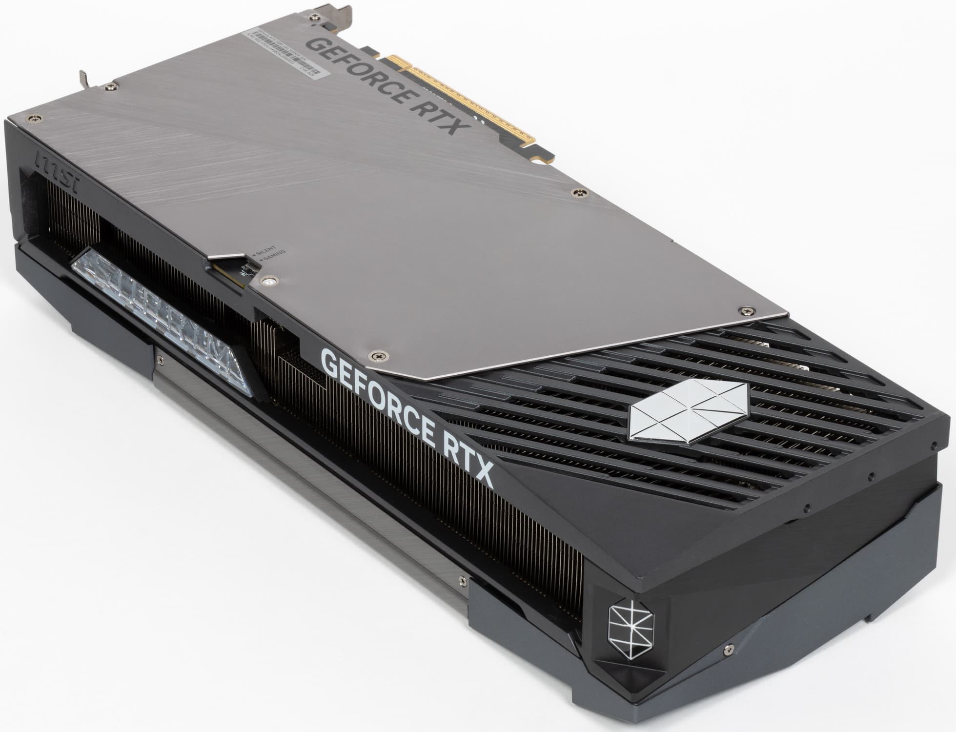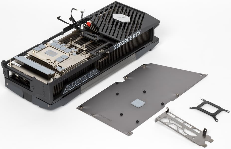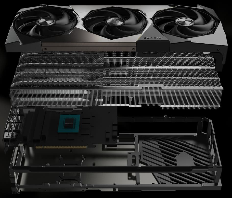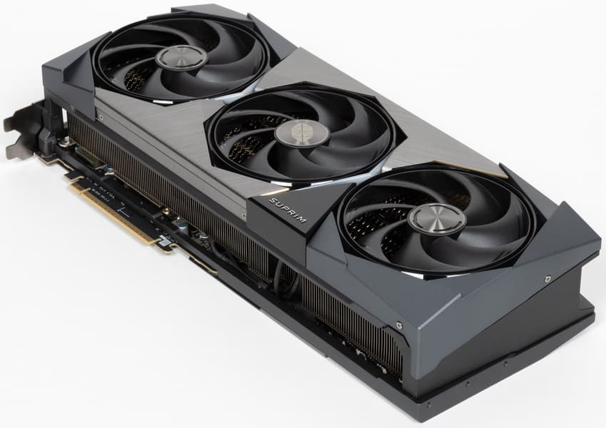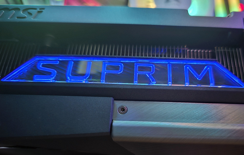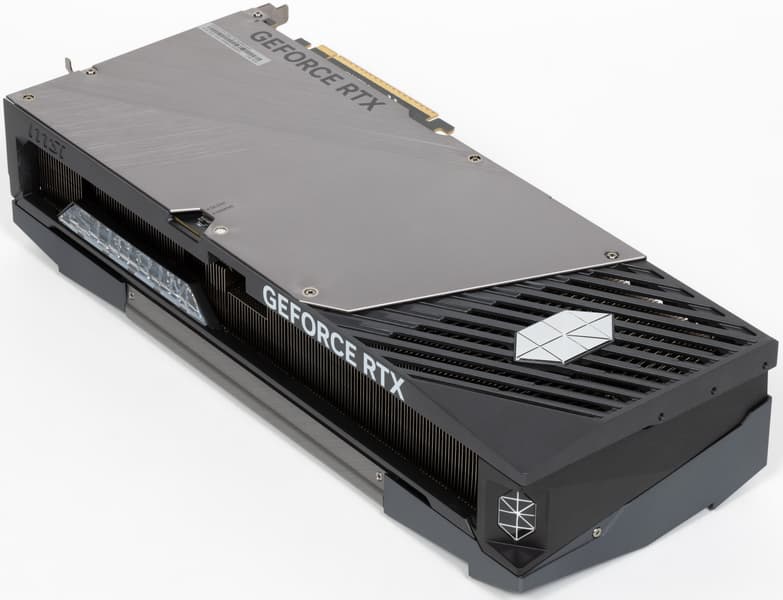 Карта способна потреблять до 364 Вт, а при разгоне — до 400 Вт. Система охлаждения крайне мощная, высокоэффективная и тихая (даже несмотря на то, что вентиляторы не останавливаются в режиме простоя). Из-за возможности поднять лимит потребления ручной разгон может обеспечить прирост скорости до 7,3% в разрешении 4K, однако карта и по умолчанию имеет значительно повышенные частоты работы, демонстрируя на 5% более высокую производительность, чем референсная. Карта MSI очень массивная и имеет большие размеры: 36 см в длину и 15 см в высоту, а по толщине занимает 4 слота в корпусе. Набор видеовыходов стандартный: 3 DP 2.1b и 1 HDMI 2.1b. Карта обладает стильной и красивой подсветкой, которую можно синхронизировать с материнскими платами MSI через приложение MSI Center.
