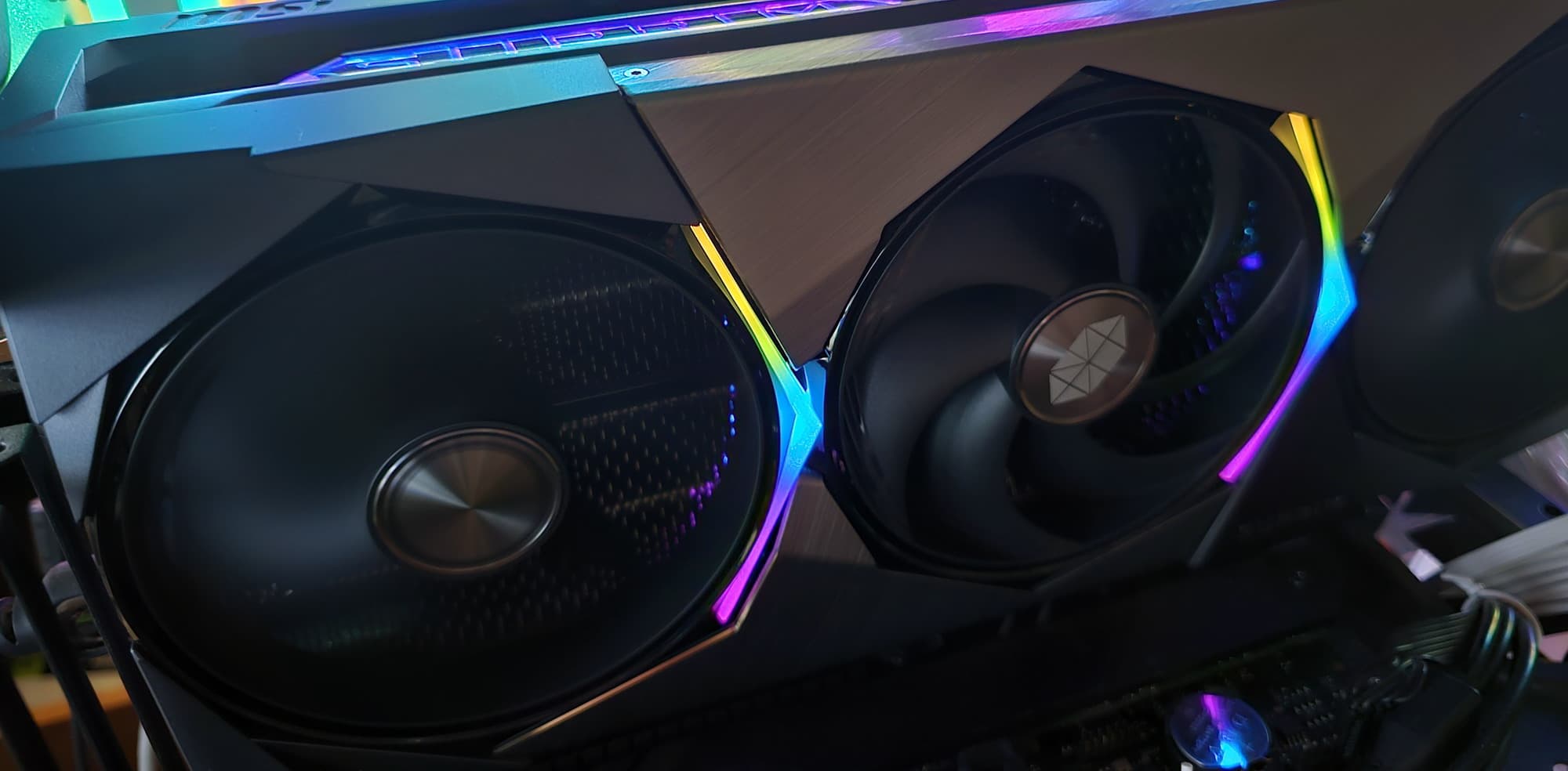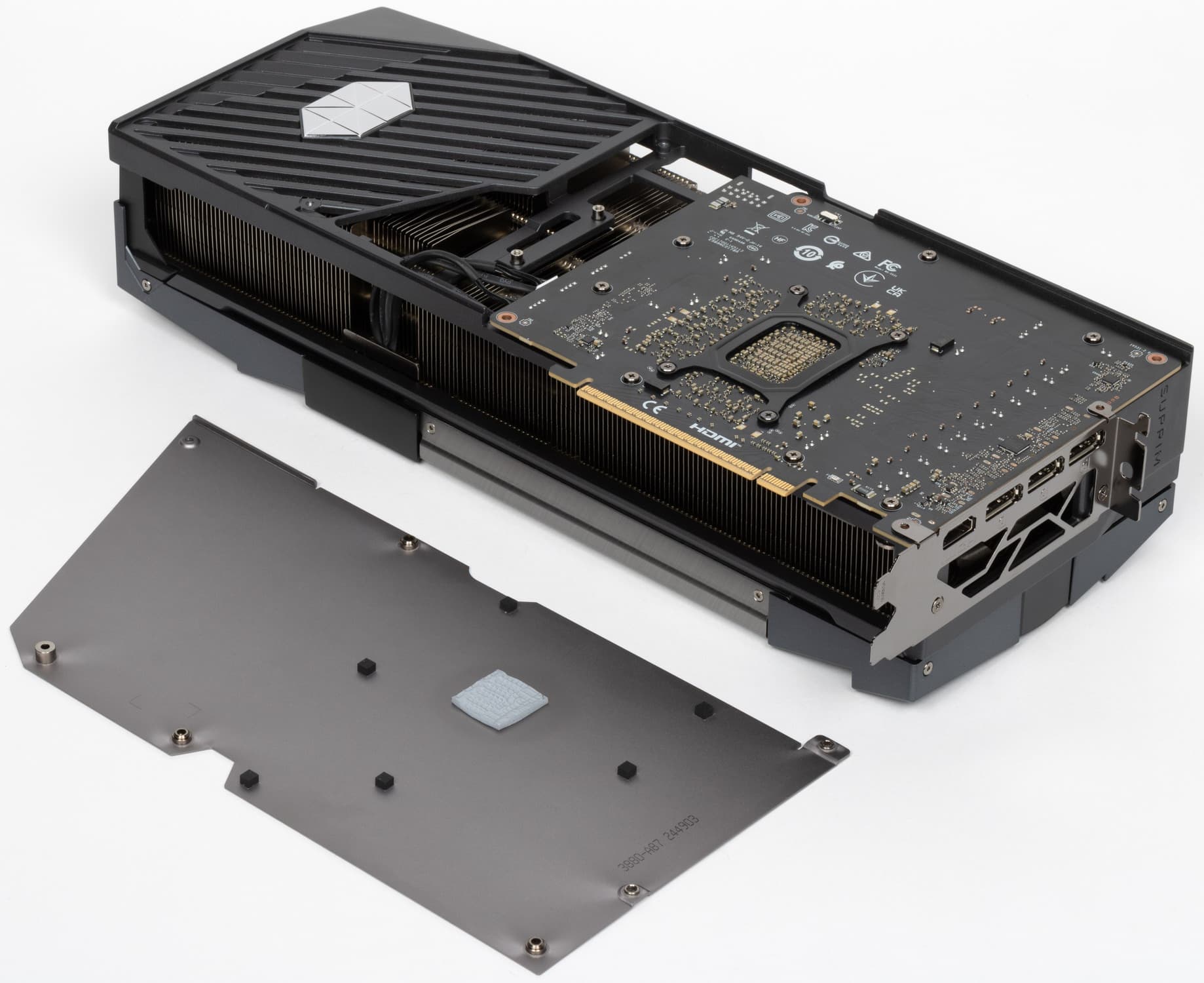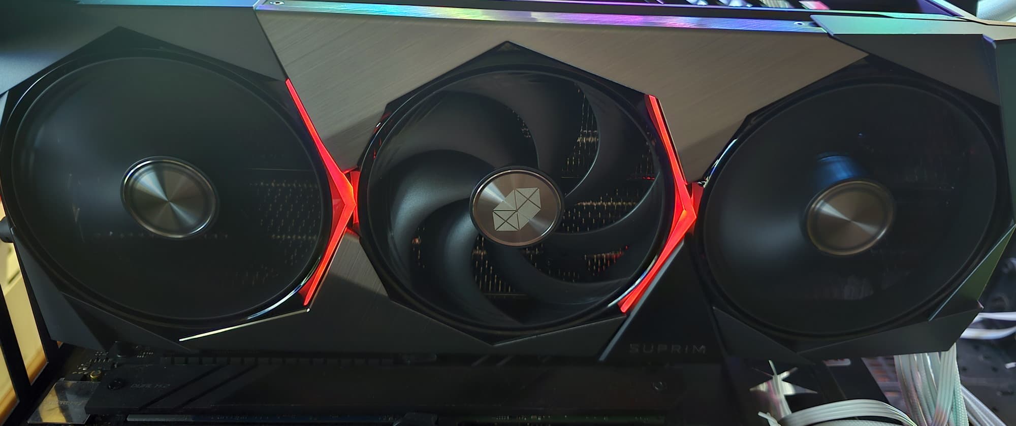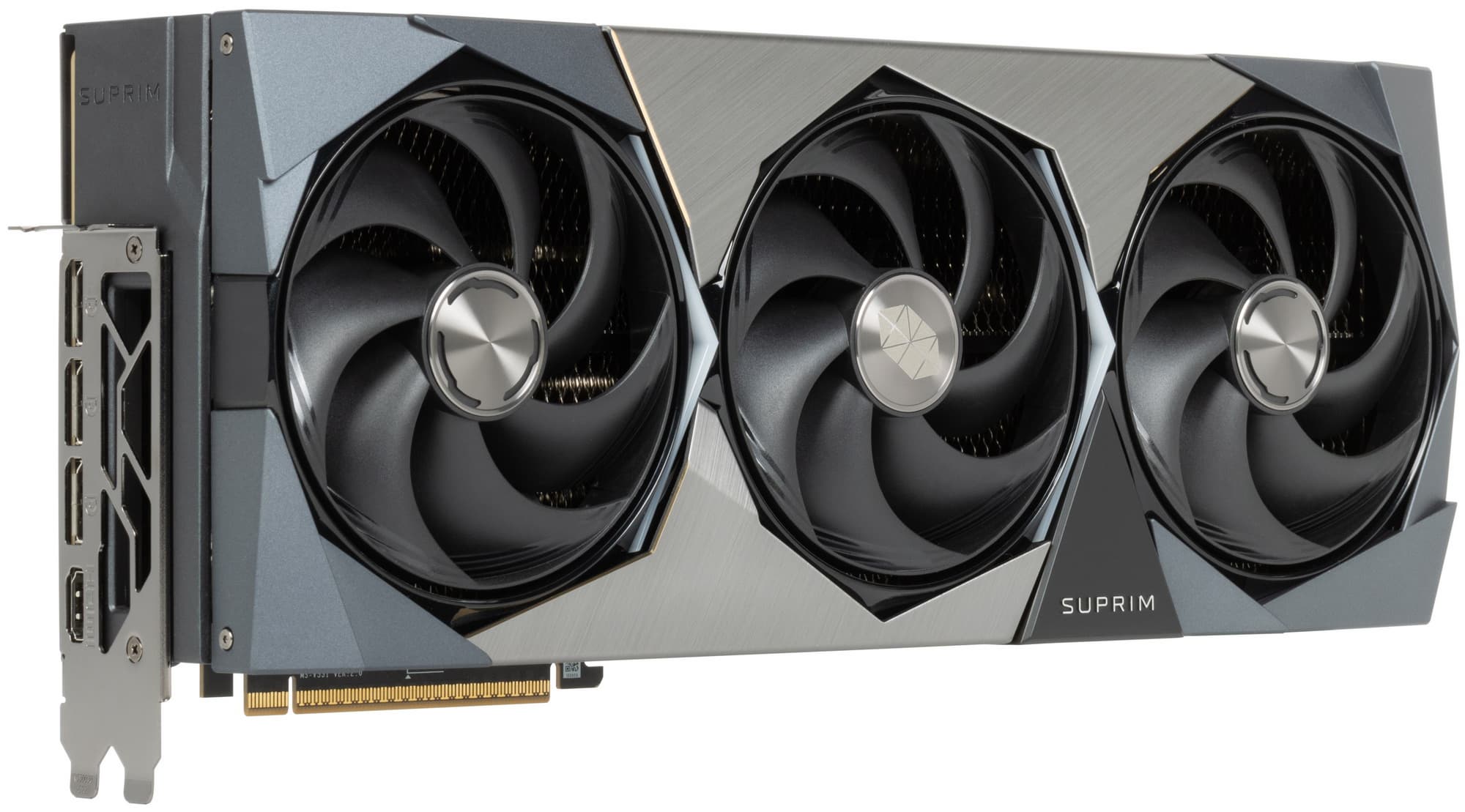 Карта способна потреблять до 364 Вт, а при разгоне — до 400 Вт. Система охлаждения крайне мощная, высокоэффективная и тихая (даже несмотря на то, что вентиляторы не останавливаются в режиме простоя). Из-за возможности поднять лимит потребления ручной разгон может обеспечить прирост скорости до 7,3% в разрешении 4K, однако карта и по умолчанию имеет значительно повышенные частоты работы, демонстрируя на 5% более высокую производительность, чем референсная. Карта MSI очень массивная и имеет большие размеры: 36 см в длину и 15 см в высоту, а по толщине занимает 4 слота в корпусе. Набор видеовыходов стандартный: 3 DP 2.1b и 1 HDMI 2.1b. Карта обладает стильной и красивой подсветкой, которую можно синхронизировать с материнскими платами MSI через приложение MSI Center.