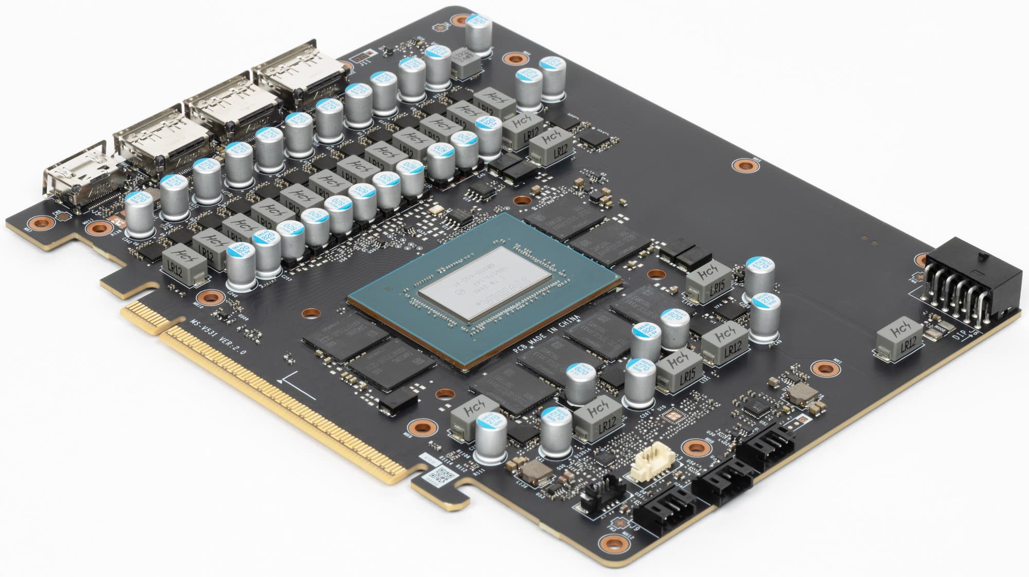 Очевидно, что платы отличаются, но не кардинально. Не претерпела изменений лишь область GPU+VRAM. PCB у карты Palit значительно выше, но при этом более узкая, и на ней смогли разместиться в одну линию 14 фаз питания. На PCB карты MSI в одну линию уместилось лишь 12 фаз (в целом у этой карты фаз питания больше, чем у карты Palit). Разумеется, на форму печатных плат повлияли системы охлаждения.