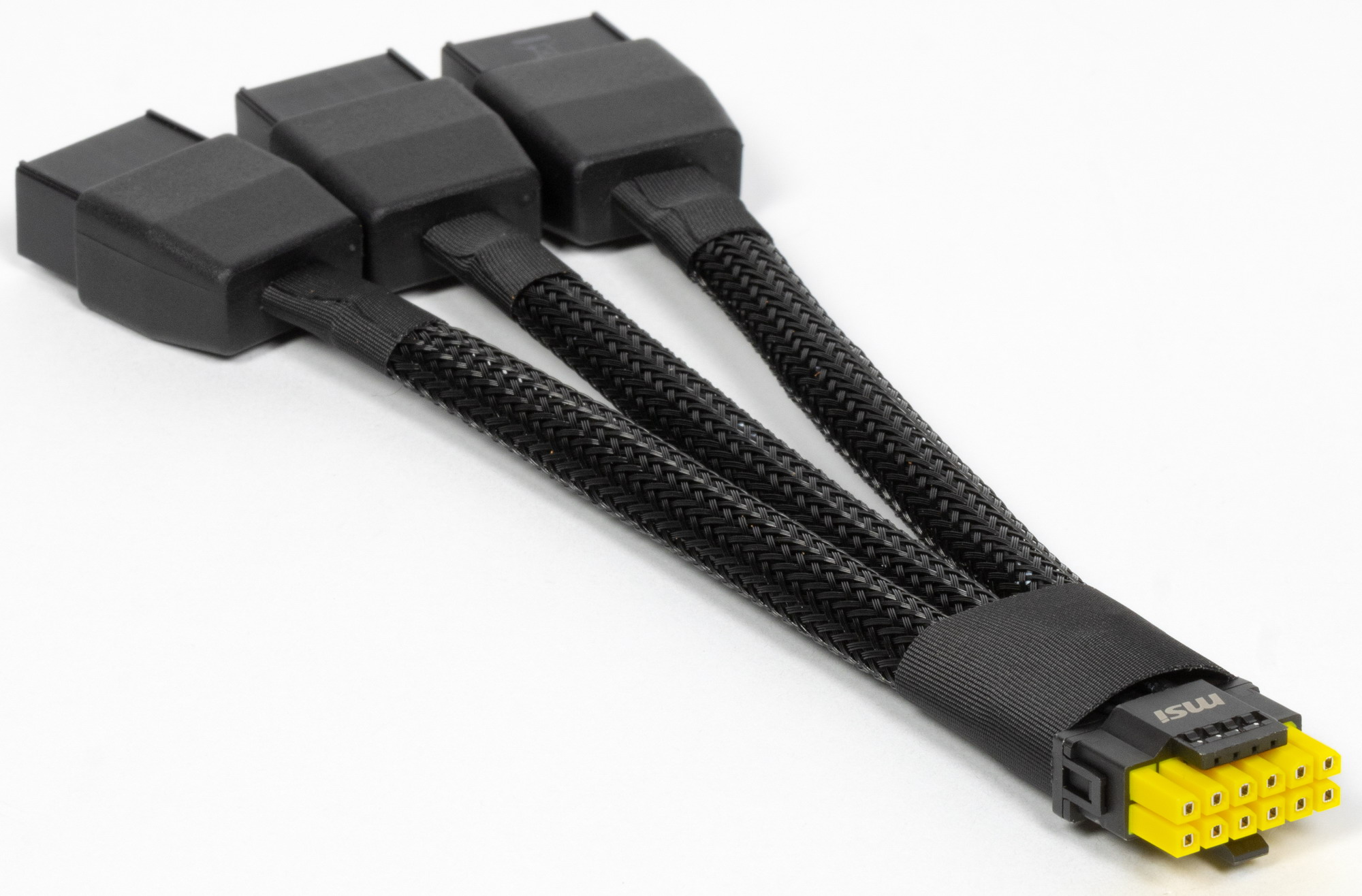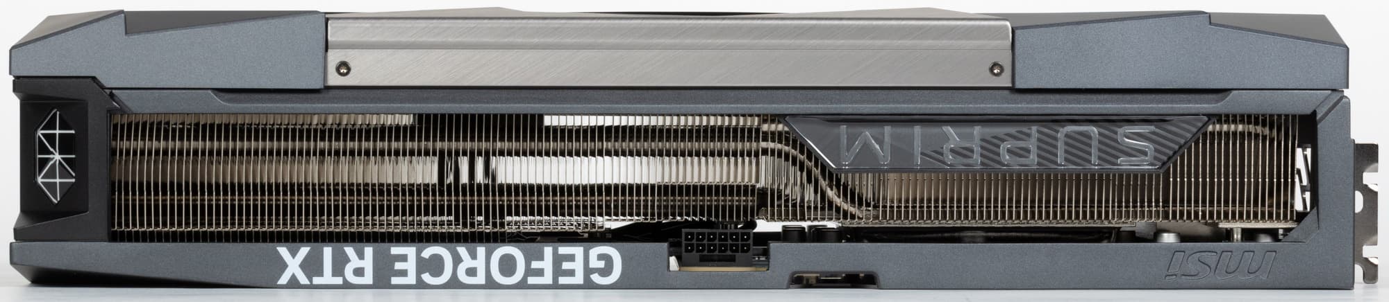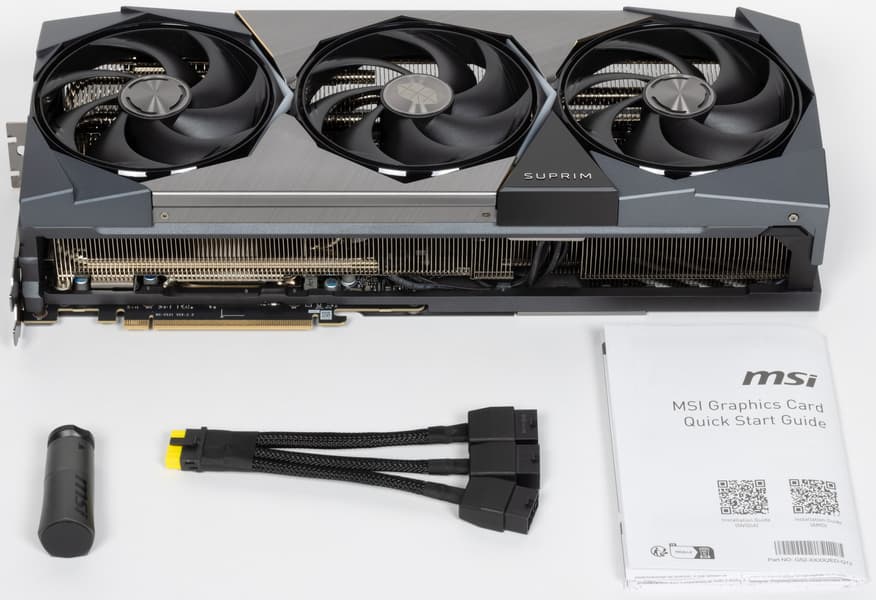 Карта MSI имеет 16-контактный разъем питания версии PCIe 5.0. Хотя в комплекте поставки имеется адаптер-переходник для подключения разъемов питания типа PCIe 2.0 (с 3 таких разъемов), лучше всё же использовать блоки питания стандарта ATX 3.0 с полноценной поддержкой питания PCIe 5.0 (с кабелем 12VHPWR). Имеющийся же переходник питания ни в коем случае нельзя изгибать непосредственно после 16-контактного разъема.