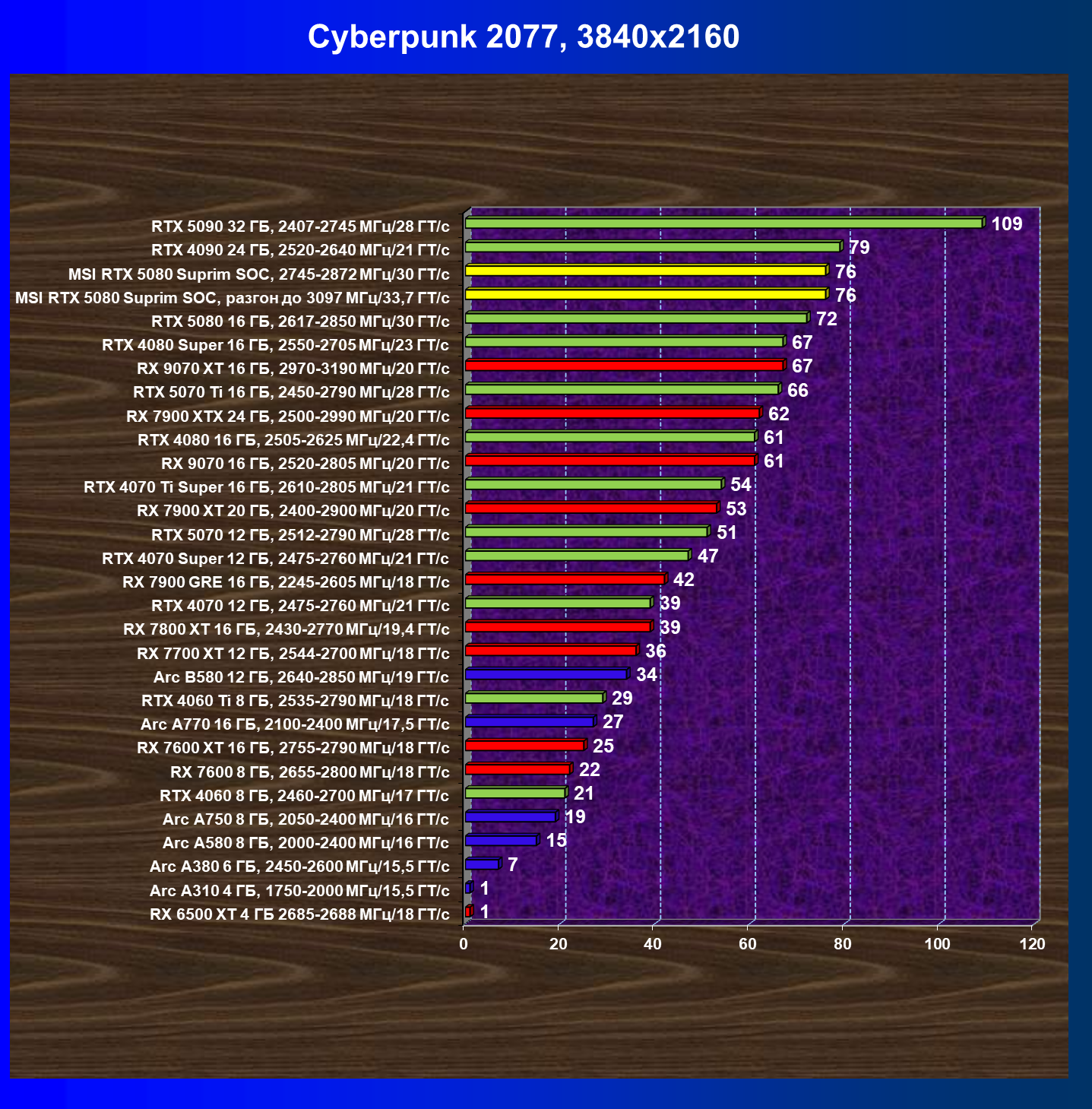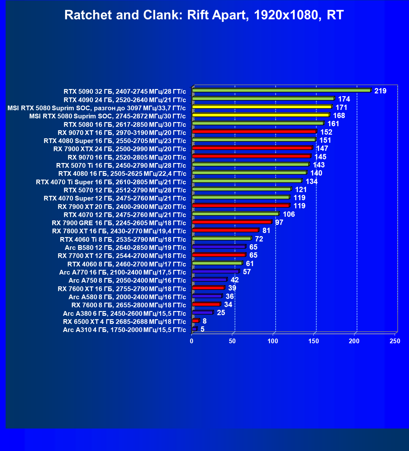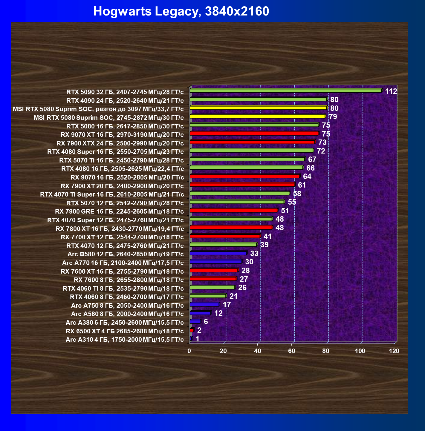| 26 | MSI RTX 5080 Suprim SOC, 2745—2872 МГц/30 ГТ/с | 300 | 5245 | 175 000 |