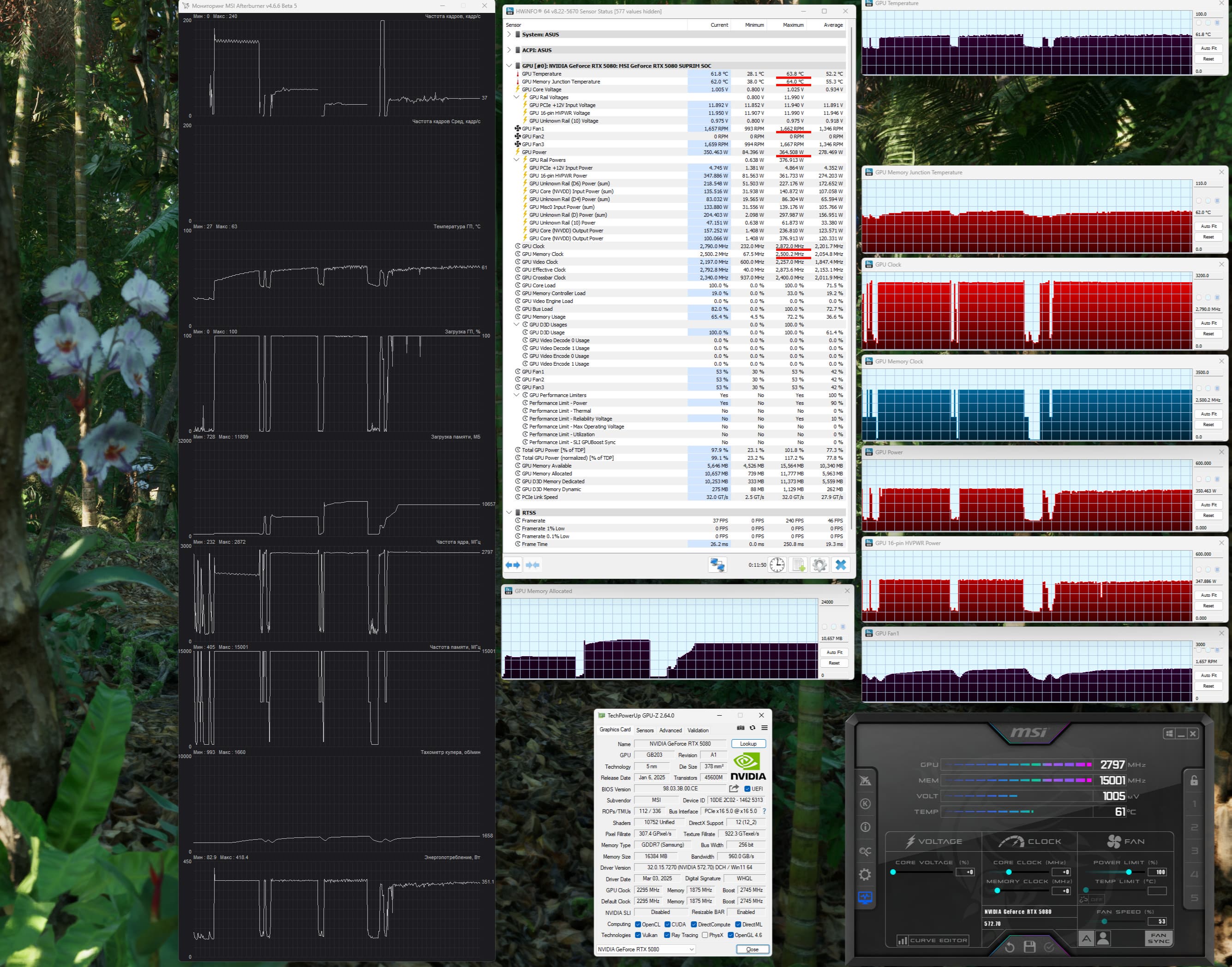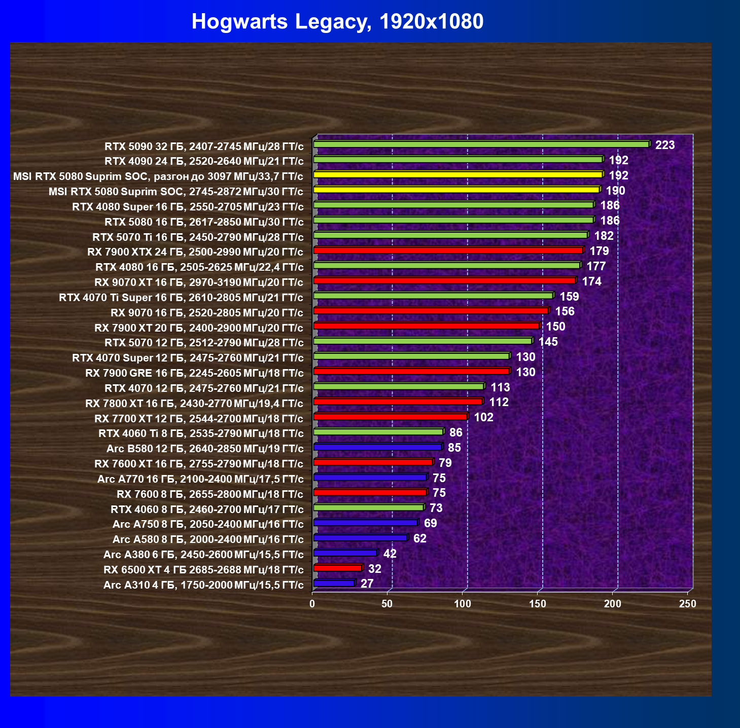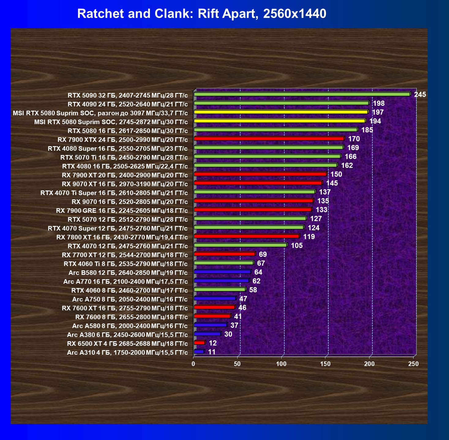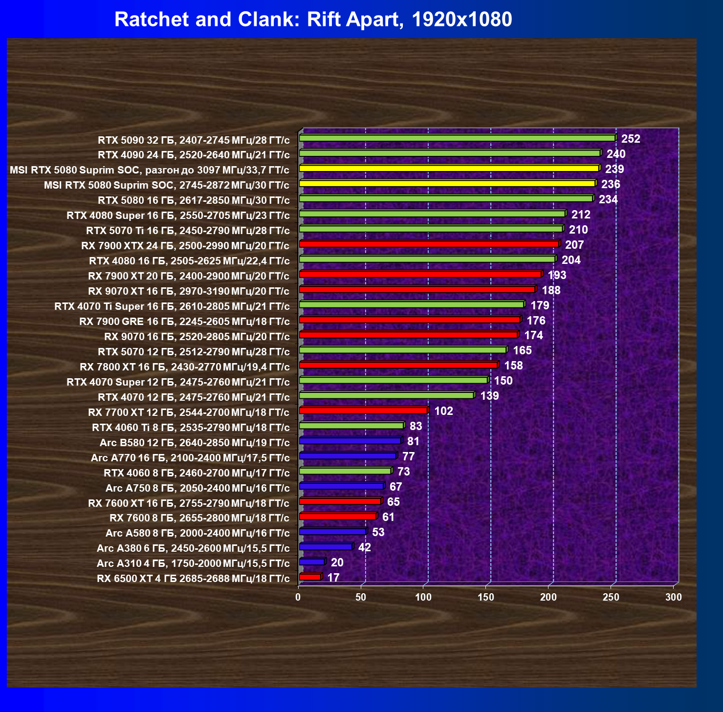 | 26 | MSI RTX 5080 Suprim SOC, 2745—2872 МГц/30 ГТ/с | 300 | 5245 | 175 000 |