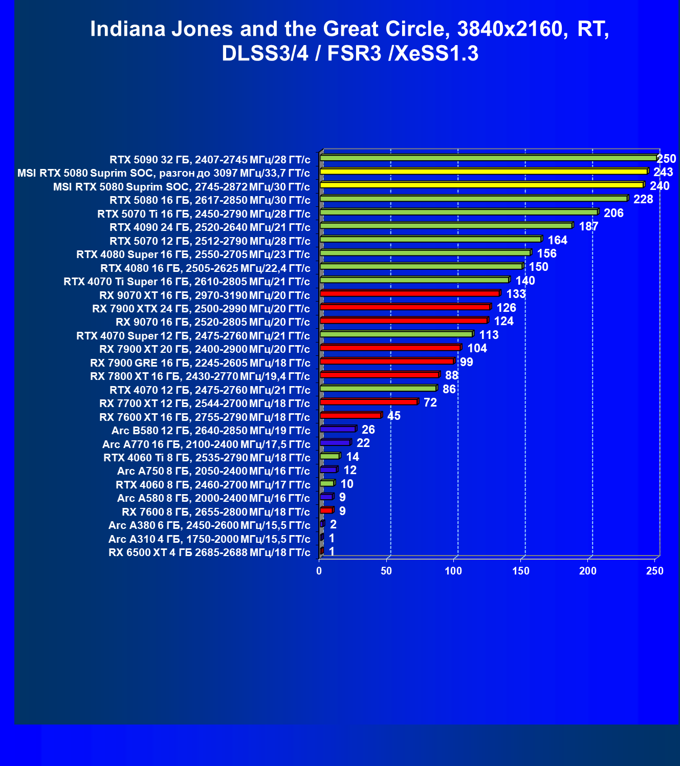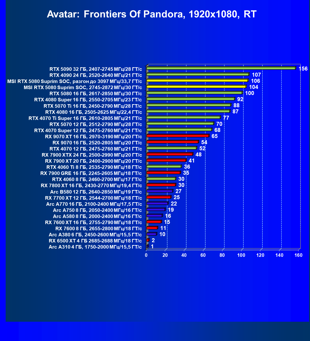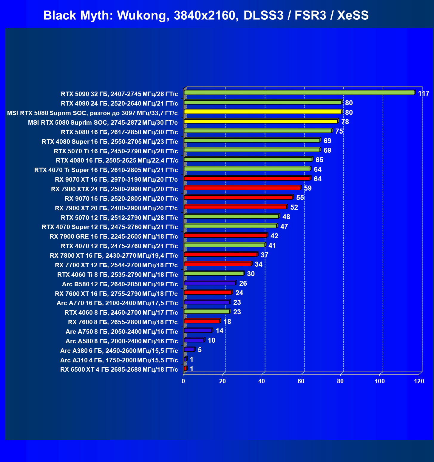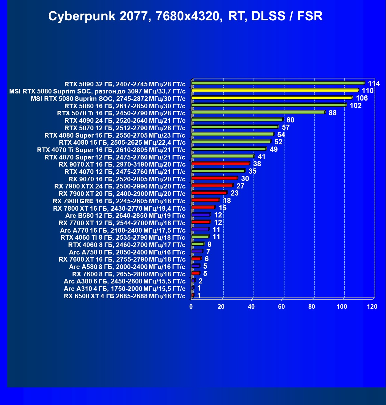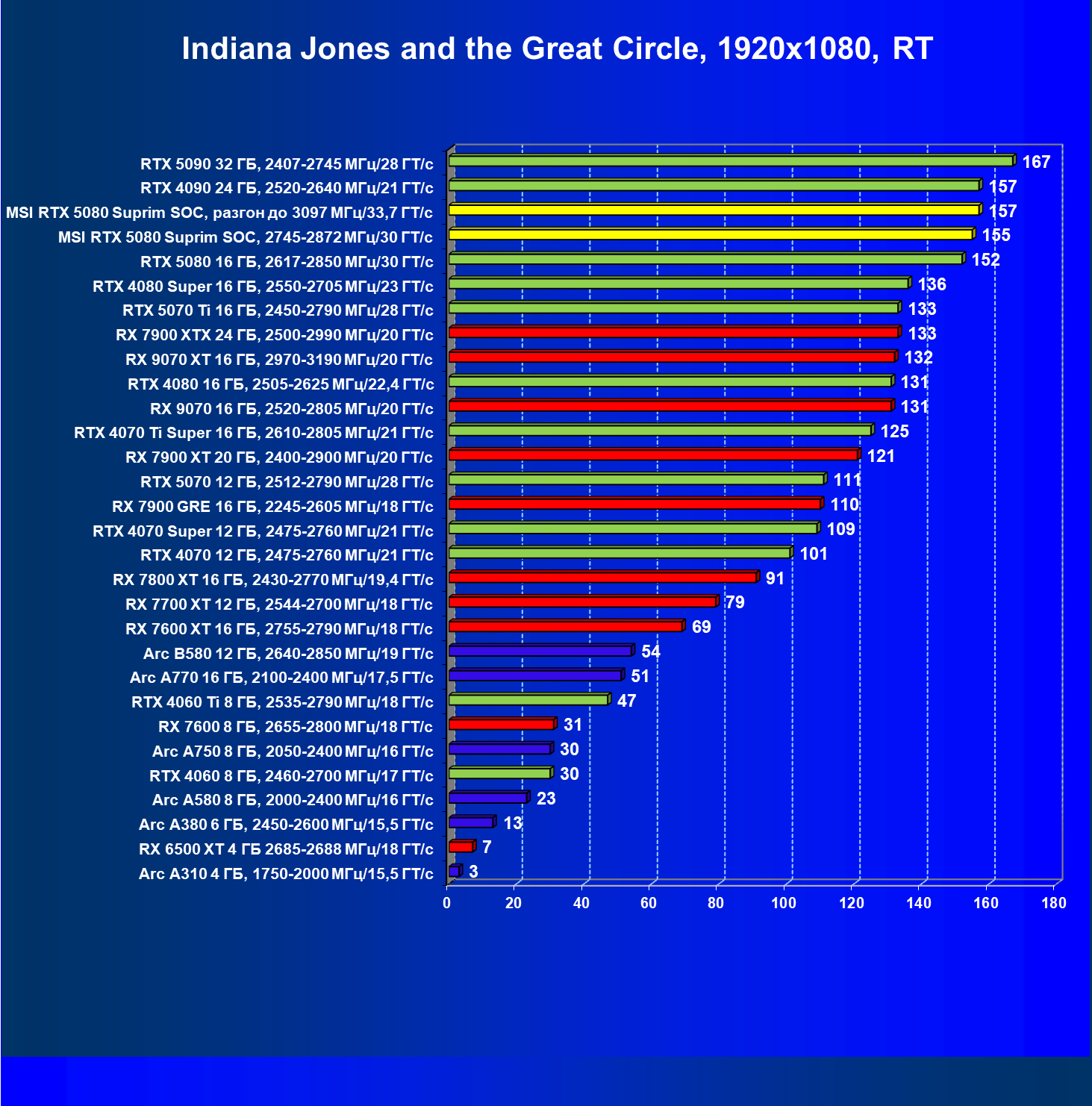 | 03 | MSI RTX 5080 Suprim SOC, разгон до 3097 МГц/33,7 ГТ/с | 5348 | 306 | 175 000 |