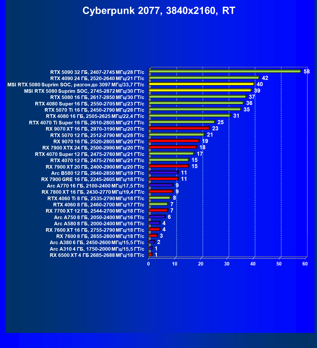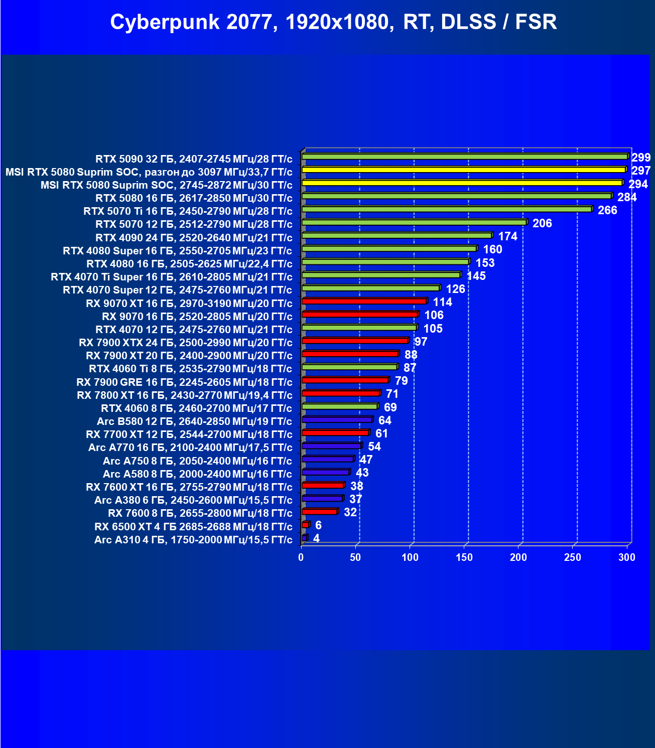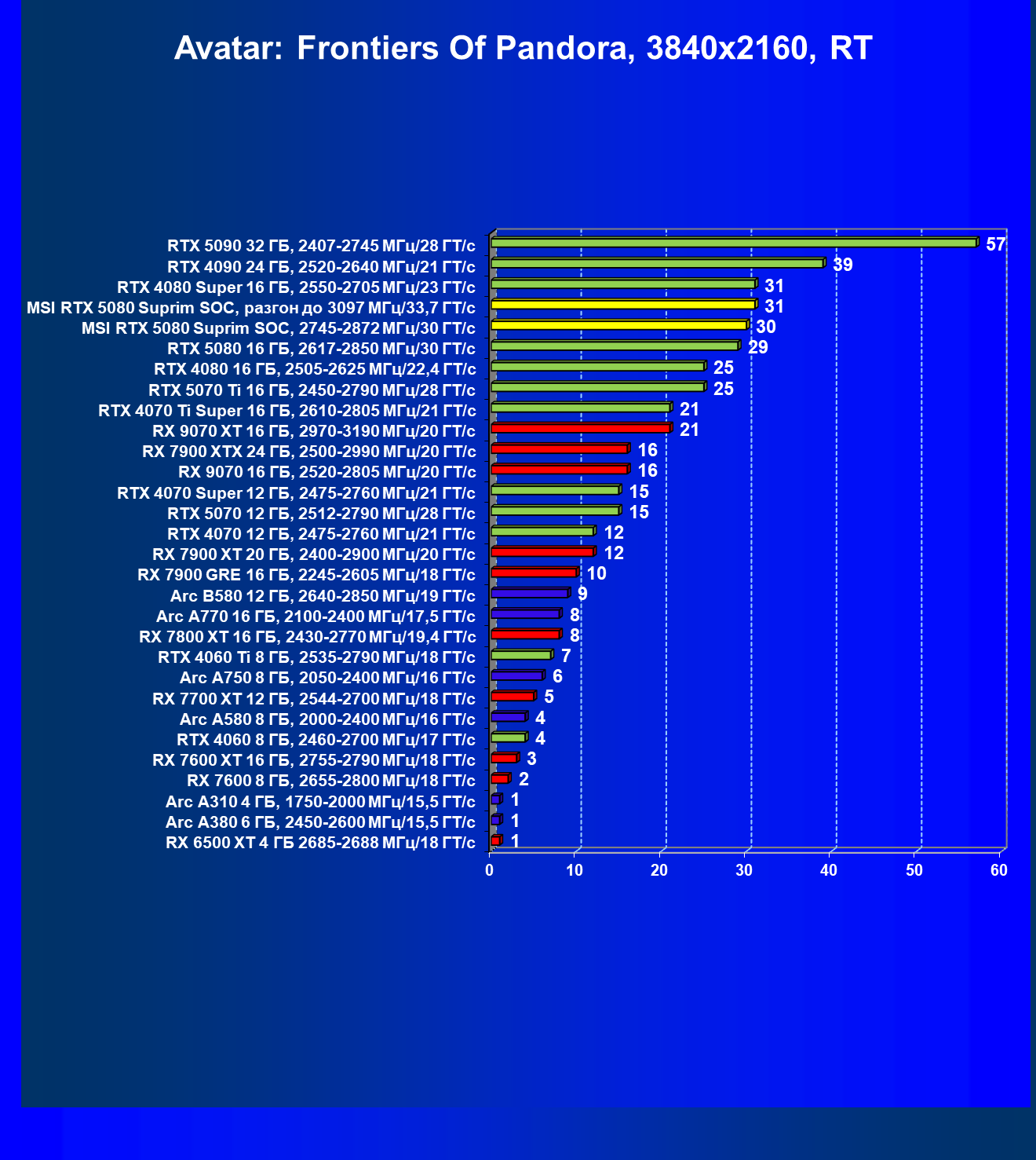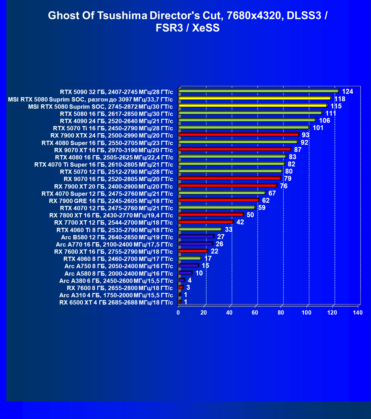 | 03 | MSI RTX 5080 Suprim SOC, разгон до 3097 МГц/33,7 ГТ/с | 5348 | 306 | 175 000 |