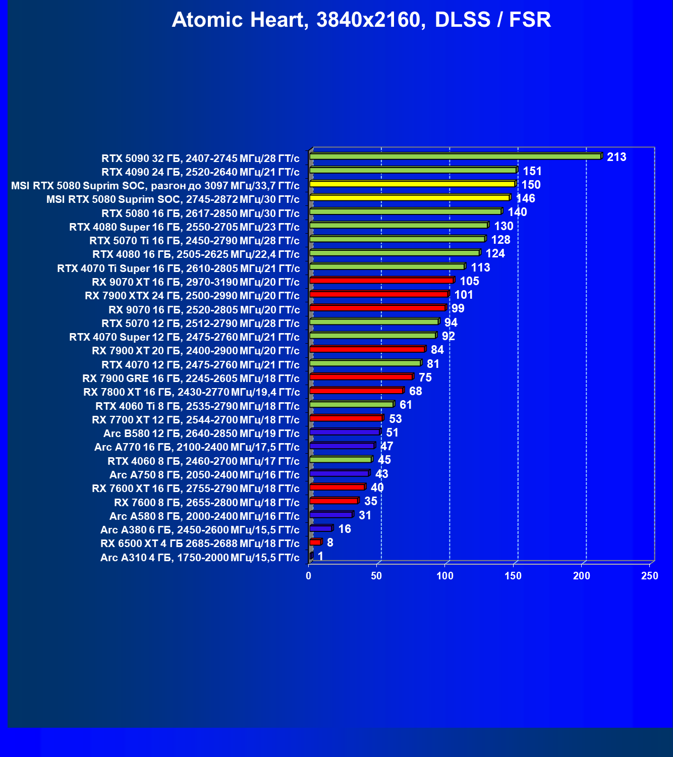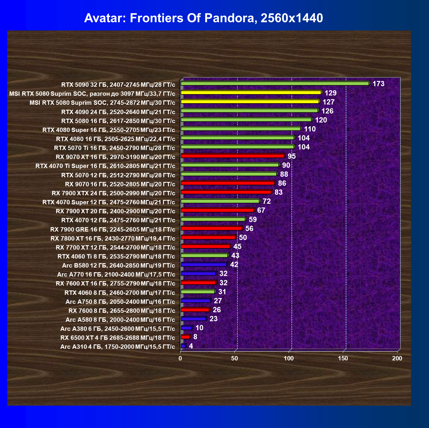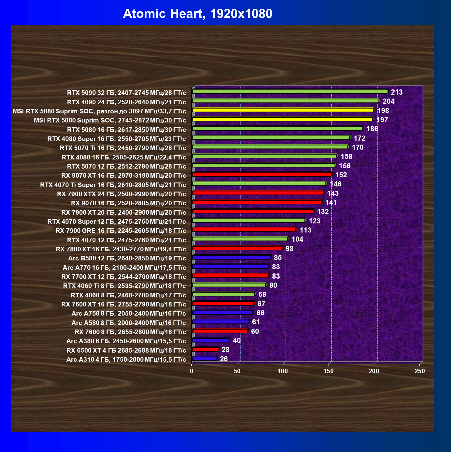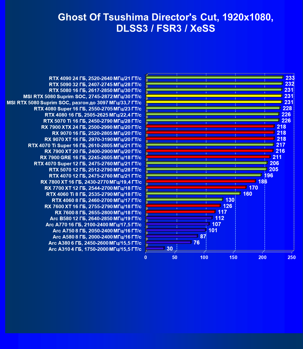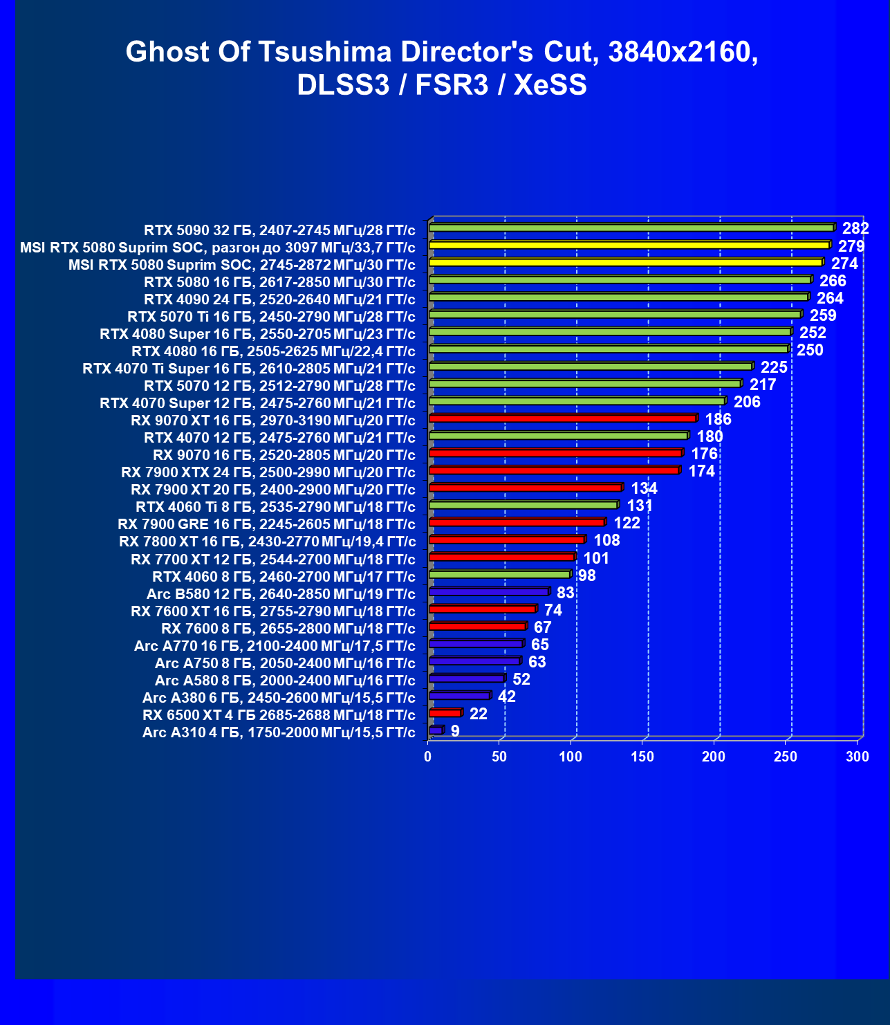 | 03 | MSI RTX 5080 Suprim SOC, разгон до 3097 МГц/33,7 ГТ/с | 5348 | 306 | 175 000 |