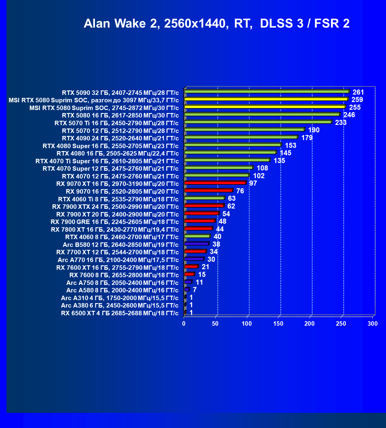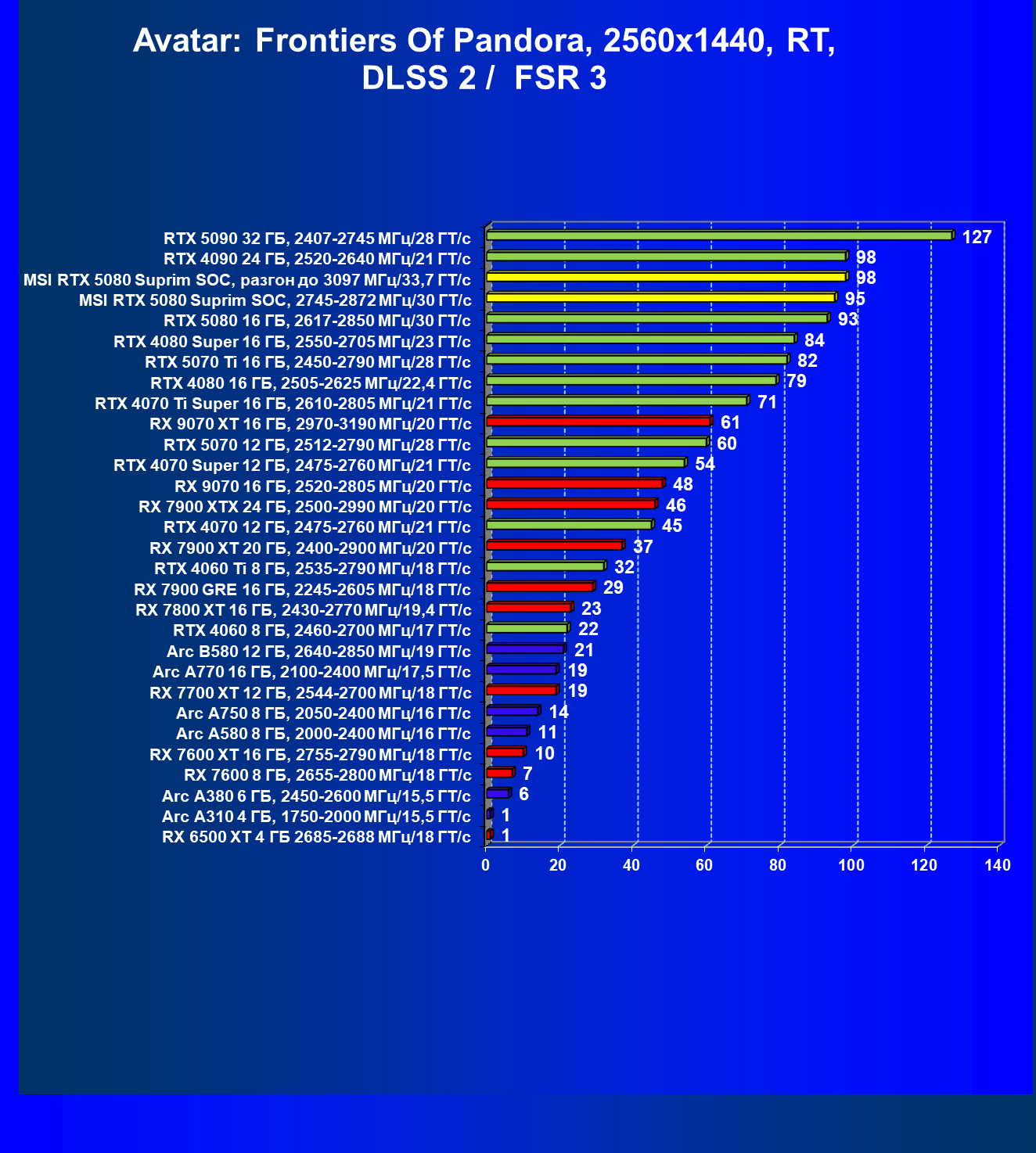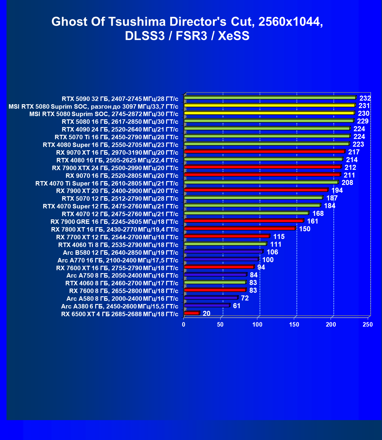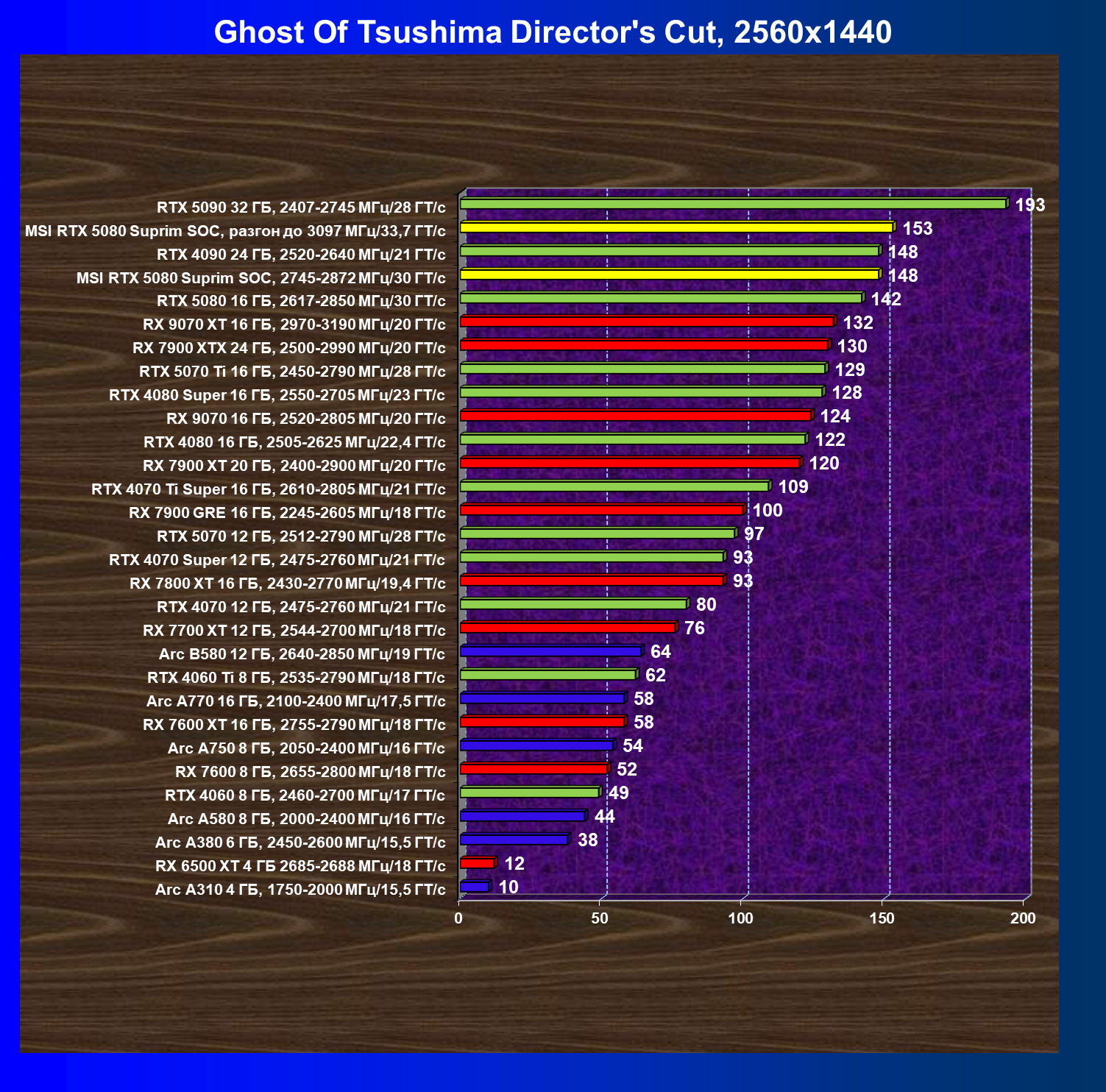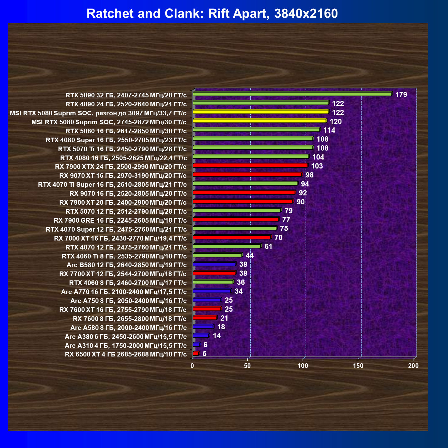 | 03 | MSI RTX 5080 Suprim SOC, разгон до 3097 МГц/33,7 ГТ/с | 5348 | 306 | 175 000 |