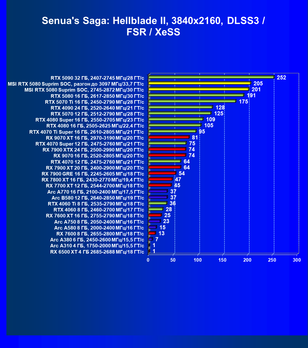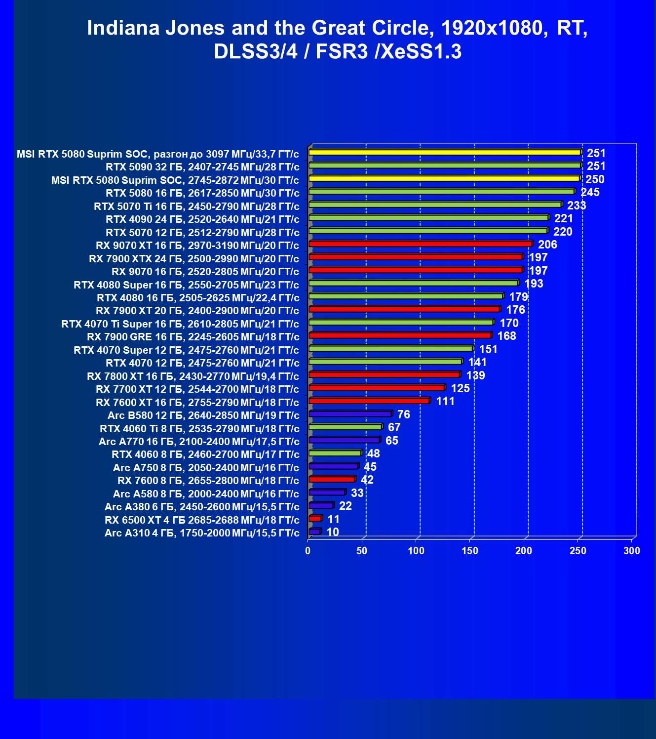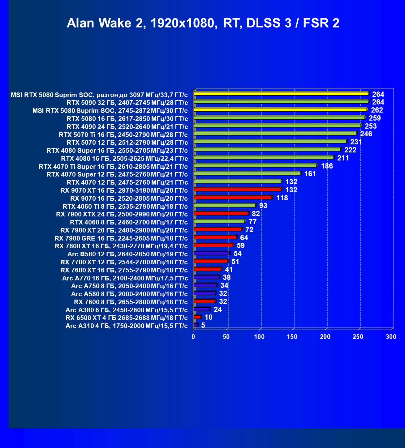 | 25 | MSI RTX 5080 Suprim SOC, разгон до 3097 МГц/33,7 ГТ/с | 306 | 5348 | 175 000 |