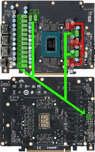 Зеленым цветом отмечена схема питания ядра, красным — памяти.