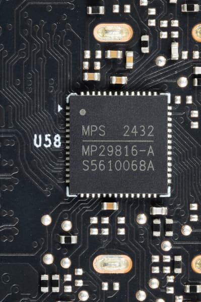 16 фазами питания ядра управляет ШИМ-контроллер MP29816 (Monolithic Power Systems). Он рассчитан максимум на 16 фаз и расположен на тыльной стороне платы.