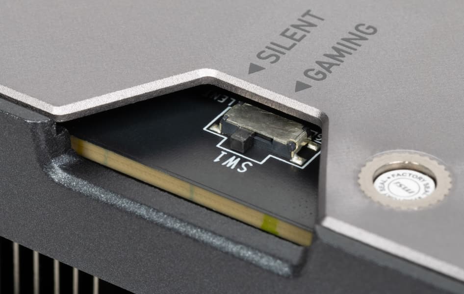 Карта имеет два режима работы, они заложены в двух вариантах BIOS, которые переключаются с помощью переключателя на переднем торце карты: G (Gaming / производительный) и S (silent / тихий). Разница между режимами заключается в настройке работы вентиляторов. Предел энергопотребления в обоих случае BIOS по умолчанию составляет 360 Вт, но его можно поднять вручную на 11% до 400 Вт.