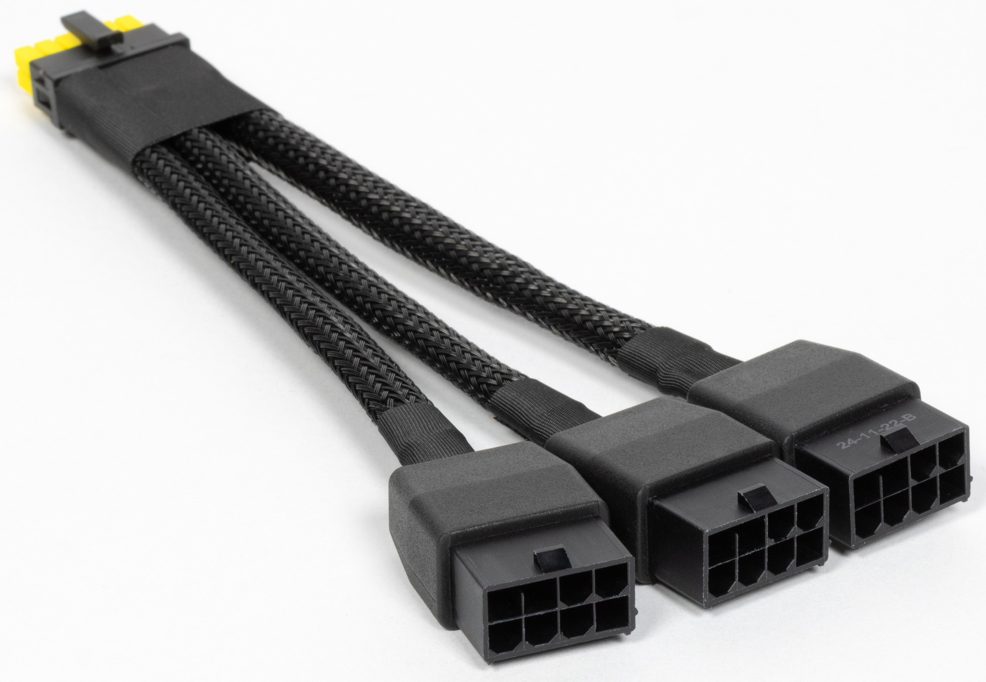 В комплекте поставки карты имеется переходник на такой разъем с трех обычных 8-контактных. Особо отметим желтую окраску самого разъема, что дает пользователю понять: до конца вставлен переходник или нет (желтого цвета не должно быть видно в случае правильного подключения питания).